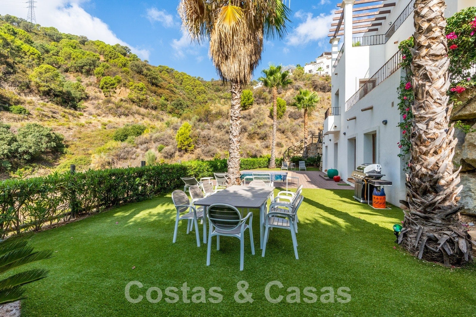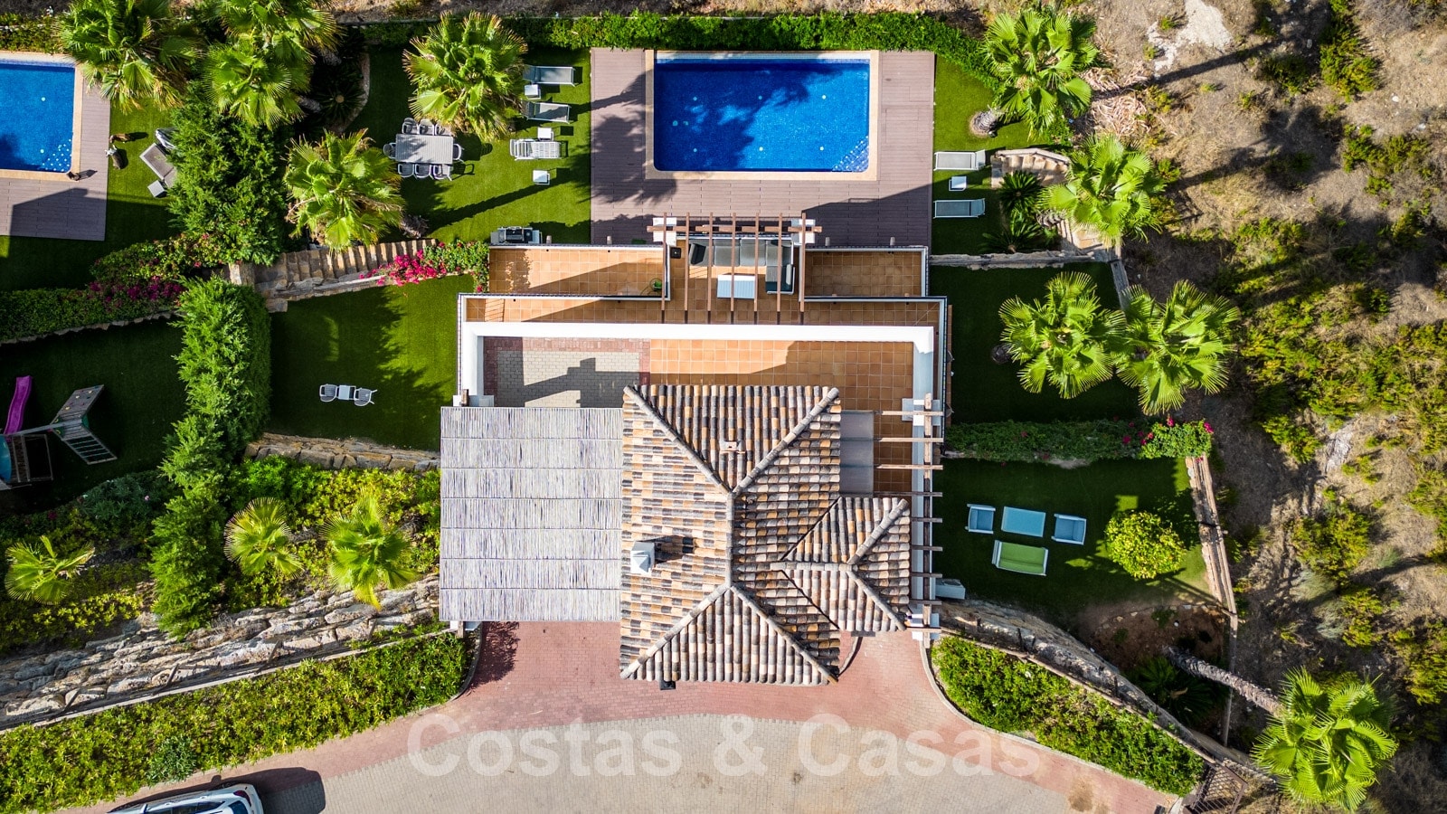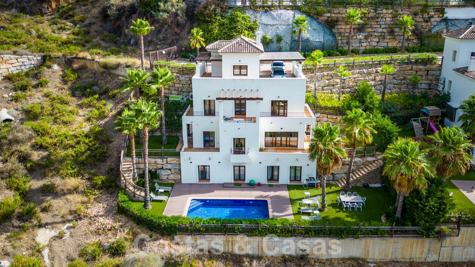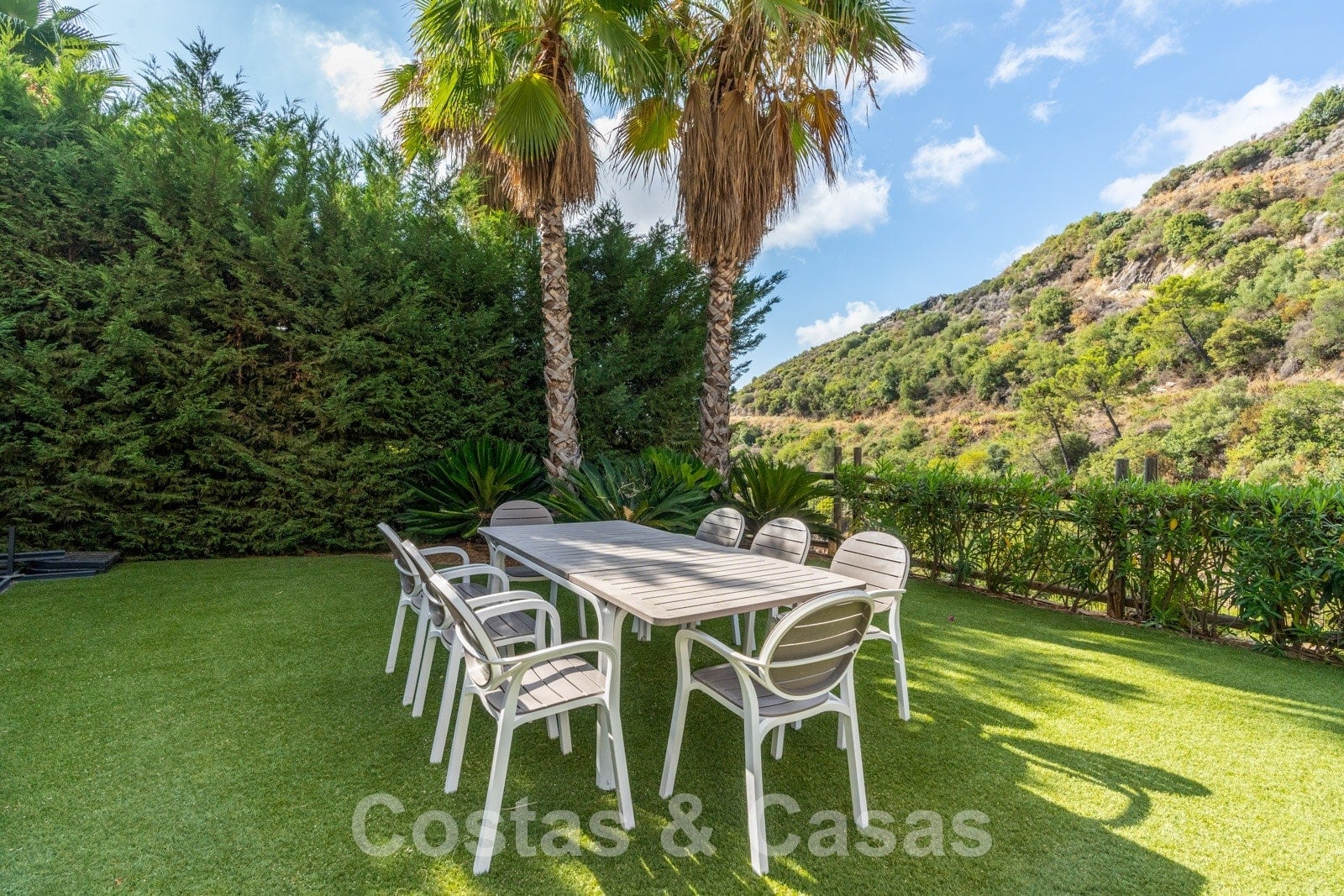 La parcela está dividida en 4 niveles conectados por una escalera ajardinada. Cada escalera está provista de vegetación madura que incluye césped, palmeras y arbustos cuidados. Orientada de sur a suroeste con vistas al valle.