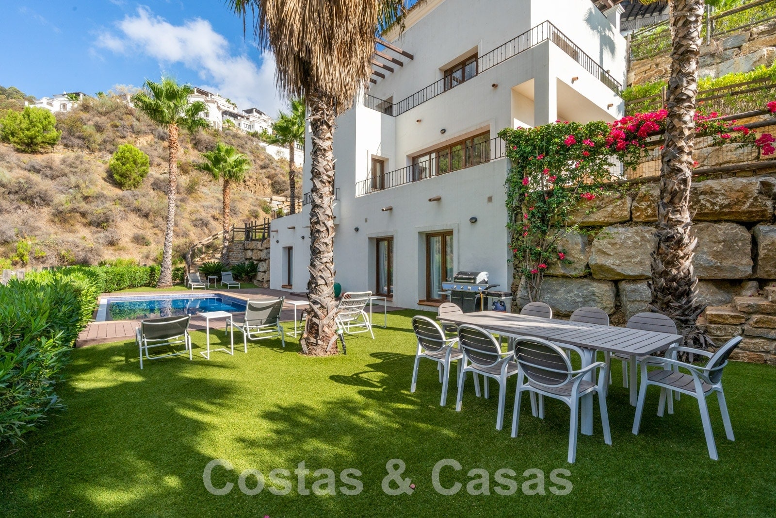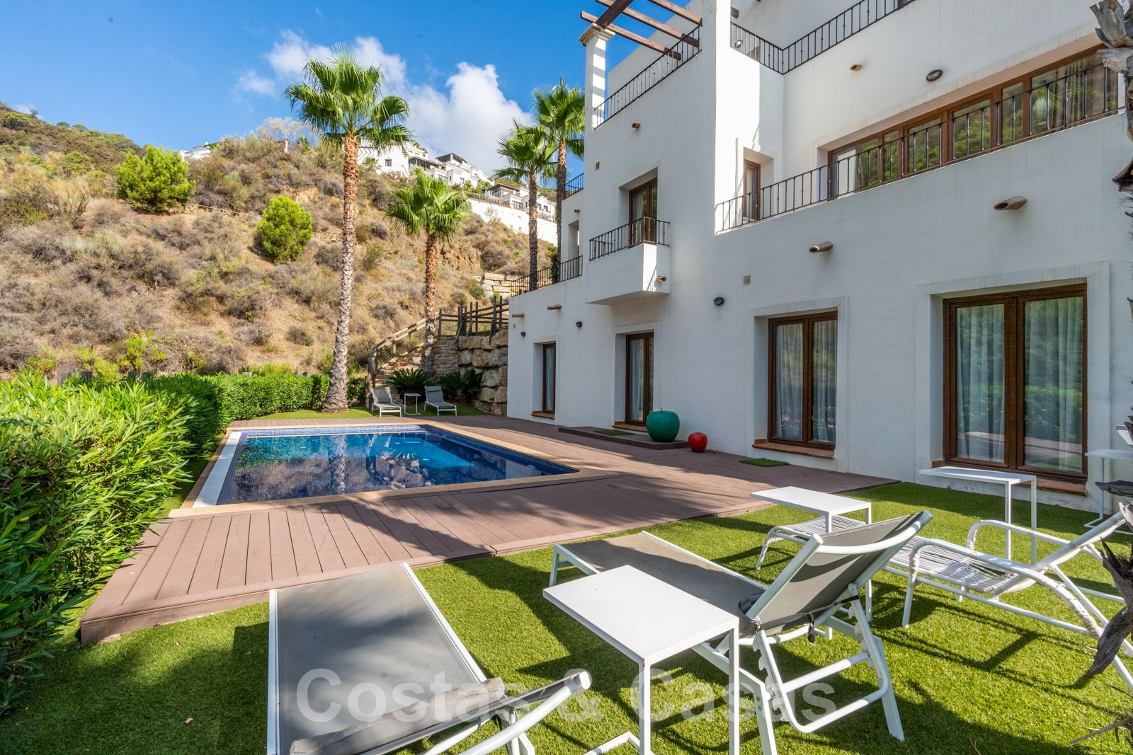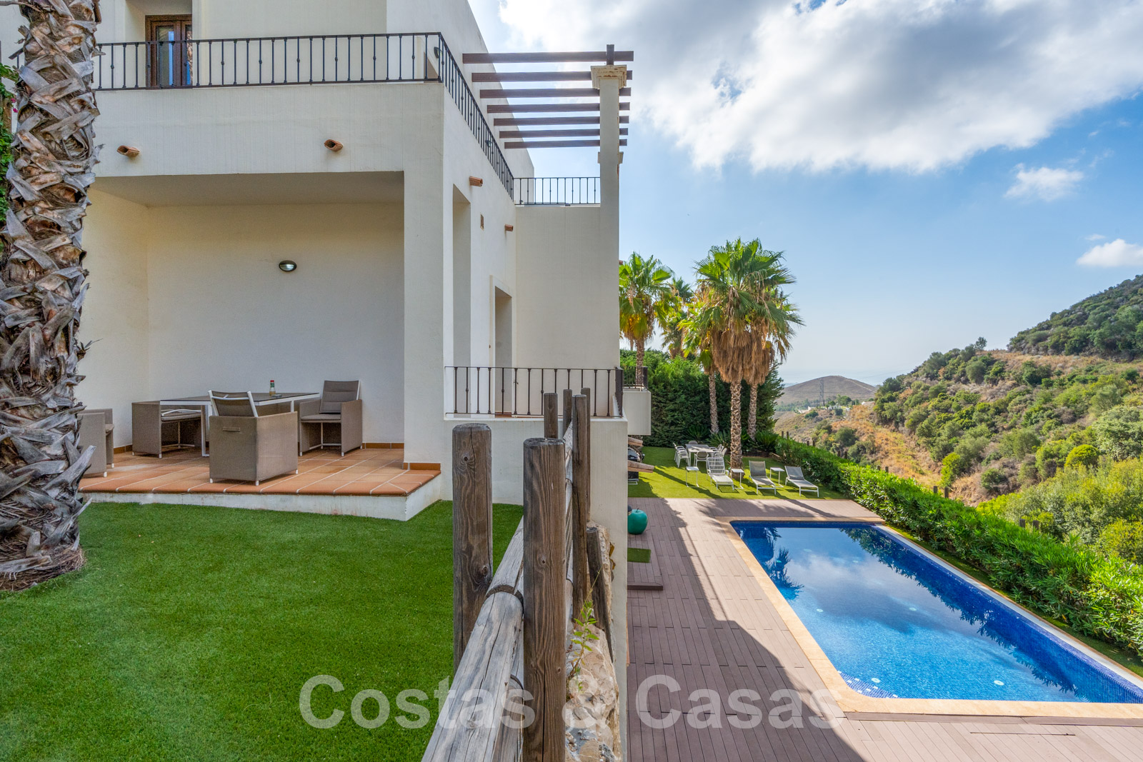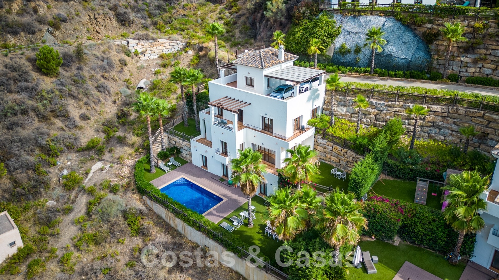 La parcela está dividida en 4 niveles conectados por una escalera ajardinada. Cada escalera está provista de vegetación madura que incluye césped, palmeras y arbustos cuidados. Orientada de sur a suroeste con vistas al valle.