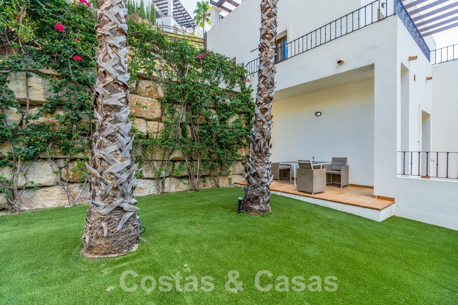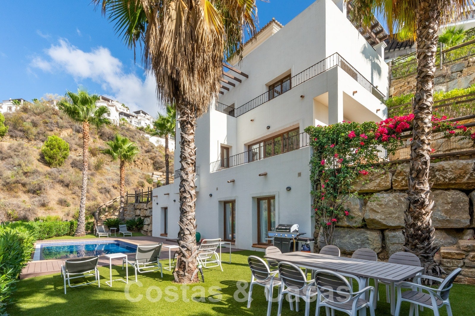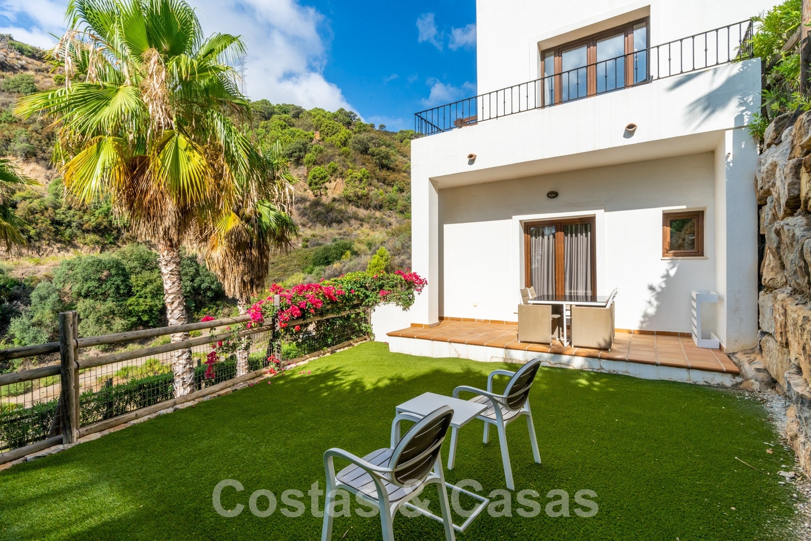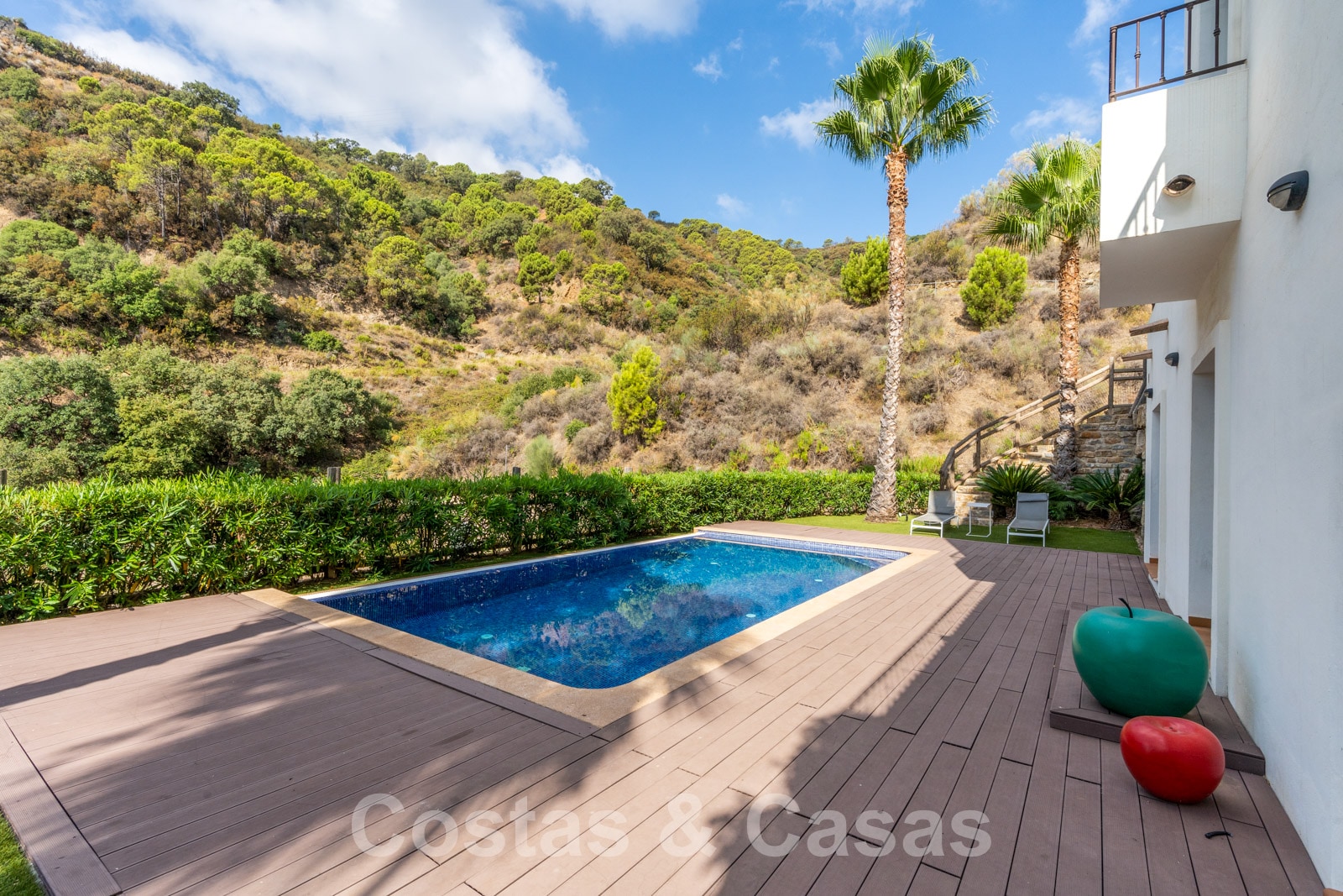 La parcela está dividida en 4 niveles conectados por una escalera ajardinada. Cada escalera está provista de vegetación madura que incluye césped, palmeras y arbustos cuidados. Orientada de sur a suroeste con vistas al valle.
