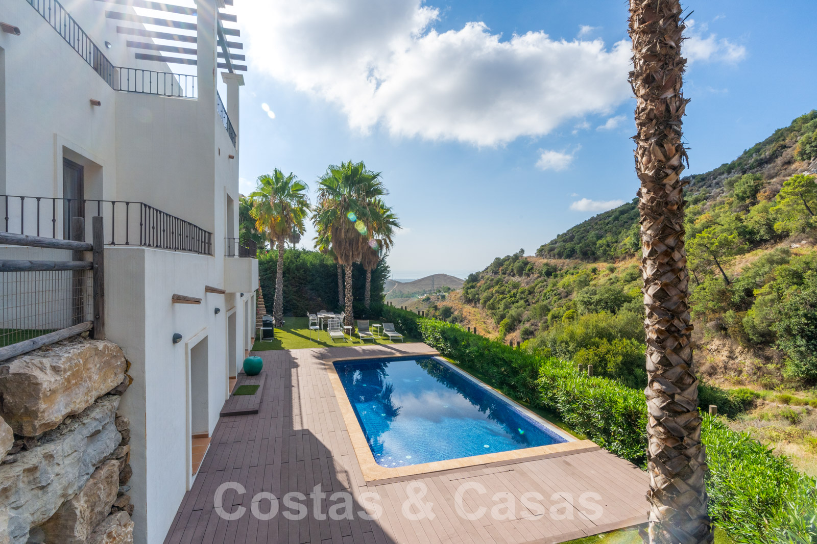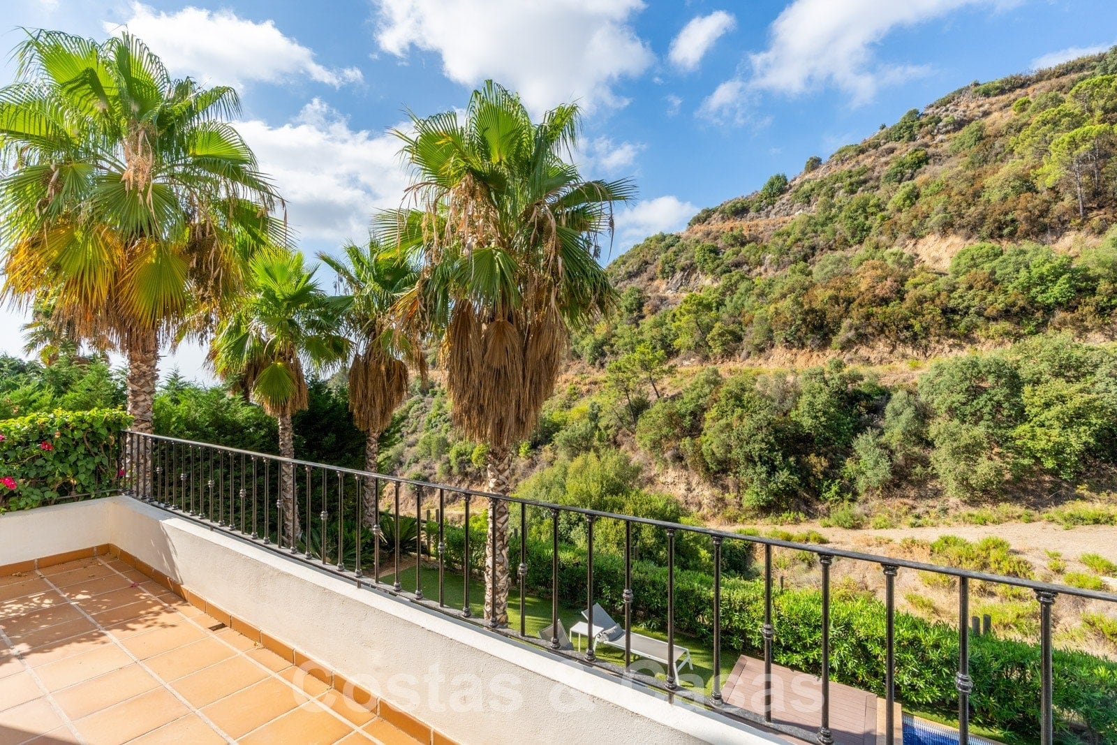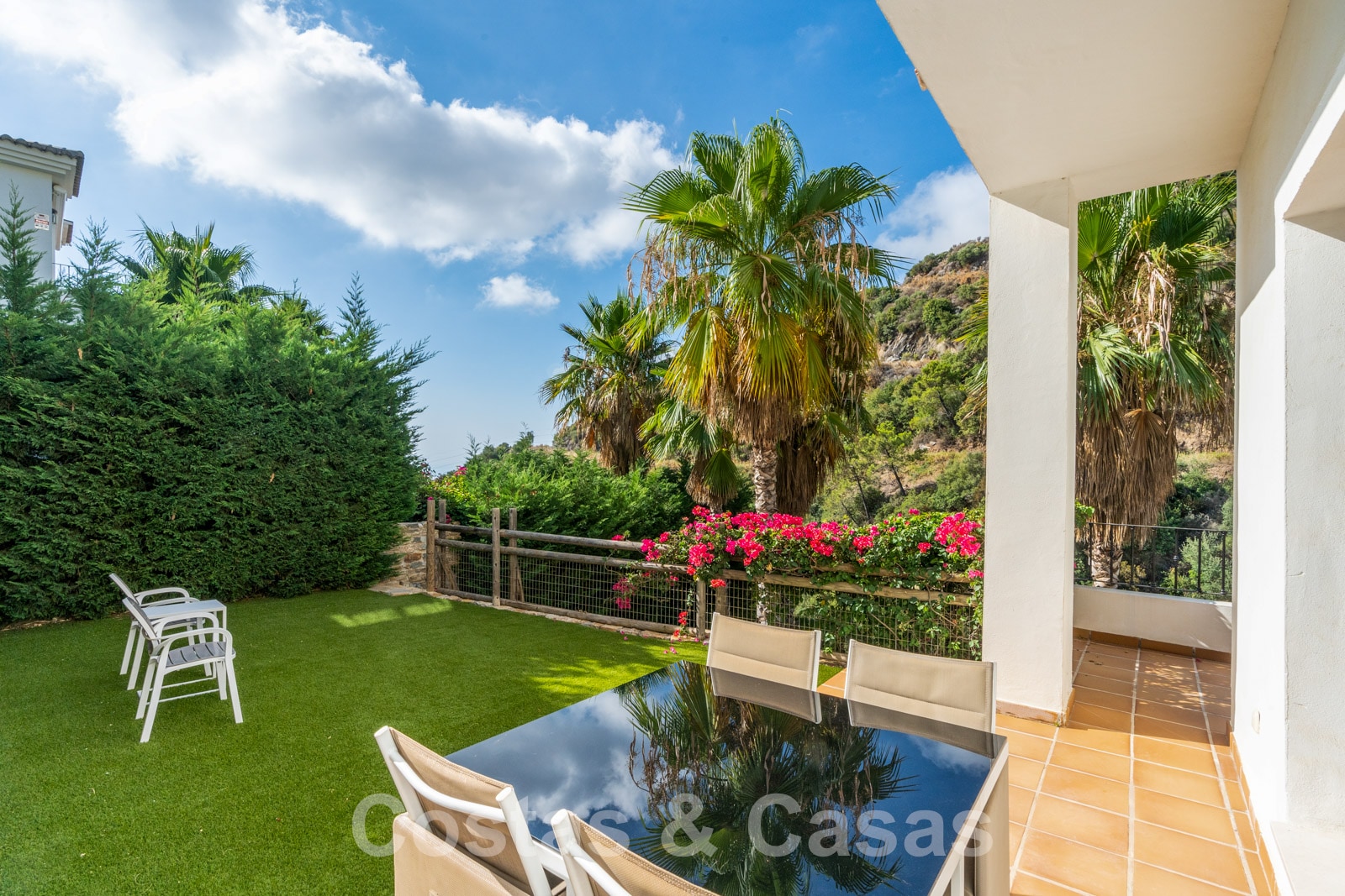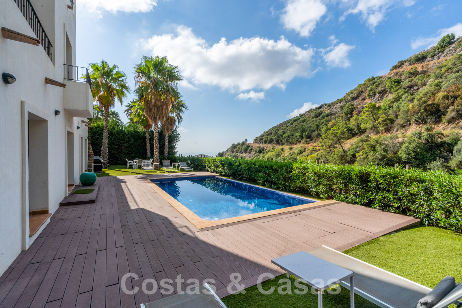La parcela está dividida en 4 niveles conectados por una escalera ajardinada. Cada escalera está provista de vegetación madura que incluye césped, palmeras y arbustos cuidados. Orientada de sur a suroeste con vistas al valle.