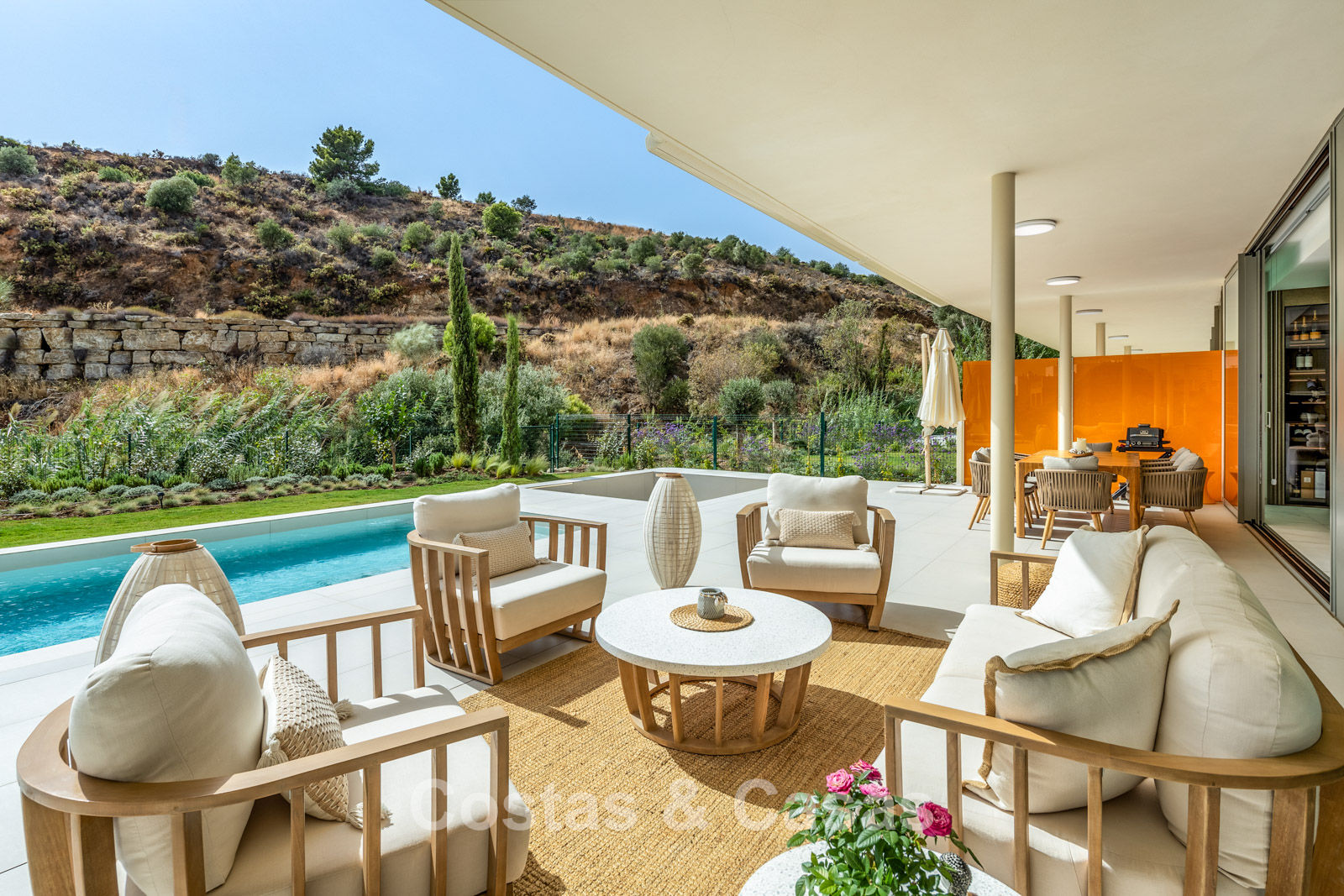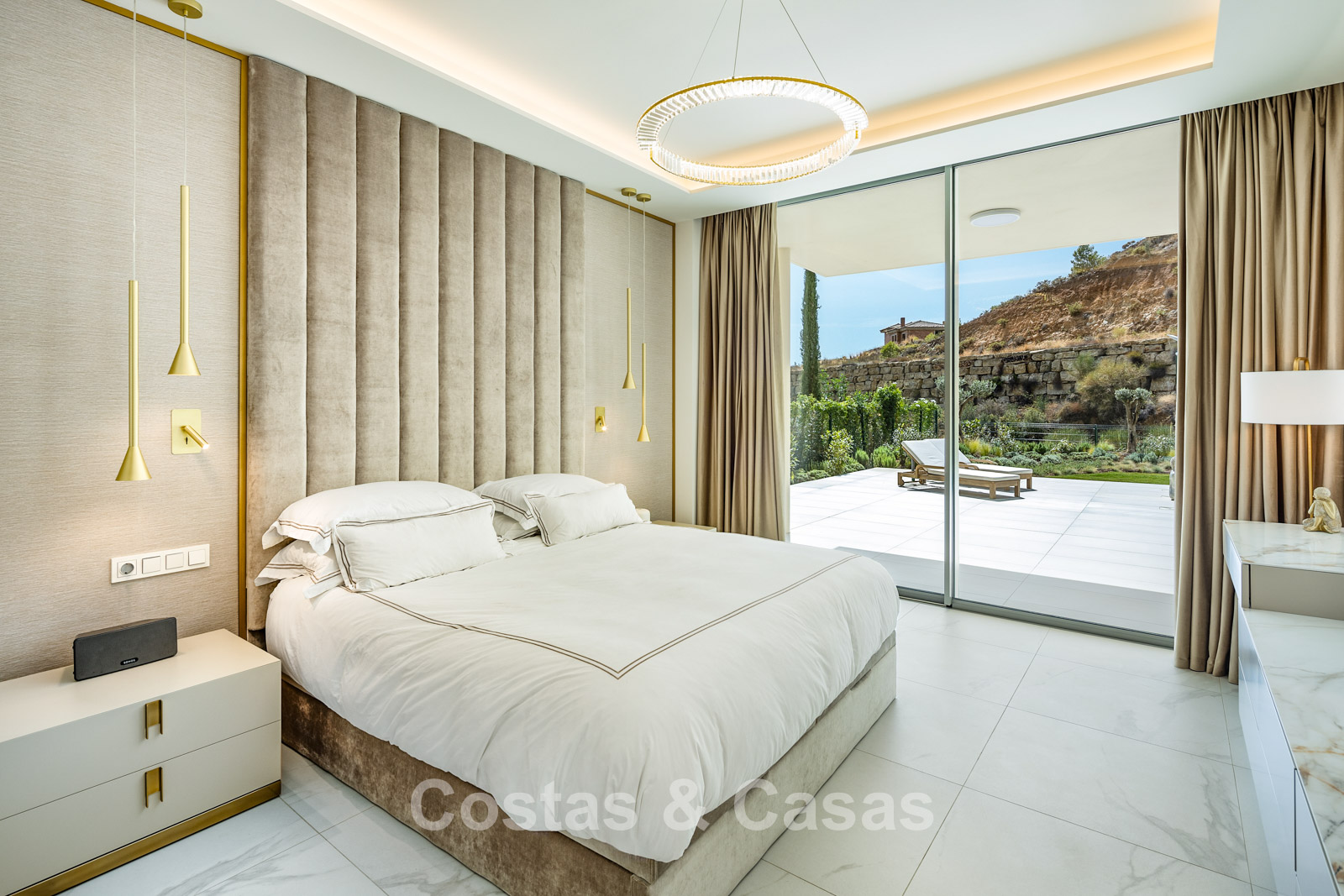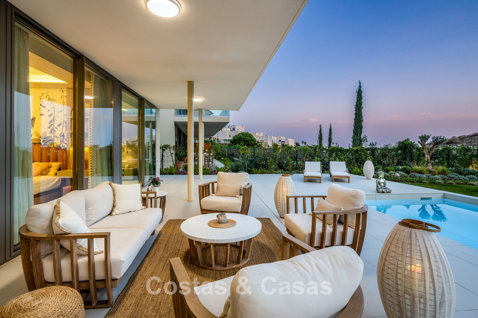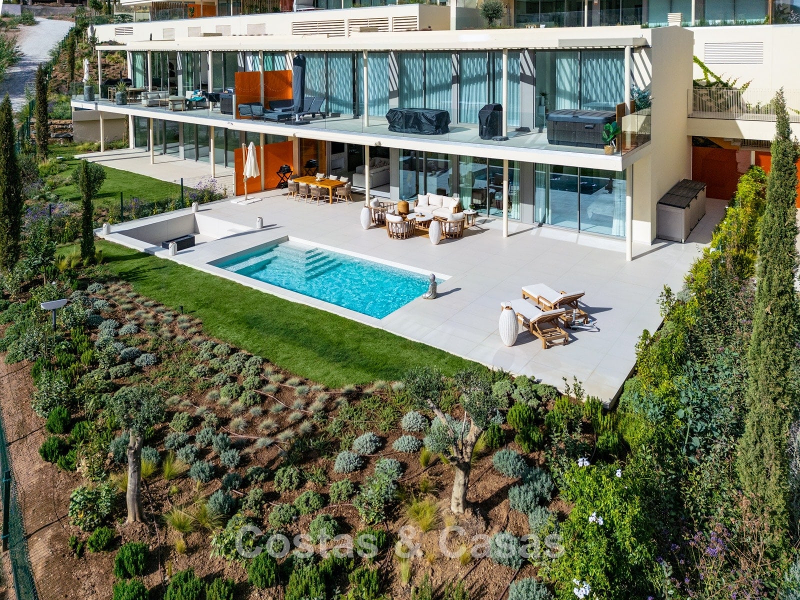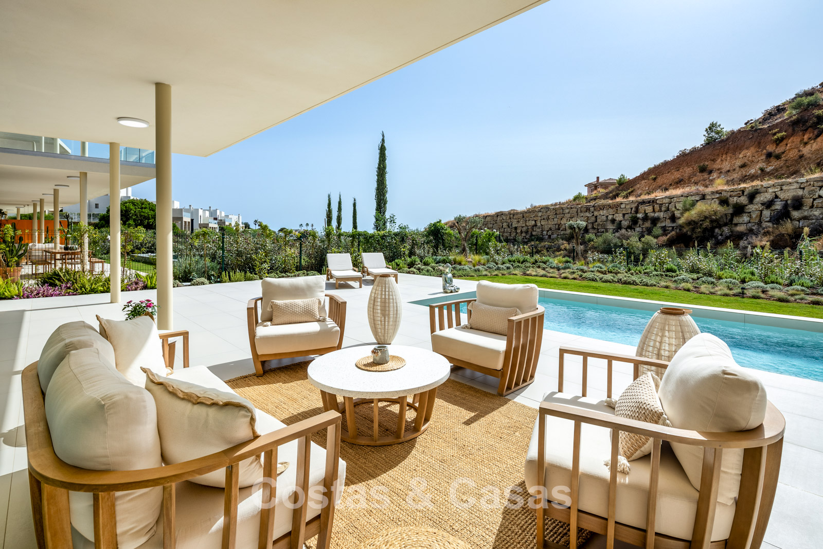 Apartamento en planta baja con amplio jardín privado cerrado. Recientemente terminado en 2024. Construcción energéticamente eficiente. Vistas serenas del paisaje montañoso y parcialmente al mar. Piscina privada rodeada de solárium. Al lado hay espacio para un salón hundido alrededor de una chimenea. Una amplia terraza soleada y parcialmente cubierta está equipada con una mesa de comedor y un salón. Situado al suroeste. Las ventanas corredizas de suelo a techo con perfiles empotrados permiten que entre mucha luz natural, creando una casa aireada y luminosa. Sala de estar con concepto abierto y sala de TV junto a la chimenea. Cocina abierta con electrodomésticos Smeg de alta calidad y una isla de cocción central donde poder sentarse. 3 dormitorios, 2 baños. La suite principal disfruta de un lujoso baño en suite y un vestidor. Suelos de baldosas de alta calidad.