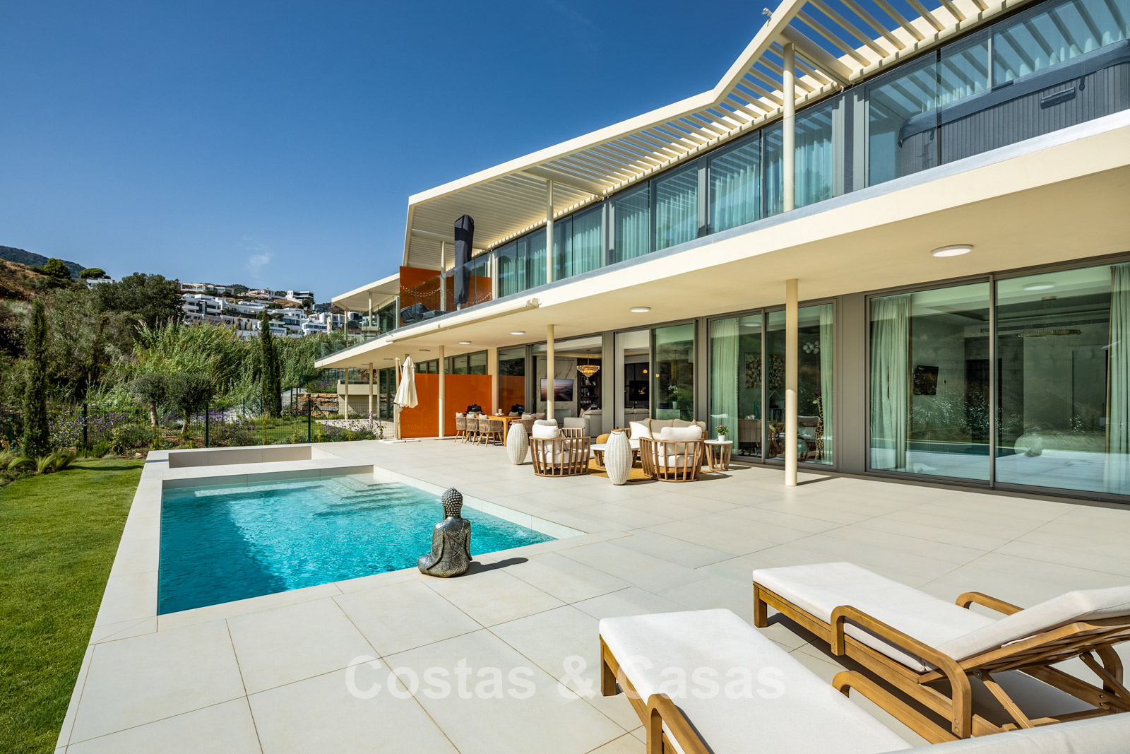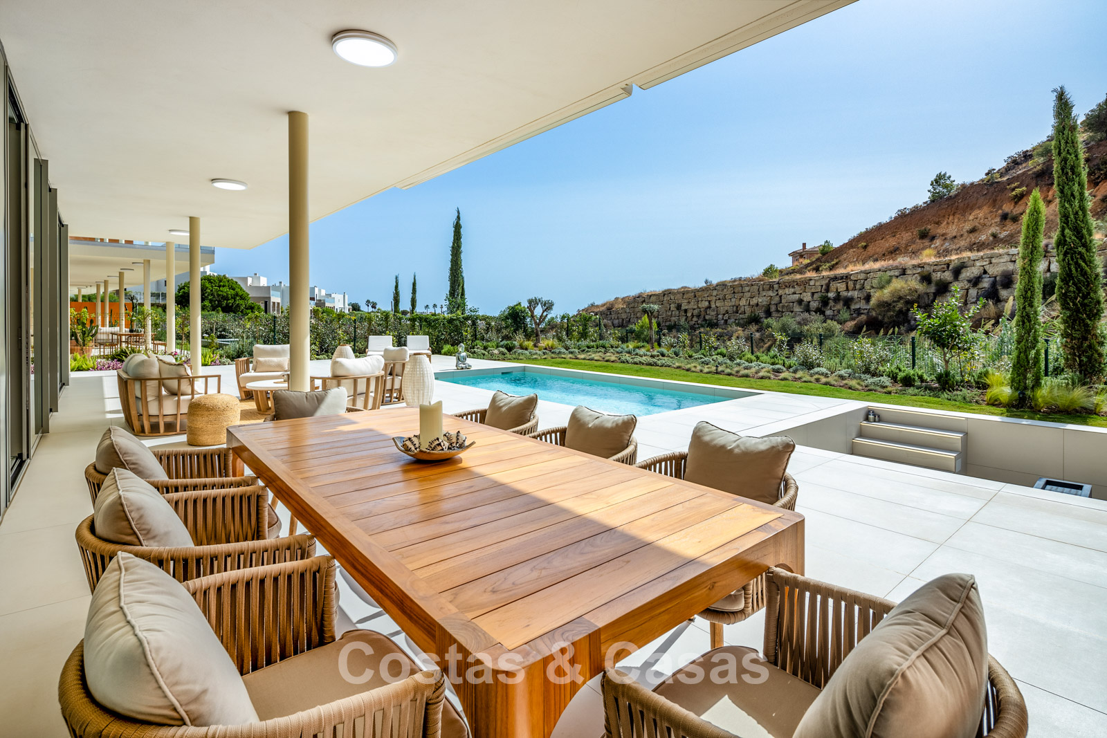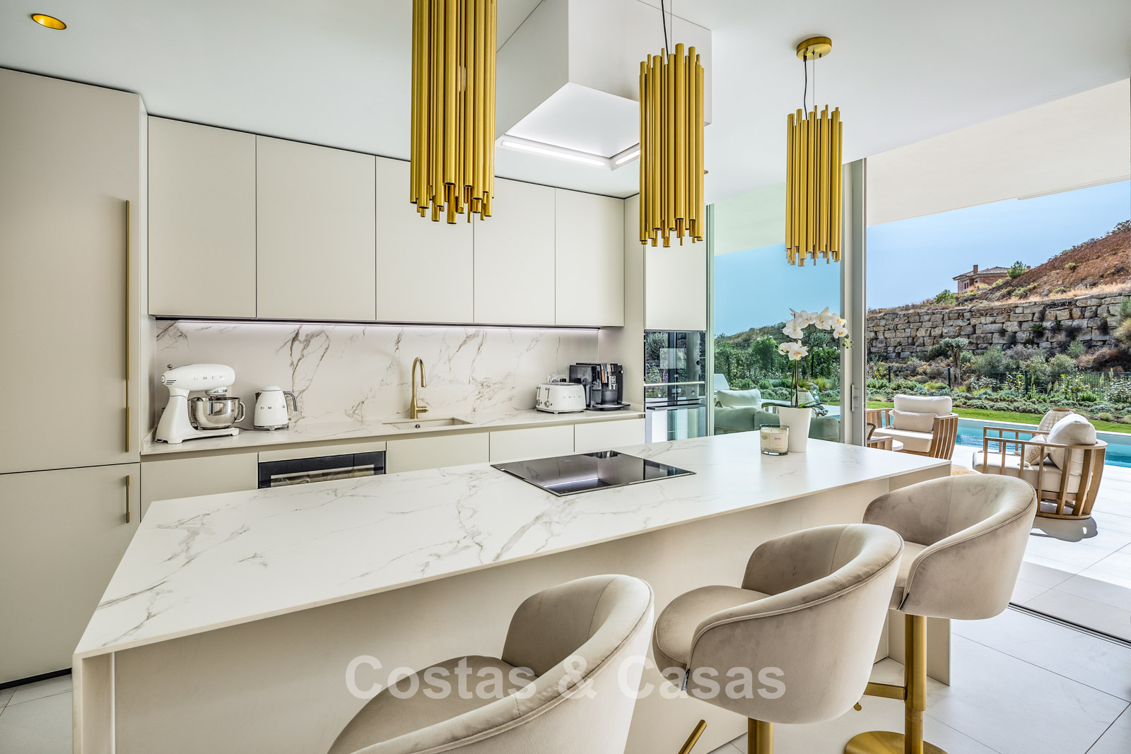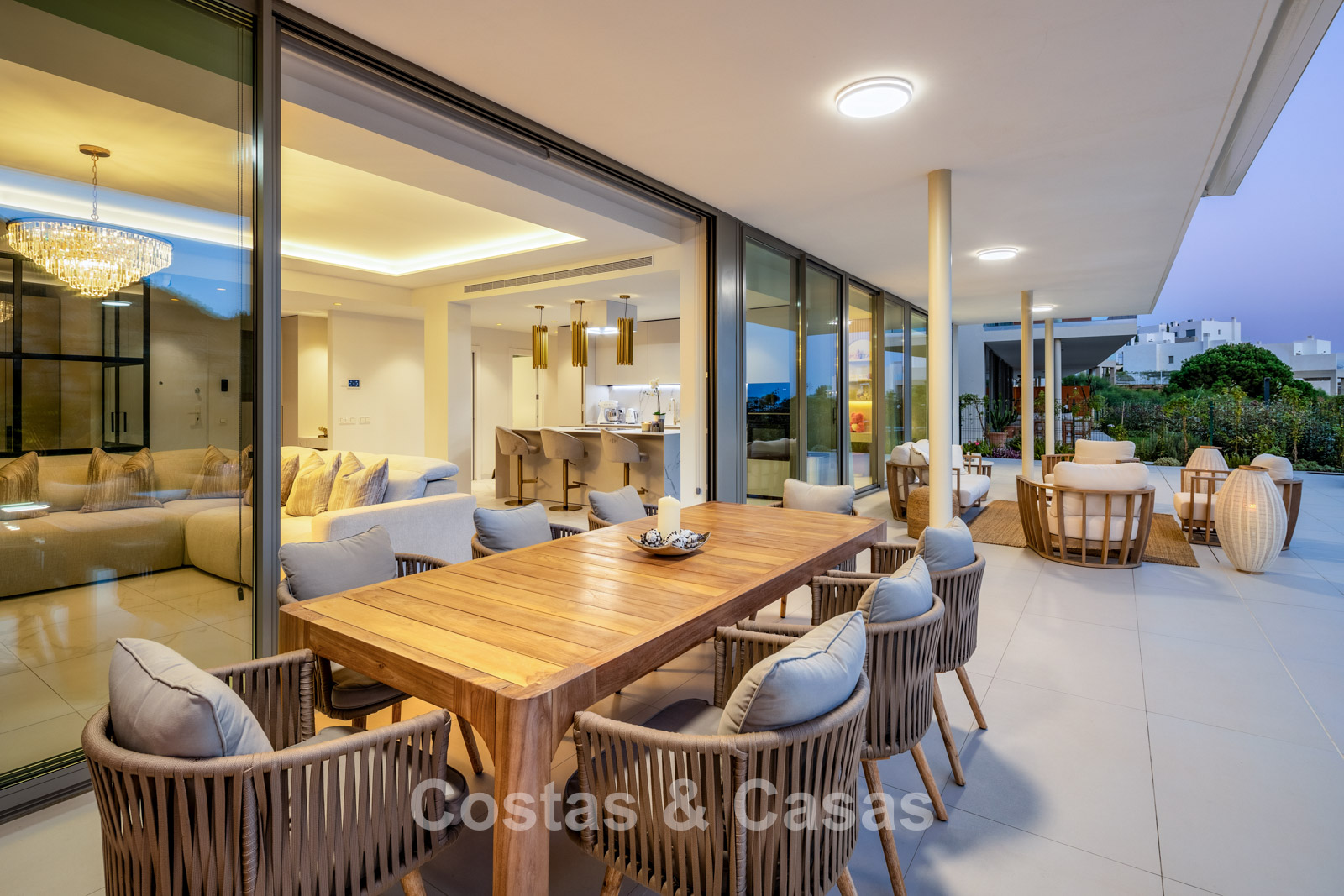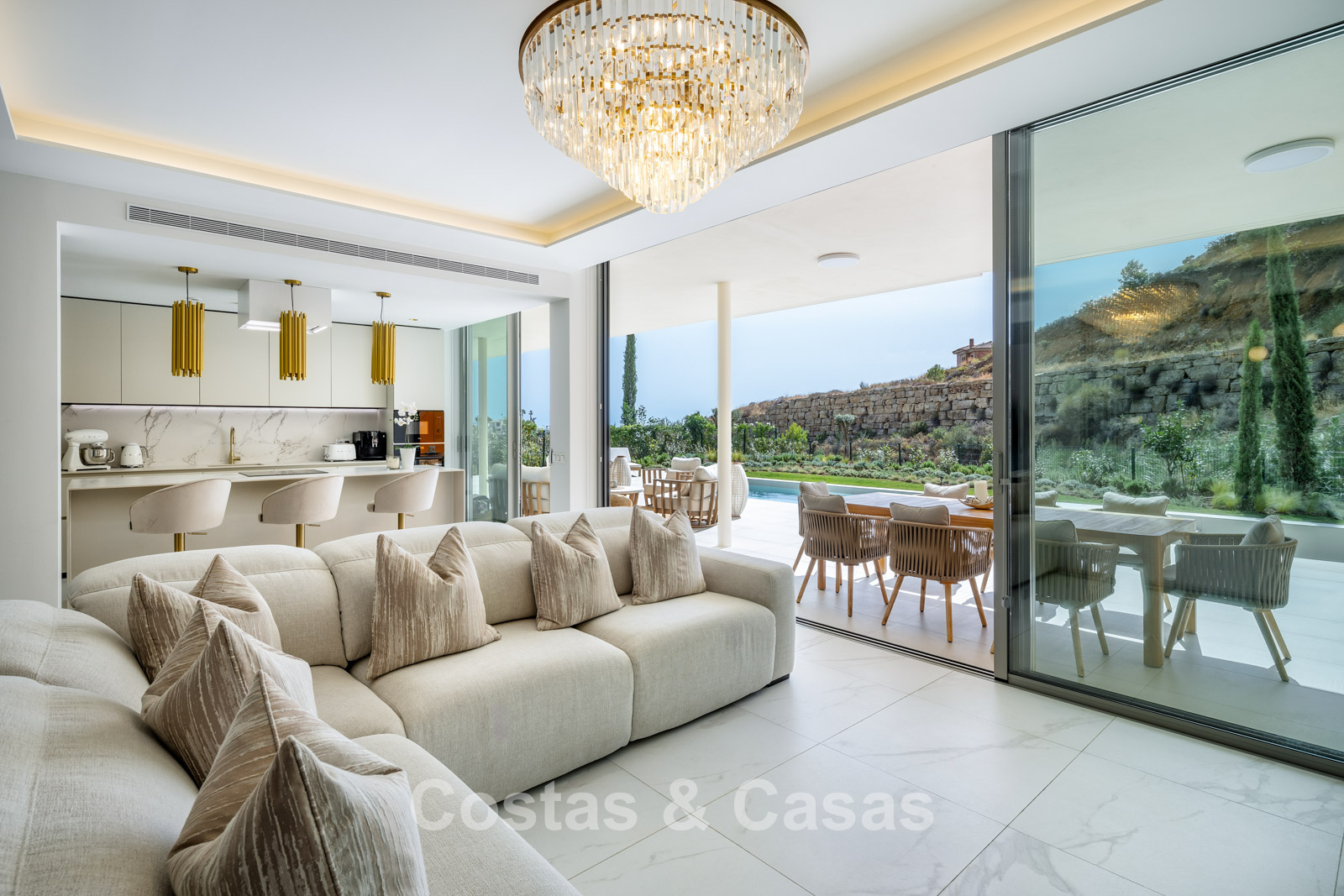 Apartamento en planta baja con amplio jardín privado cerrado. Recientemente terminado en 2024. Construcción energéticamente eficiente. Vistas serenas del paisaje montañoso y parcialmente al mar. Piscina privada rodeada de solárium. Al lado hay espacio para un salón hundido alrededor de una chimenea. Una amplia terraza soleada y parcialmente cubierta está equipada con una mesa de comedor y un salón. Situado al suroeste. Las ventanas corredizas de suelo a techo con perfiles empotrados permiten que entre mucha luz natural, creando una casa aireada y luminosa. Sala de estar con concepto abierto y sala de TV junto a la chimenea. Cocina abierta con electrodomésticos Smeg de alta calidad y una isla de cocción central donde poder sentarse. 3 dormitorios, 2 baños. La suite principal disfruta de un lujoso baño en suite y un vestidor. Suelos de baldosas de alta calidad.