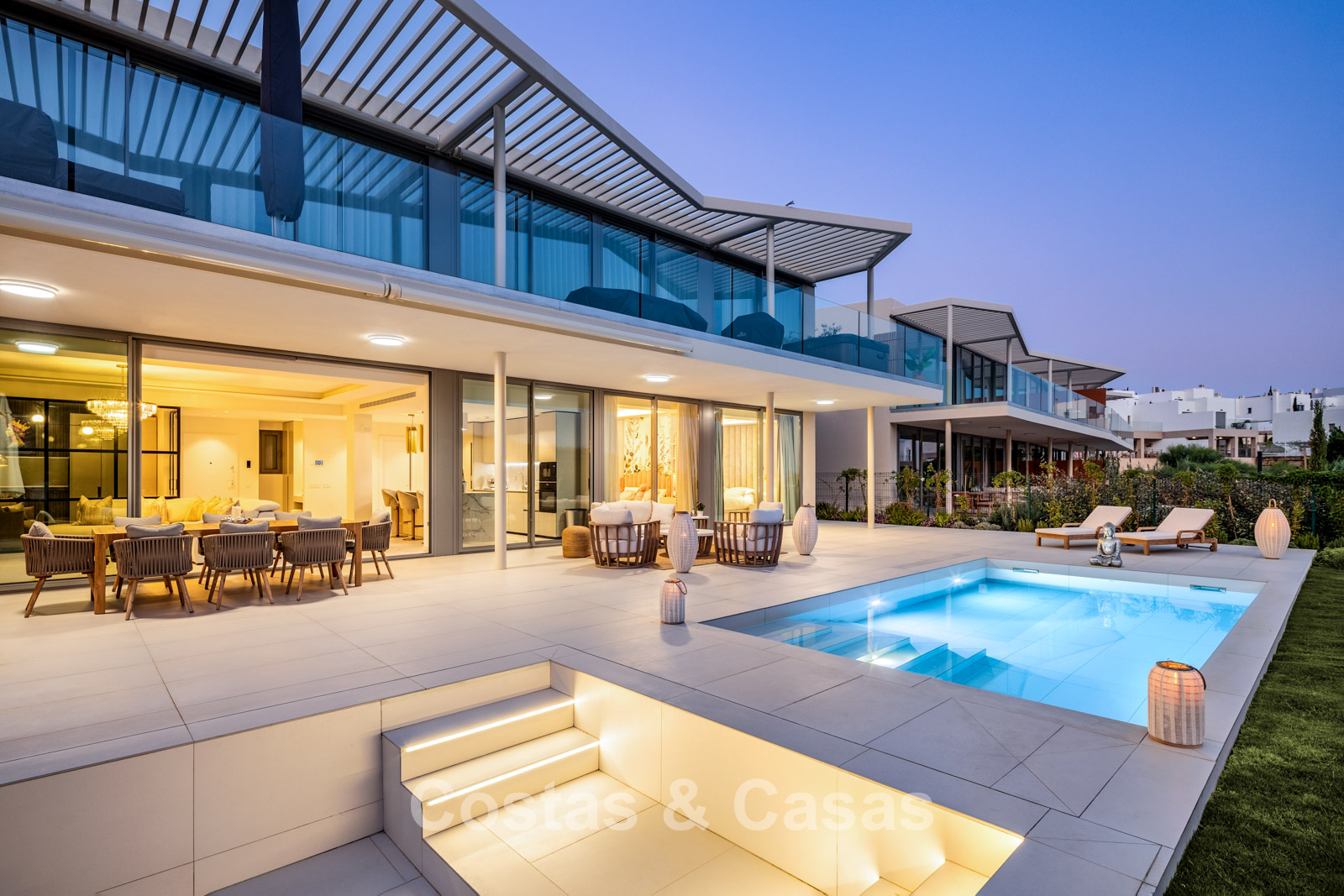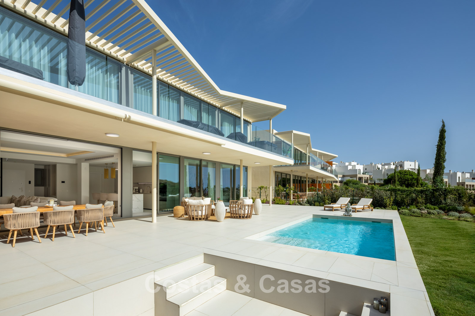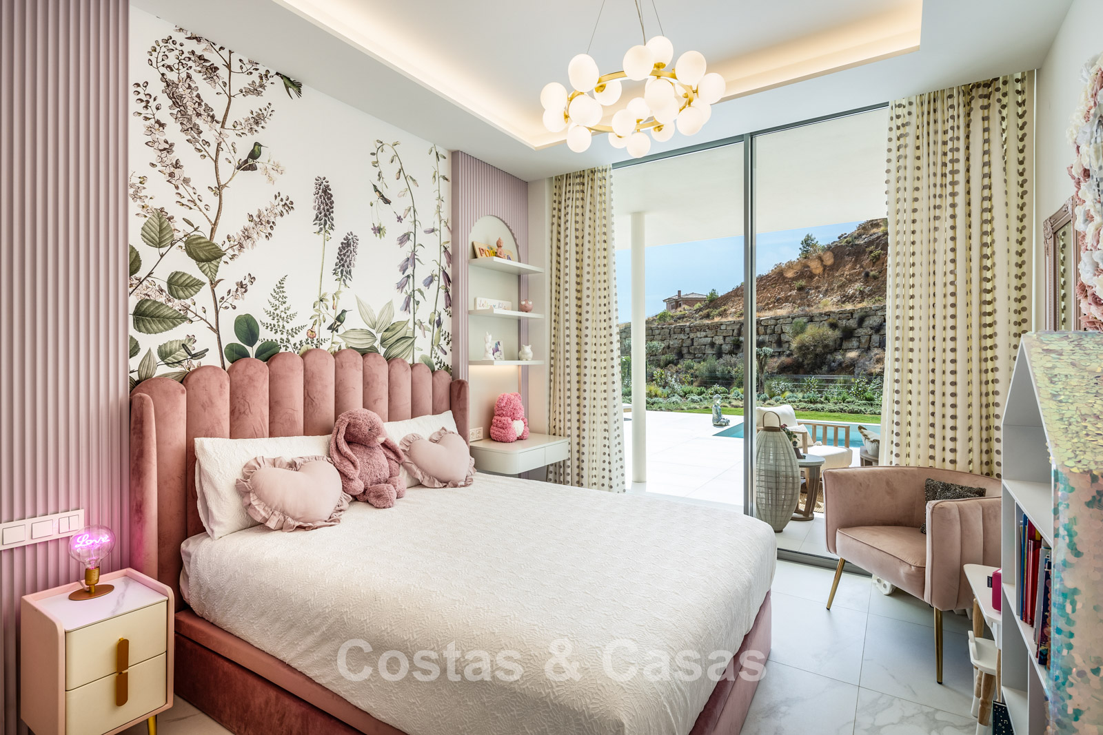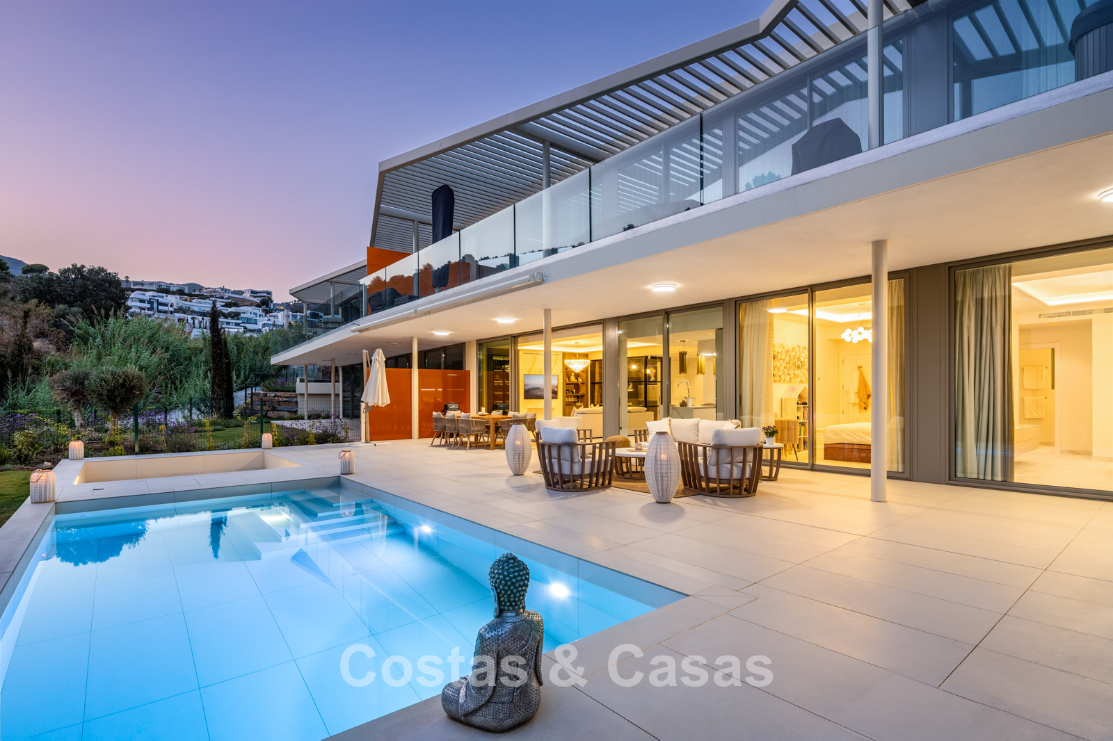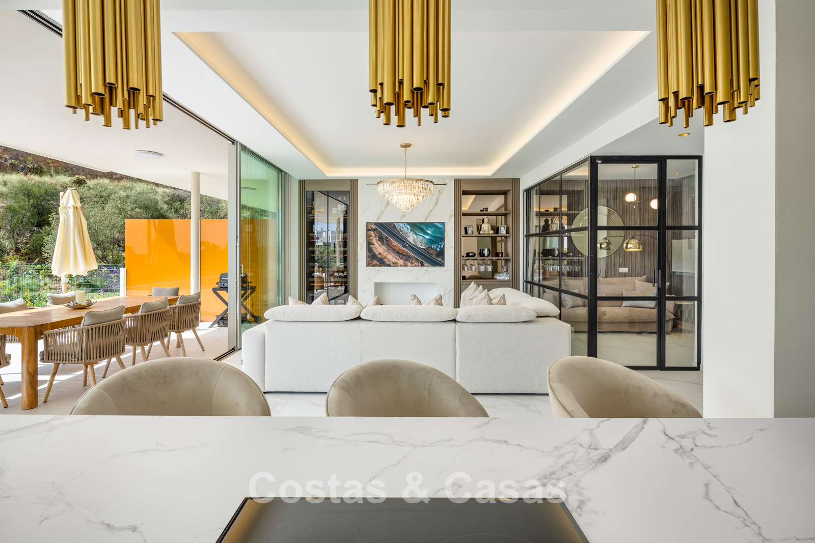 Apartamento en planta baja con amplio jardín privado cerrado. Recientemente terminado en 2024. Construcción energéticamente eficiente. Vistas serenas del paisaje montañoso y parcialmente al mar. Piscina privada rodeada de solárium. Al lado hay espacio para un salón hundido alrededor de una chimenea. Una amplia terraza soleada y parcialmente cubierta está equipada con una mesa de comedor y un salón. Situado al suroeste. Las ventanas corredizas de suelo a techo con perfiles empotrados permiten que entre mucha luz natural, creando una casa aireada y luminosa. Sala de estar con concepto abierto y sala de TV junto a la chimenea. Cocina abierta con electrodomésticos Smeg de alta calidad y una isla de cocción central donde poder sentarse. 3 dormitorios, 2 baños. La suite principal disfruta de un lujoso baño en suite y un vestidor. Suelos de baldosas de alta calidad.