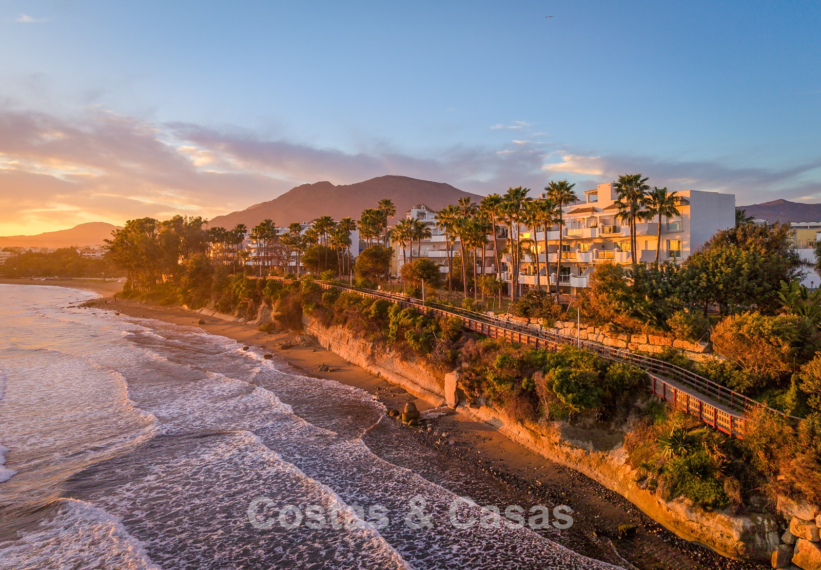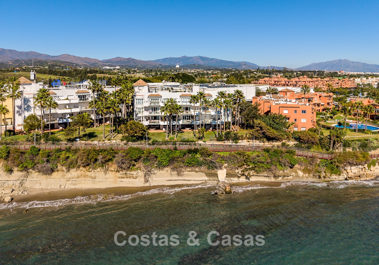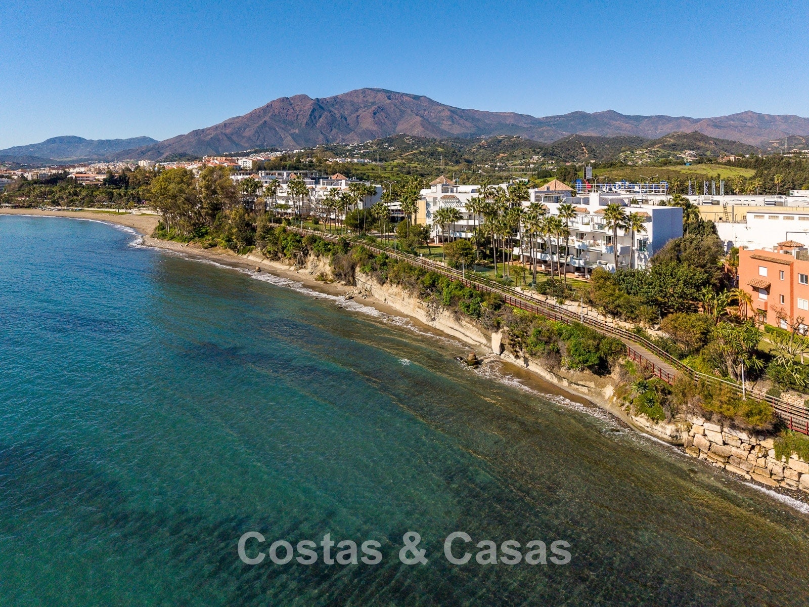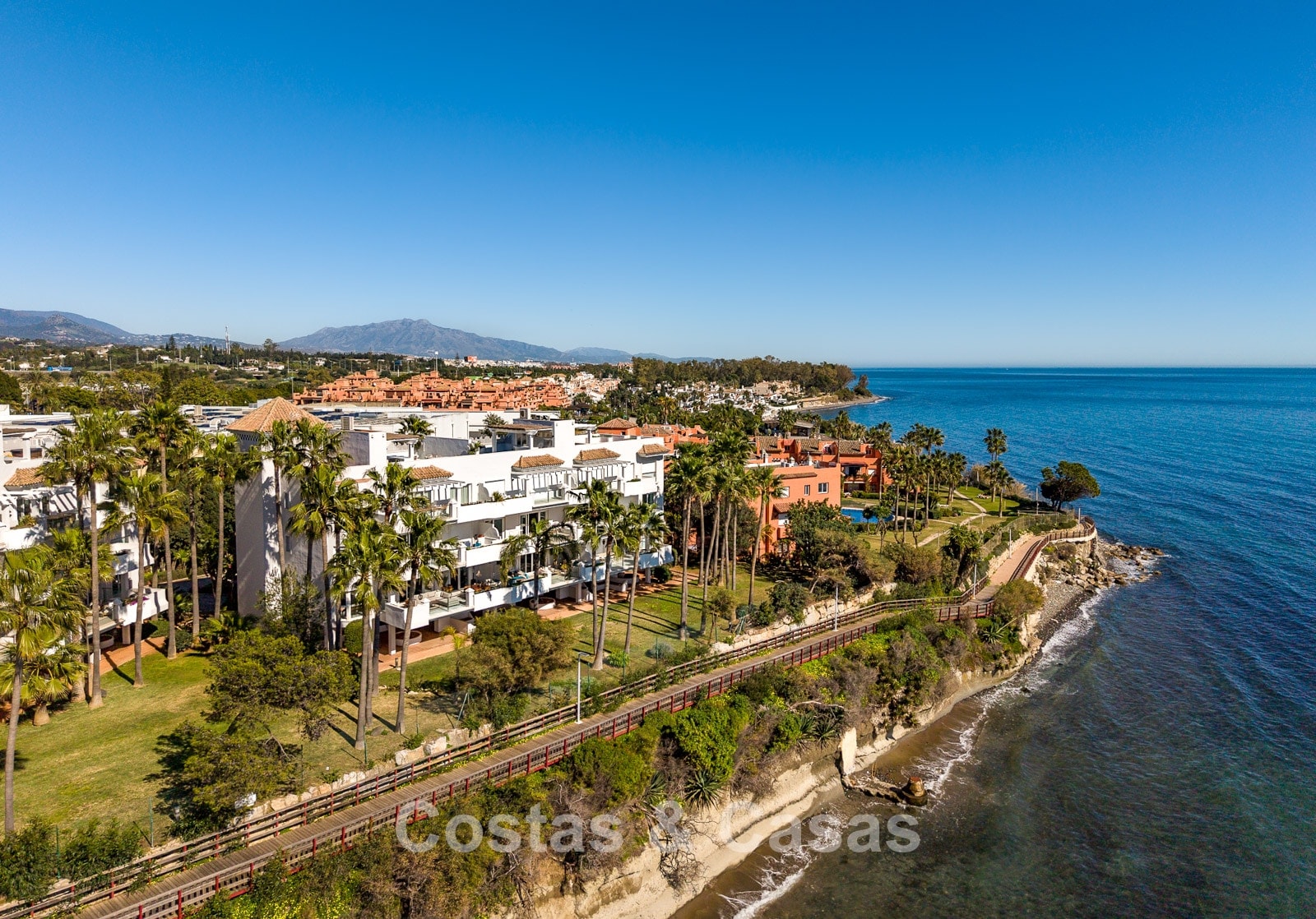 Este exclusivo complejo disfruta de una ubicación inmejorable en primera línea de playa, en una posición elevada, justo en uno de los mejores tramos del paseo marítimo de Estepona. El paseo marítimo, de varios kilómetros, ha sido completamente renovado en los últimos años y es uno de los más modernos y animados de España. A solo 10–15 minutos a pie se encuentra el encantador casco antiguo, con calles llenas de flores, bares de tapas gourmet, boutiques y el animado puerto deportivo. Para mayor comodidad, un gran supermercado Carrefour está a pocos pasos, permitiendo cubrir todas las necesidades sin necesidad de coche. También hay un reconocido restaurante de playa cercano, además de varios chiringuitos a poca distancia. Los amantes del golf disfrutarán de campos como Valle Romano a poca distancia en coche, mientras que Marbella y Puerto Banús están a solo 20 minutos.