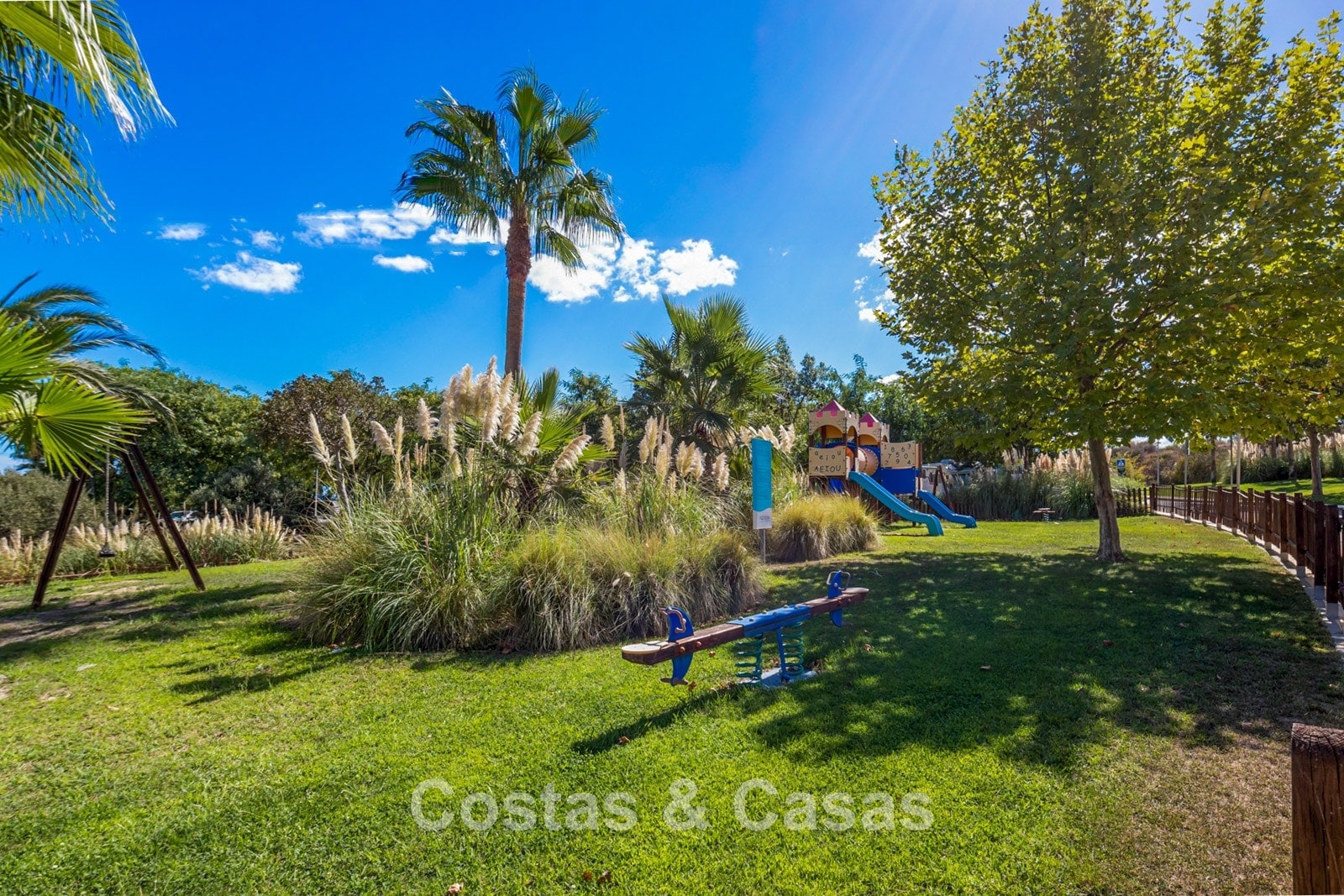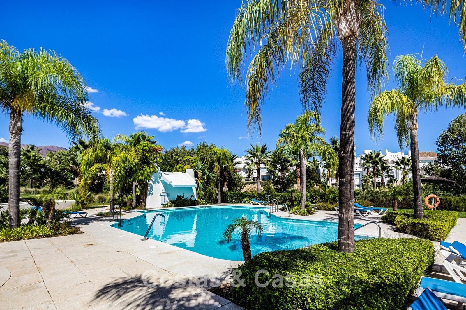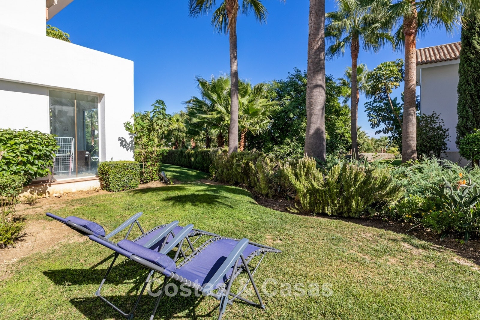 La cuidada urbanización ofrece jardines maduros y verdes y dos piscinas comunitarias.