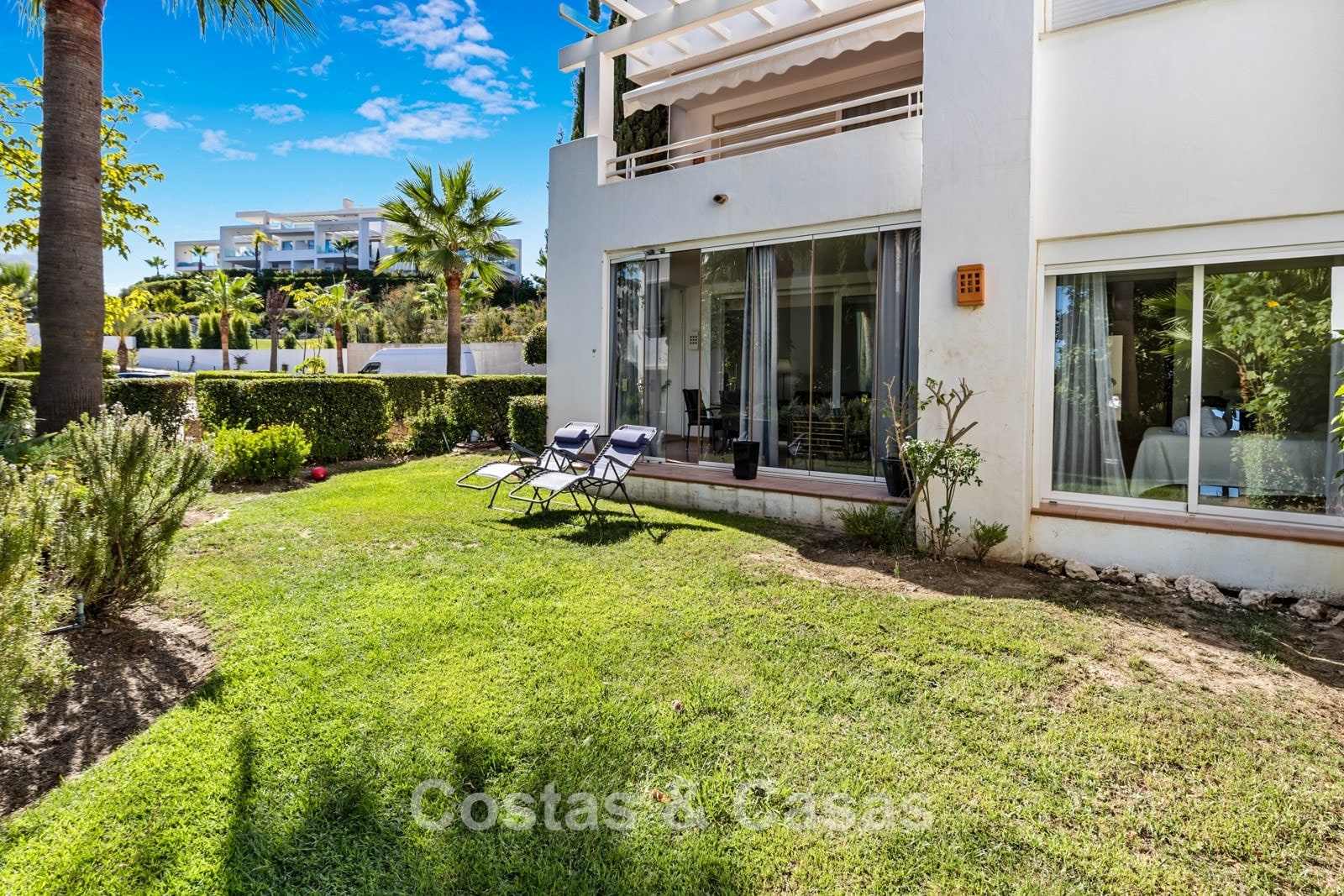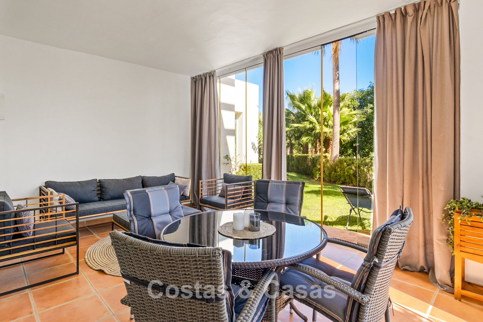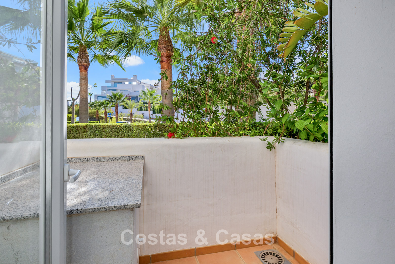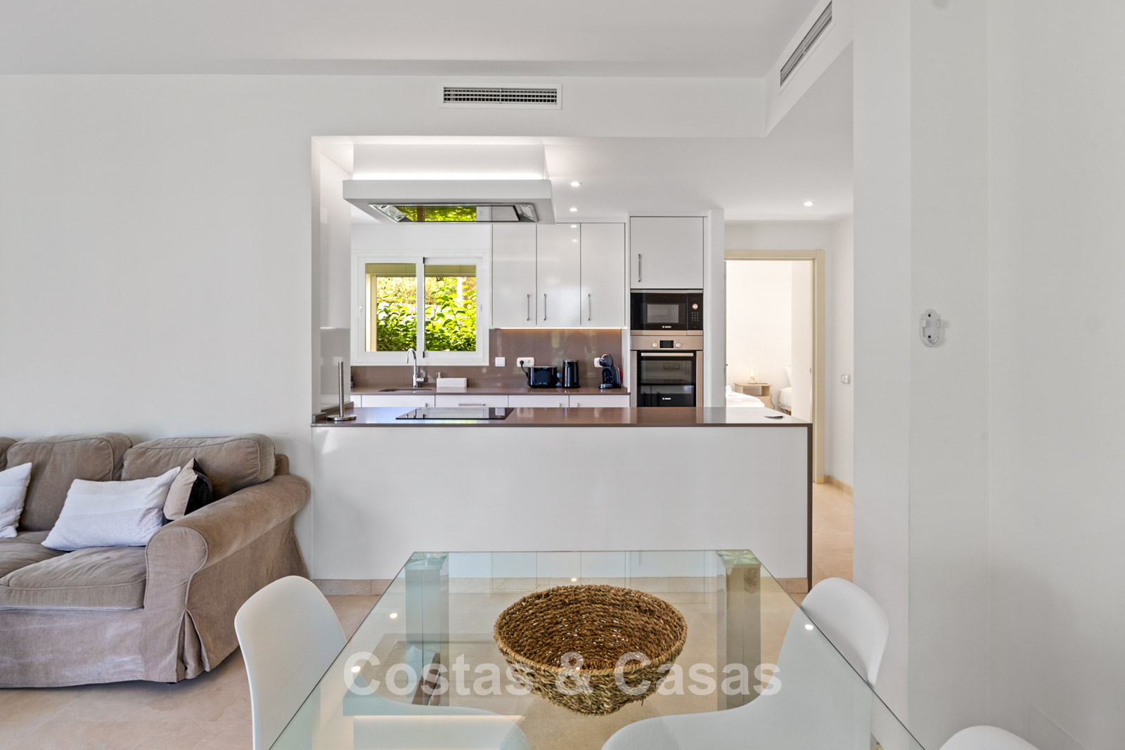 Apartamento en planta baja. Acabados con materiales de alta calidad. Vistas a los preciosos jardines circundantes. Las amplias ventanas correderas del salón proporcionan luminosidad y acceso a la zona exterior. Acceso directo a la terraza cubierta y a un jardín comunitario. Espacio diáfano. Cocina totalmente equipada con electrodomésticos Bosch de alta calidad. Dos amplios dormitorios con dos baños. El dormitorio principal cuenta con baño en suite, mientras que el segundo dormitorio tiene acceso a un baño independiente. Suelos de mármol. Garaje privado.