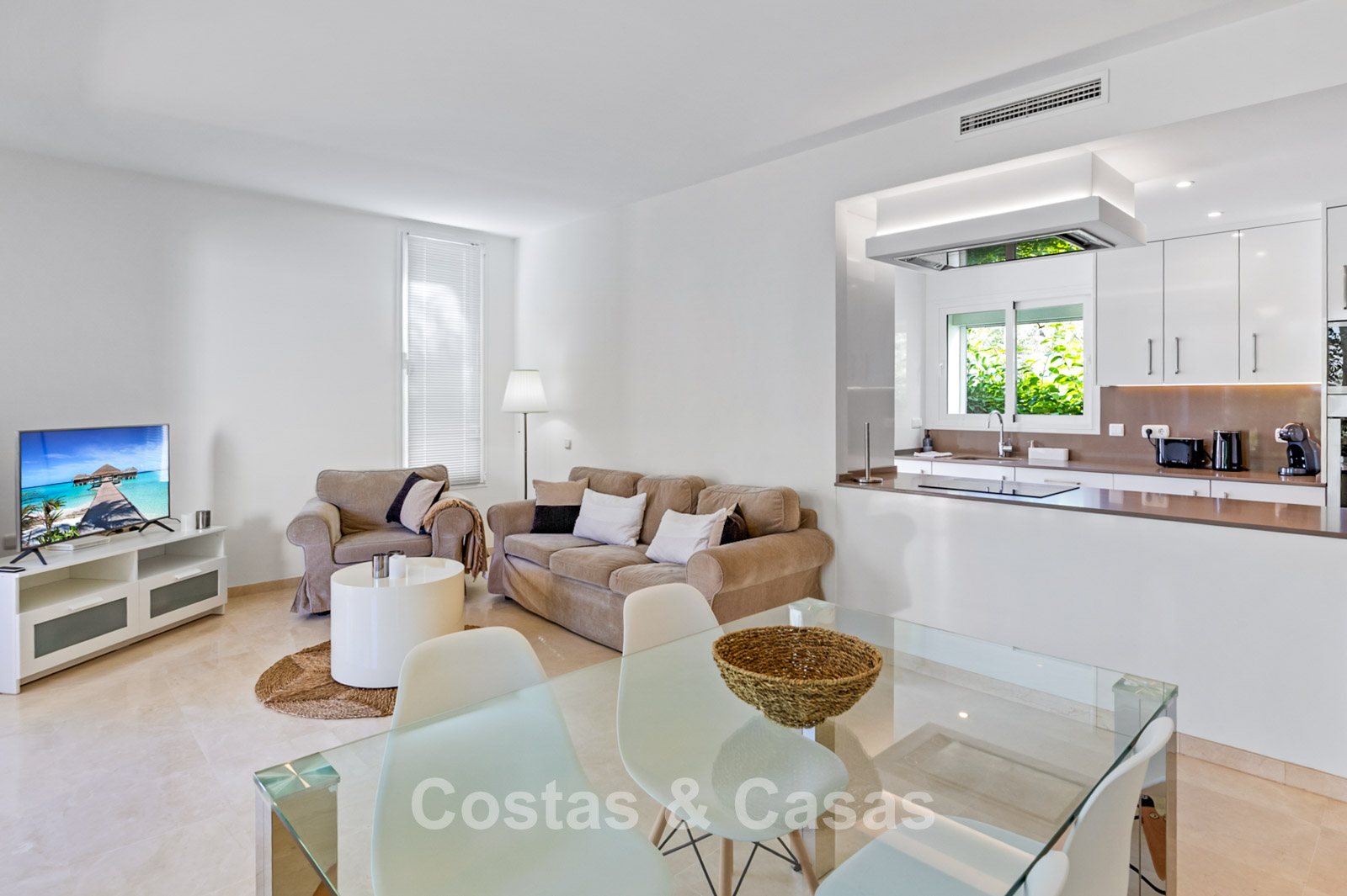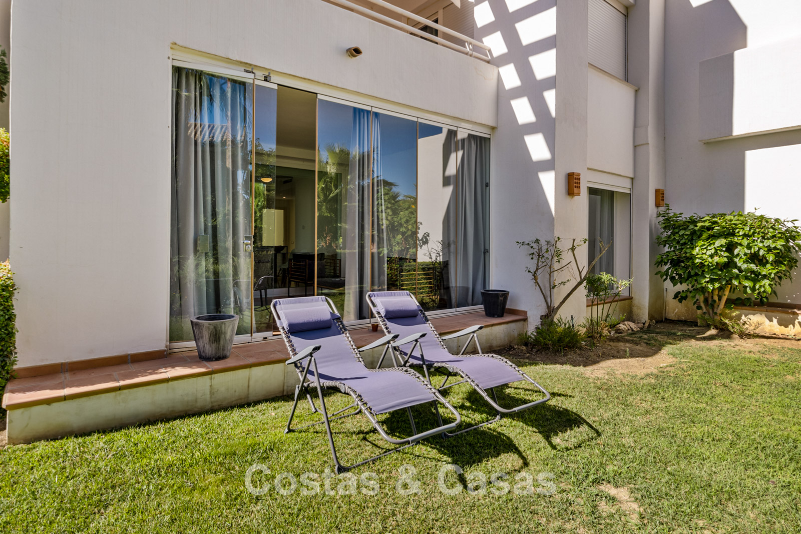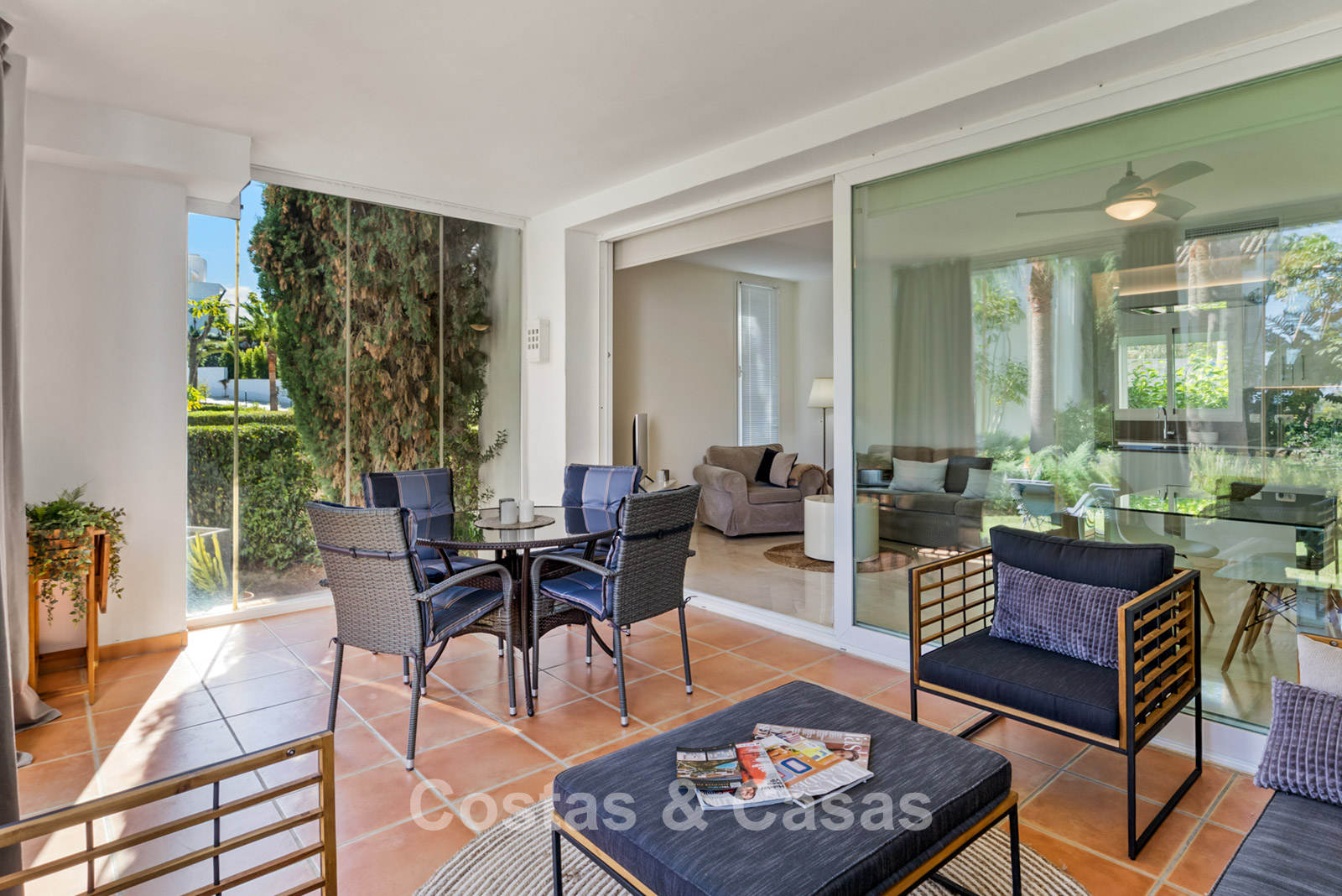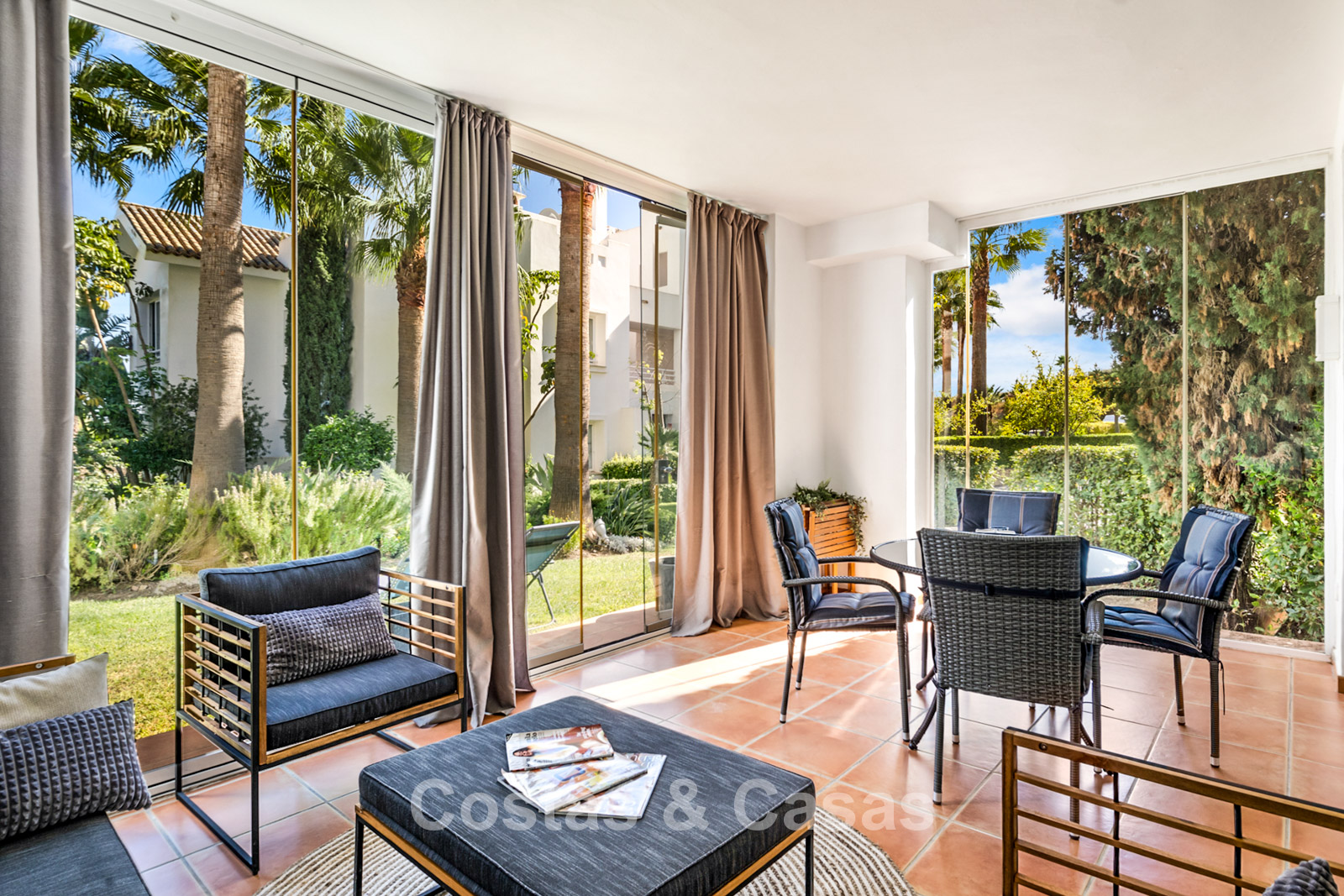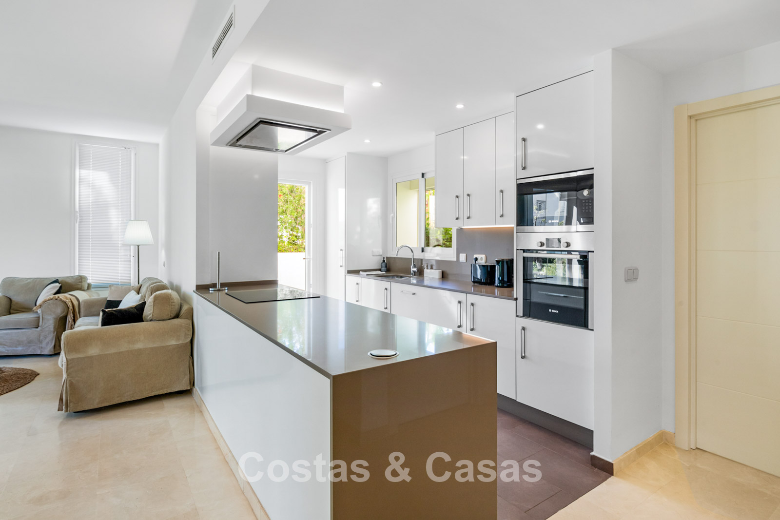 Apartamento en planta baja. Acabados con materiales de alta calidad. Vistas a los preciosos jardines circundantes. Las amplias ventanas correderas del salón proporcionan luminosidad y acceso a la zona exterior. Acceso directo a la terraza cubierta y a un jardín comunitario. Espacio diáfano. Cocina totalmente equipada con electrodomésticos Bosch de alta calidad. Dos amplios dormitorios con dos baños. El dormitorio principal cuenta con baño en suite, mientras que el segundo dormitorio tiene acceso a un baño independiente. Suelos de mármol. Garaje privado.