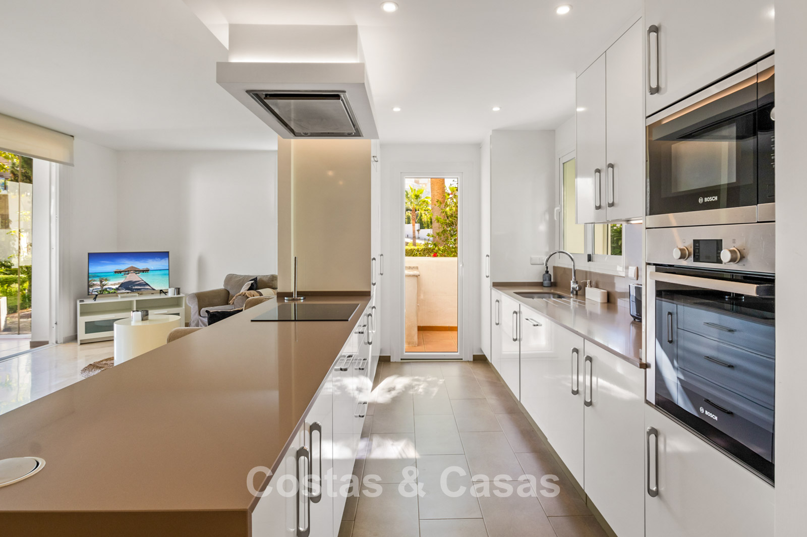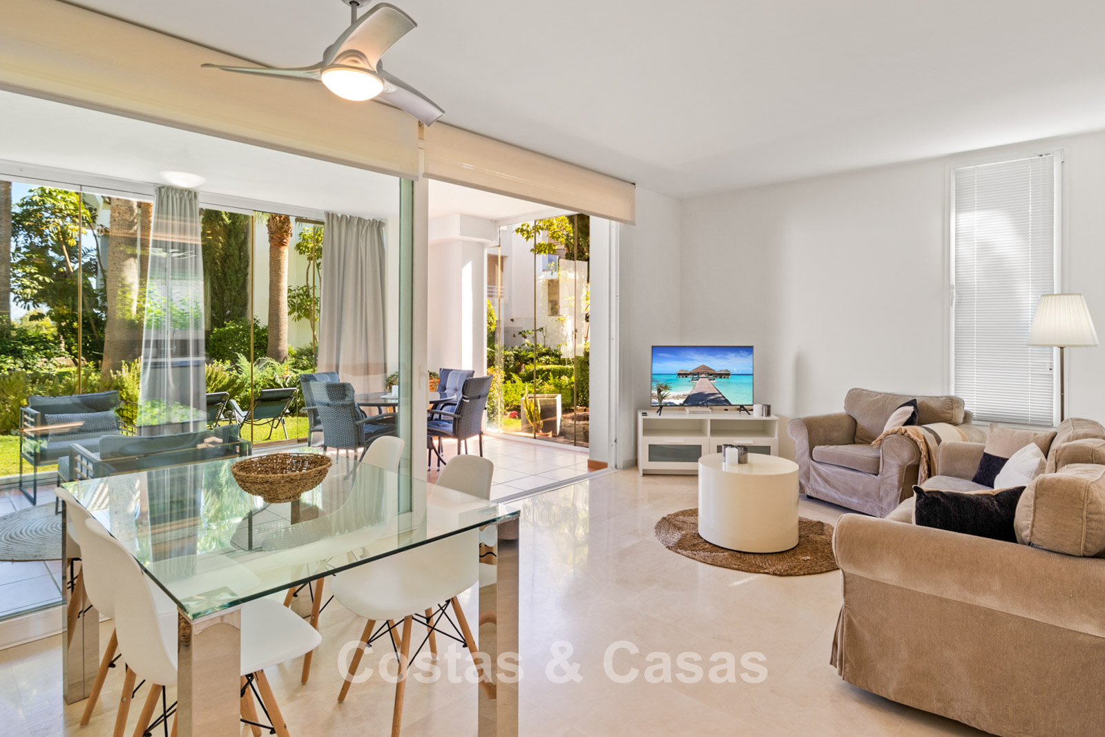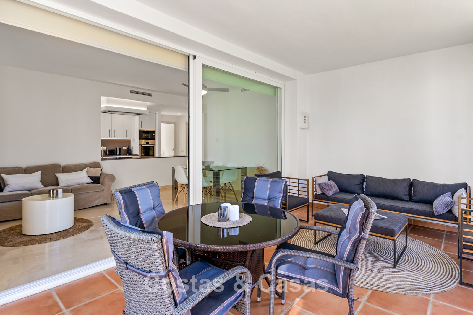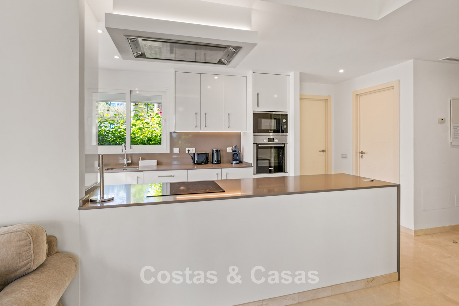 Apartamento en planta baja. Acabados con materiales de alta calidad. Vistas a los preciosos jardines circundantes. Las amplias ventanas correderas del salón proporcionan luminosidad y acceso a la zona exterior. Acceso directo a la terraza cubierta y a un jardín comunitario. Espacio diáfano. Cocina totalmente equipada con electrodomésticos Bosch de alta calidad. Dos amplios dormitorios con dos baños. El dormitorio principal cuenta con baño en suite, mientras que el segundo dormitorio tiene acceso a un baño independiente. Suelos de mármol. Garaje privado.