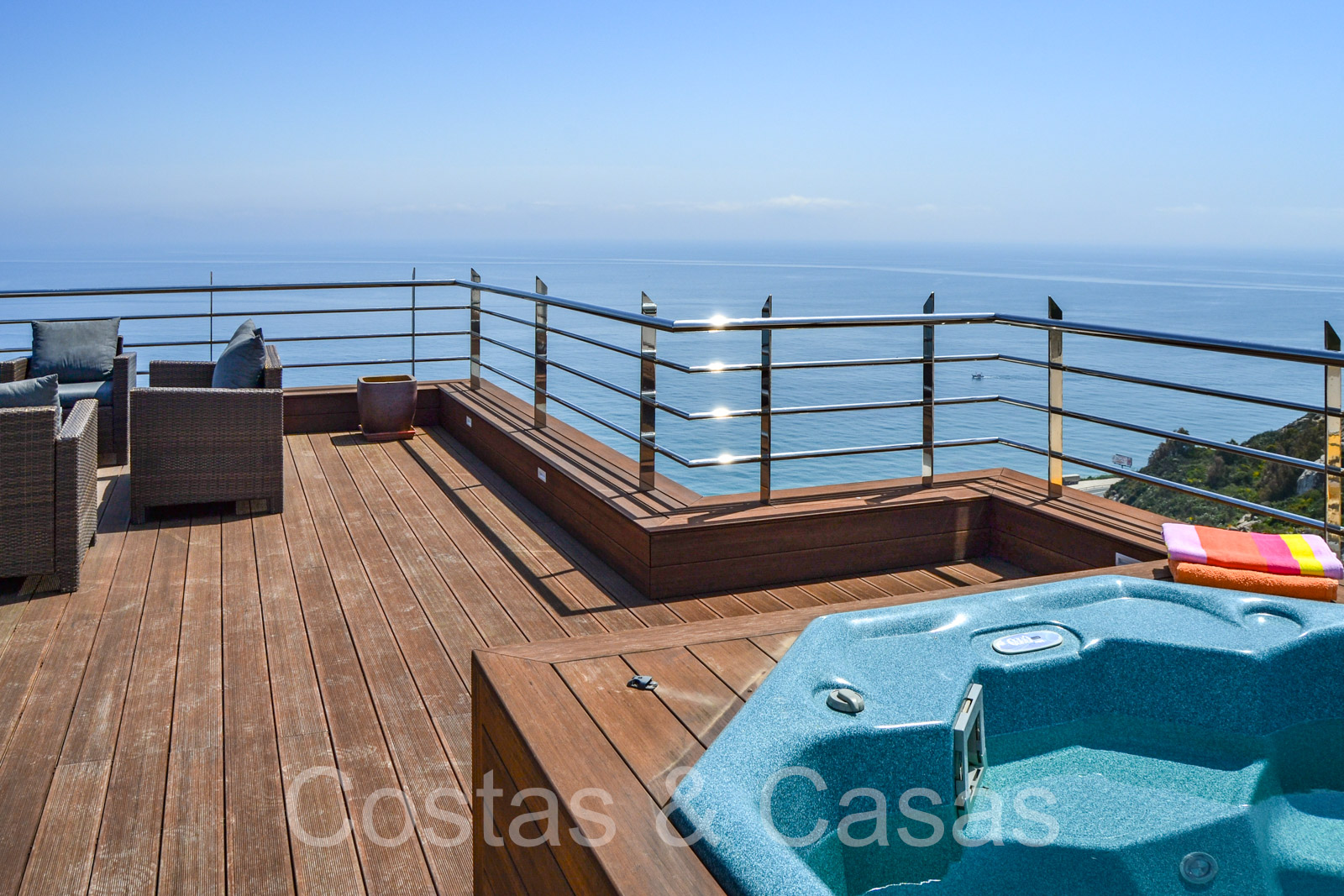 Situada en una parcela espaciosa y cerrada en una posición elevada. Exterior bien cuidado que consta de varias terrazas y vegetación tropical. Se accede a la parcela a través de un portón motorizado. Piscina infinita climatizada con fantásticas vistas al mar. Solárium equipado con salón y jacuzzi. Orientación sur. Vistas panorámicas inigualables sobre el Mar Mediterráneo, hacia el Estrecho de Gibraltar.