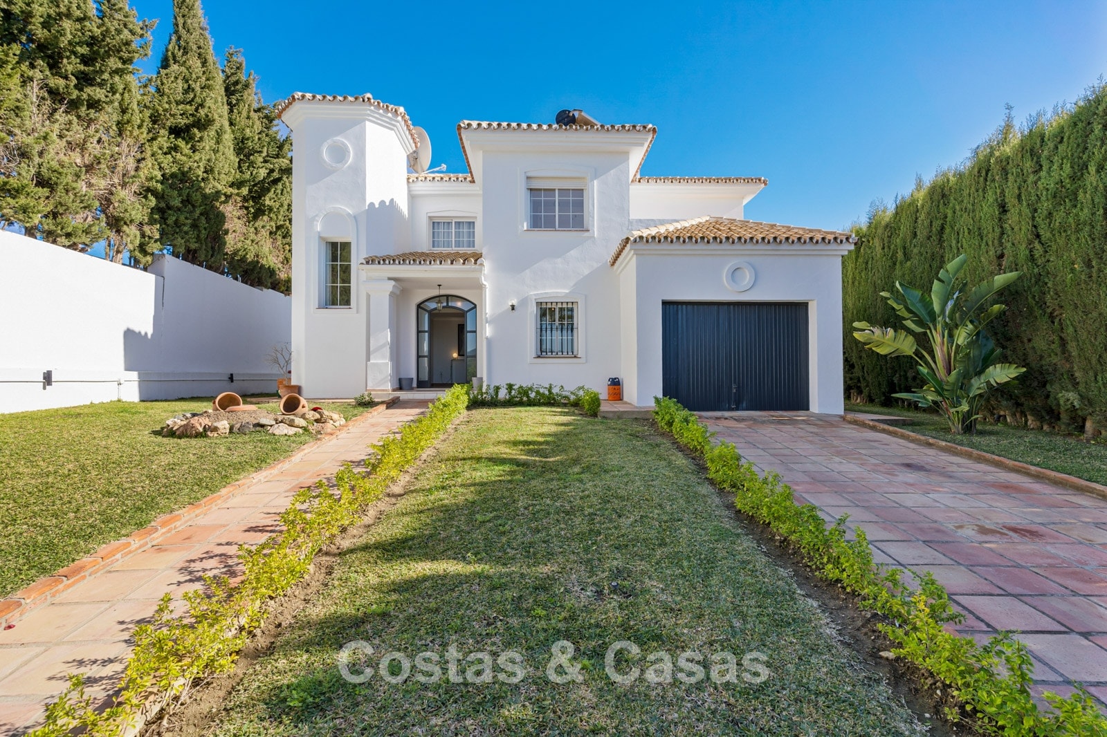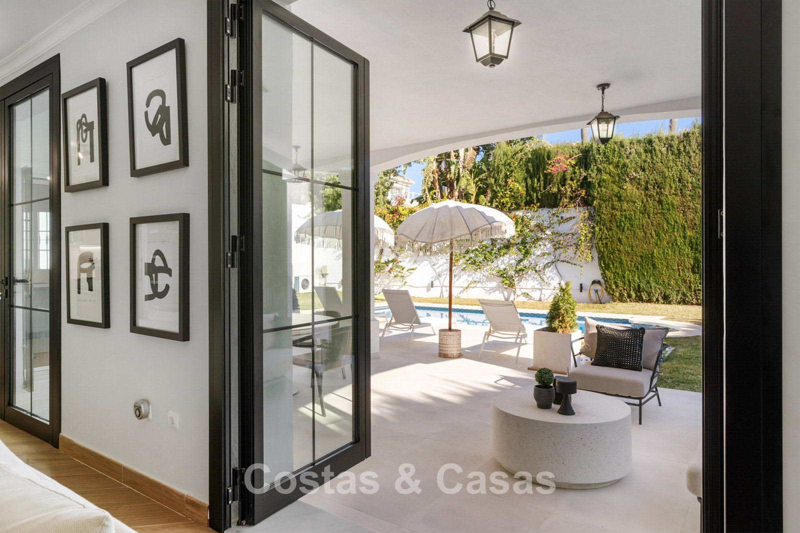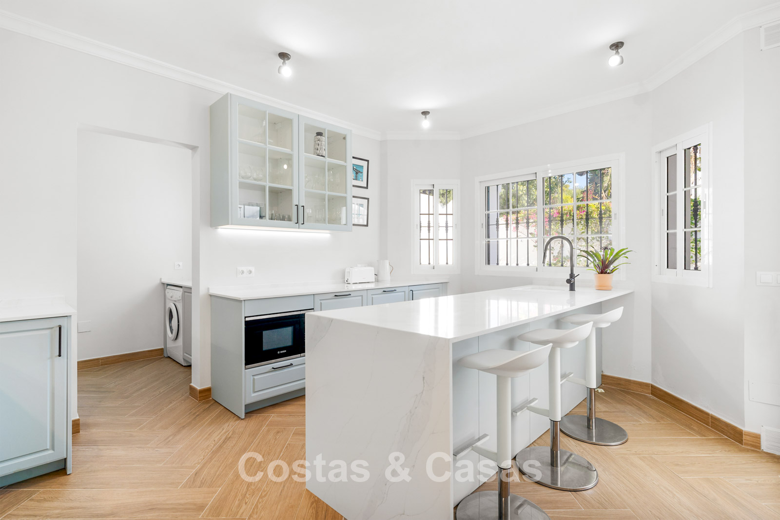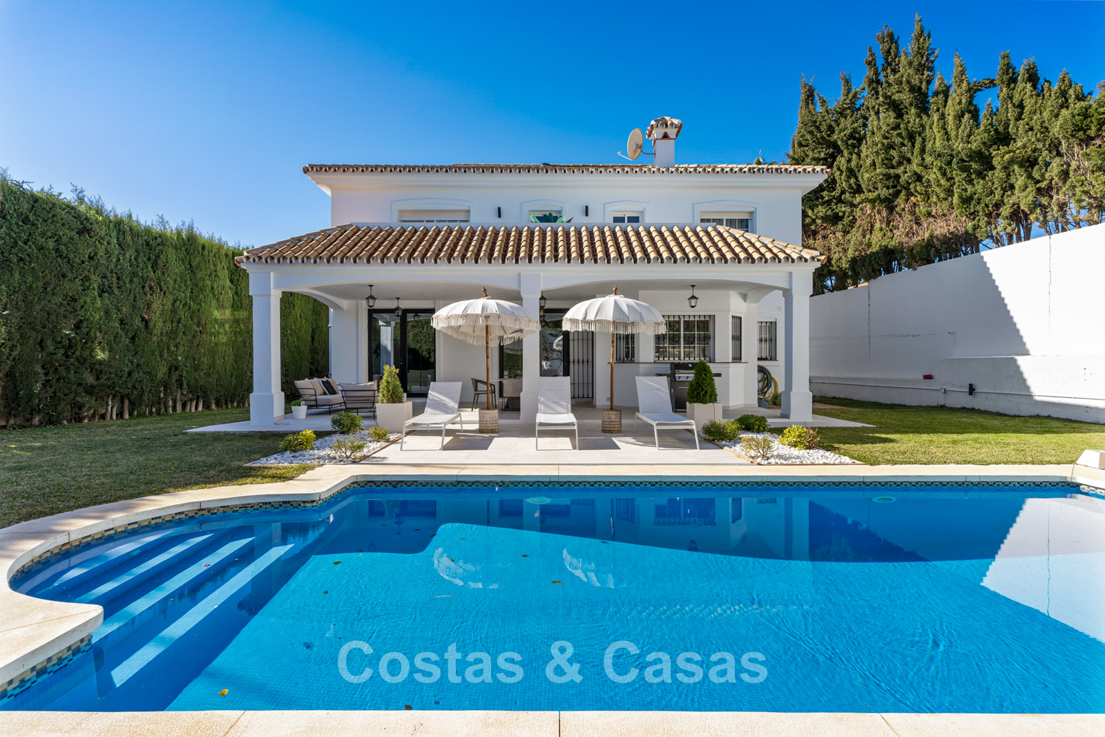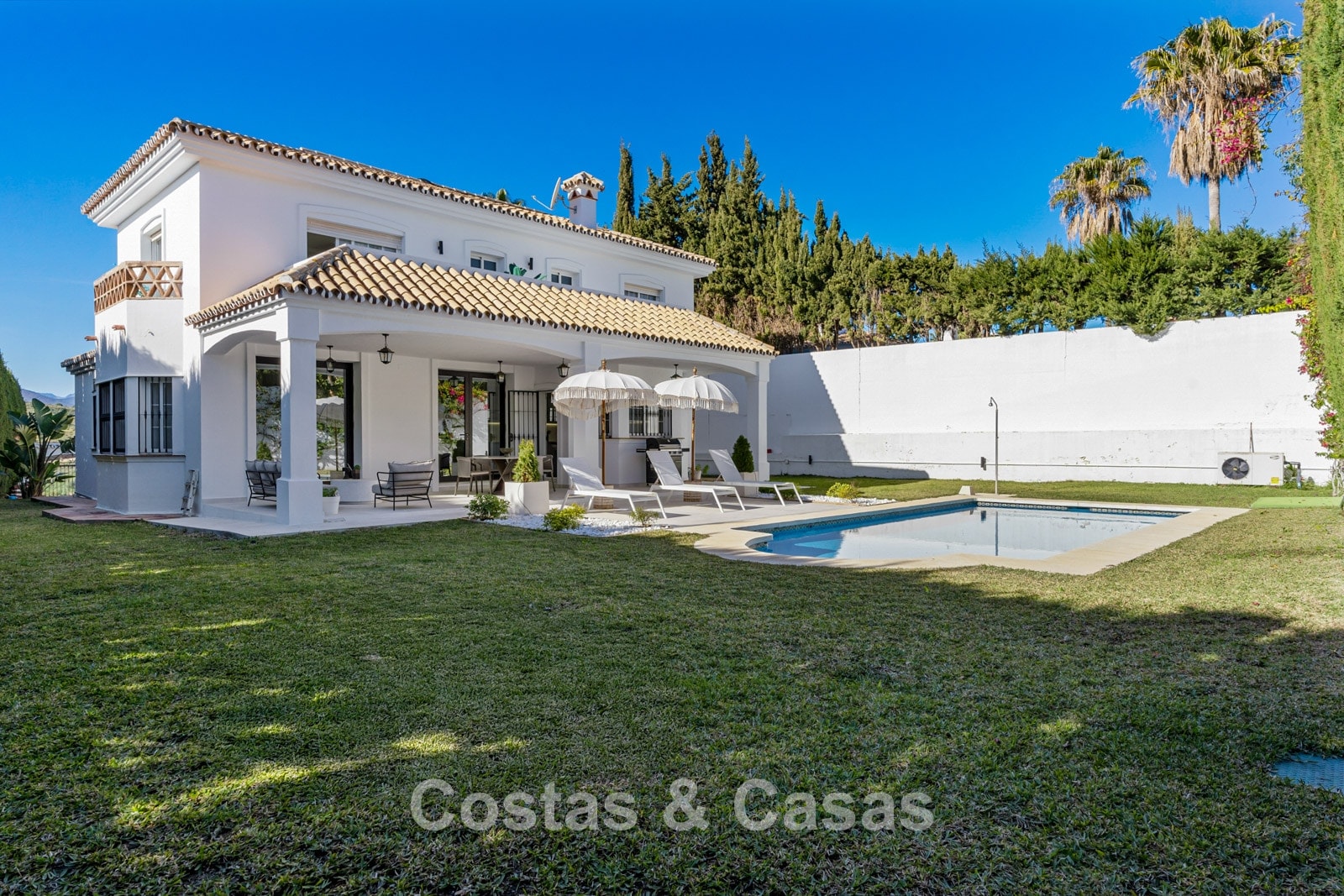 Villa independiente de estilo andaluz. Recientemente renovada en 2024 en un estilo contemporáneo con atención al lujo y al diseño. Las estructuras de ventanas altas proporcionan una transición perfecta entre los espacios interiores y exteriores y también generan abundante luz natural. Cocina abierta totalmente equipada con zona de desayuno y lavadero independiente. 4 dormitorios, 4 baños. Suelos de parquet cerámico en estructura de espiga. Trastero. Garaje interior para 1 coche. Aparcamiento adicional en la parcela.