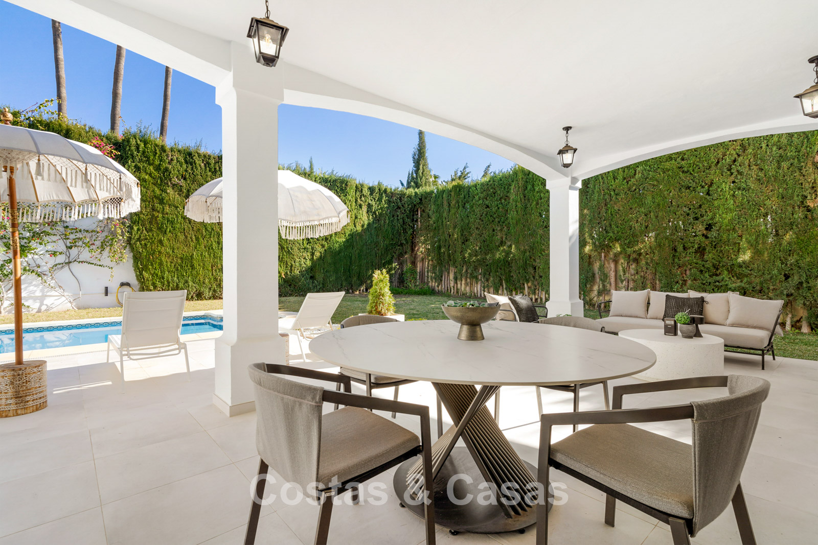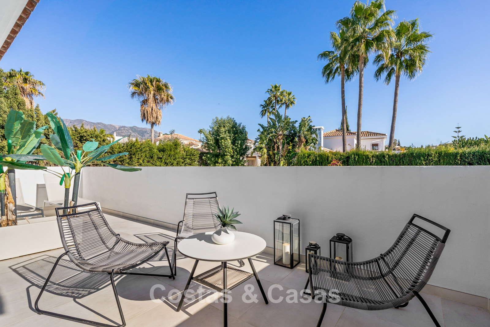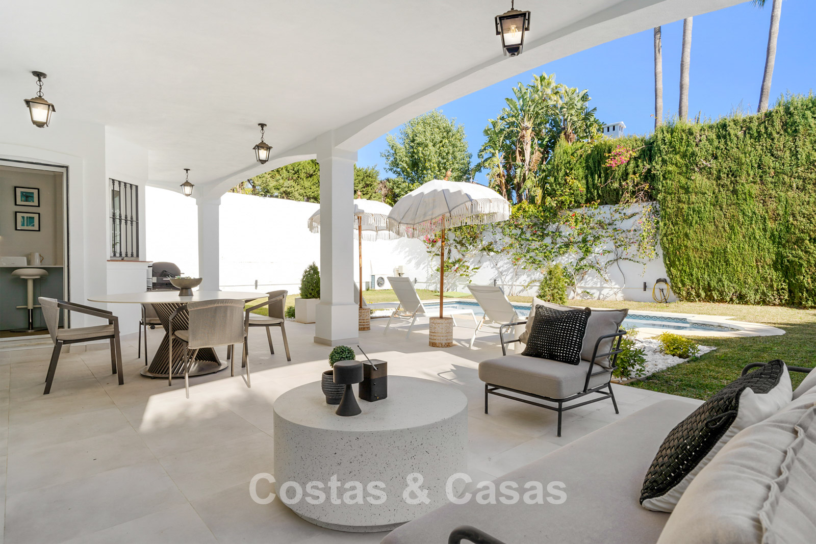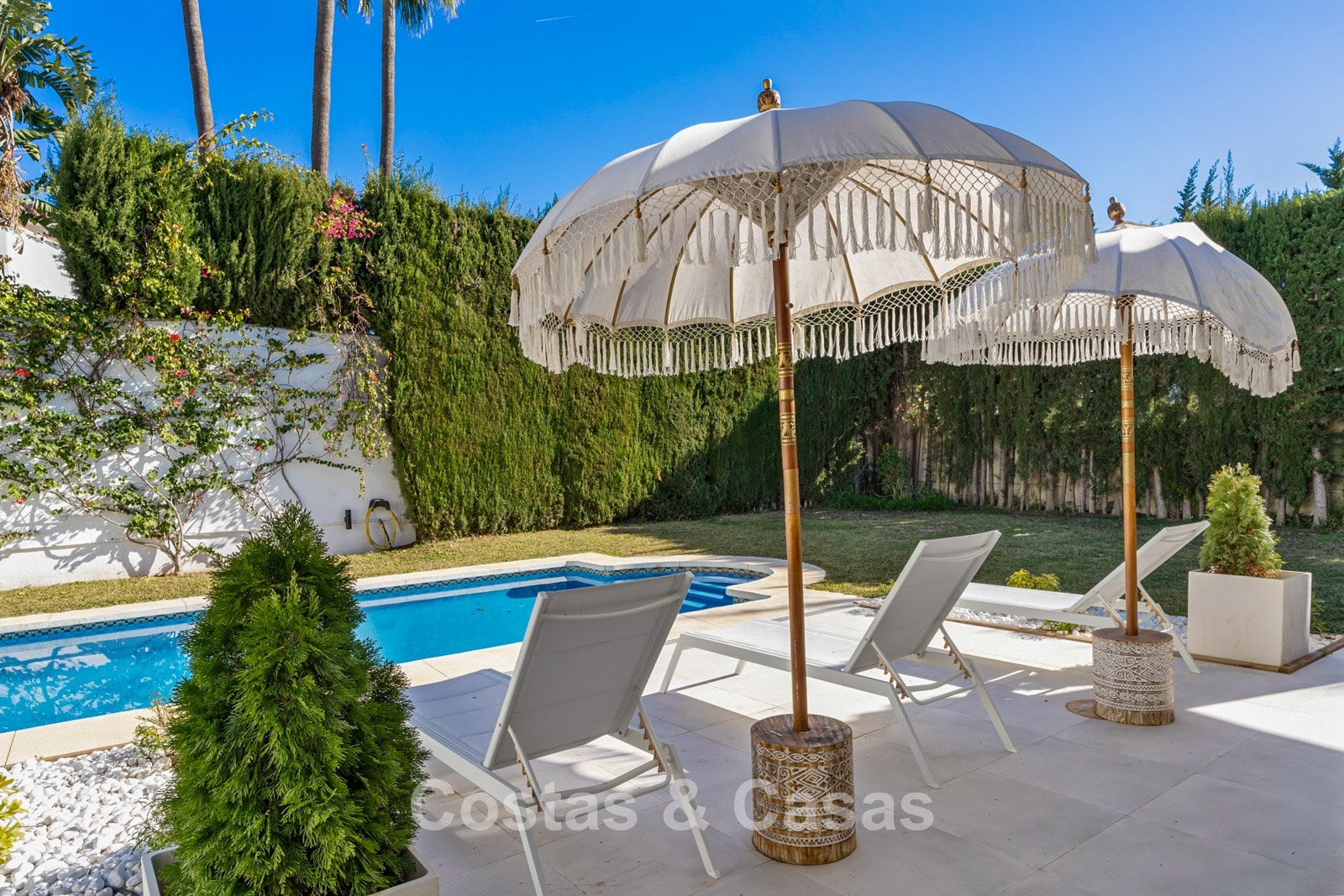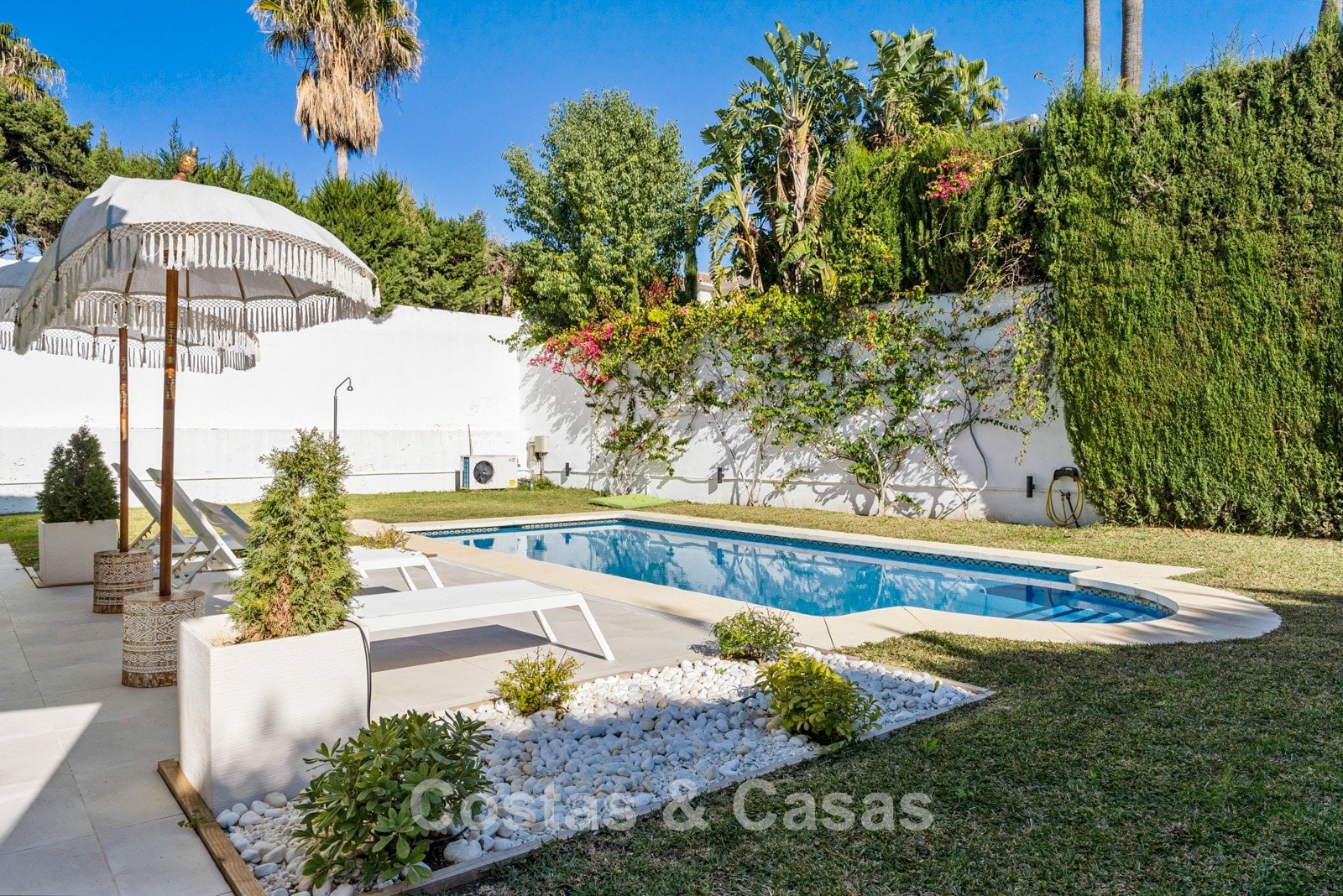 Parcela llana y totalmente vallada, lo que proporciona la privacidad necesaria. Jardín paisajístico cuidado con vegetación tropical y césped. Piscina privada climatizada. La terraza principal cubierta ofrece una zona de relax, comedor y barbacoa. Las terrazas soleadas ofrecen la oportunidad de disfrutar del agradable clima mediterráneo. Orientada al sur. Vista del entorno verde con el paisaje montañoso al fondo.