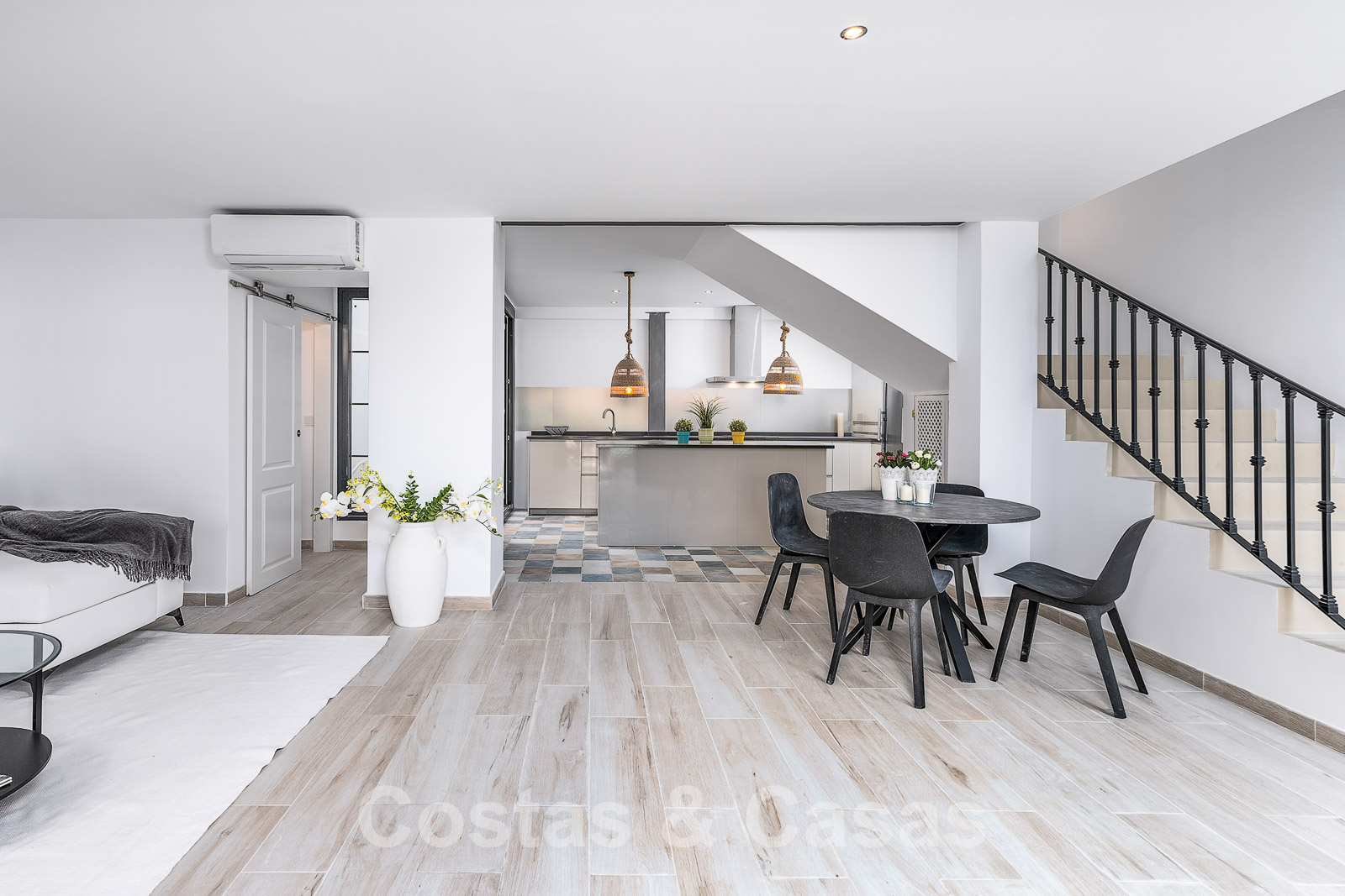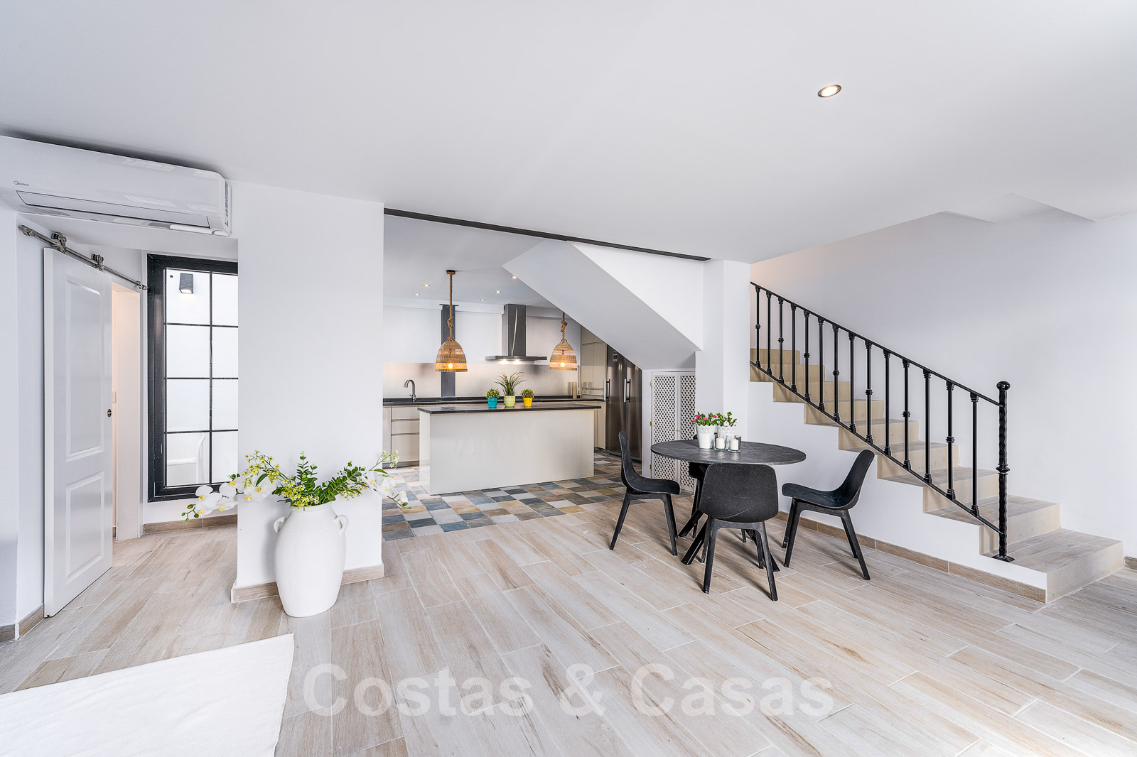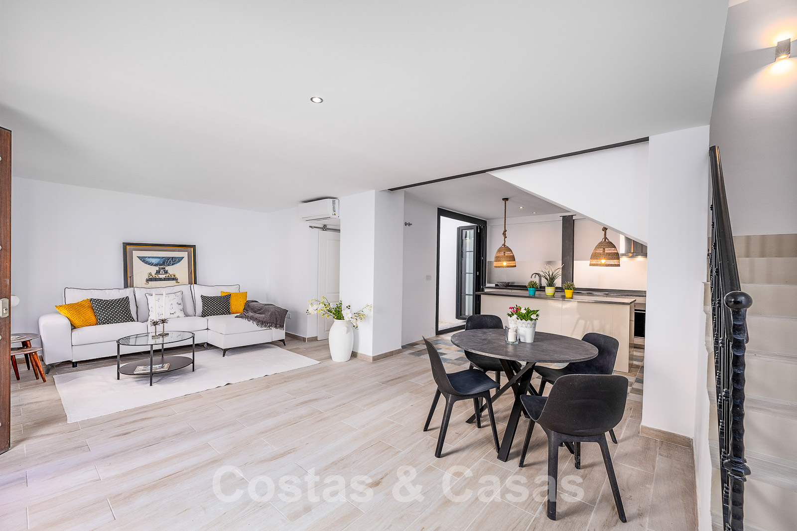 Al entrar, se accede inmediatamente al amplio espacio diáfano con salón, comedor y una cocina abierta que da a un acogedor patio exterior.