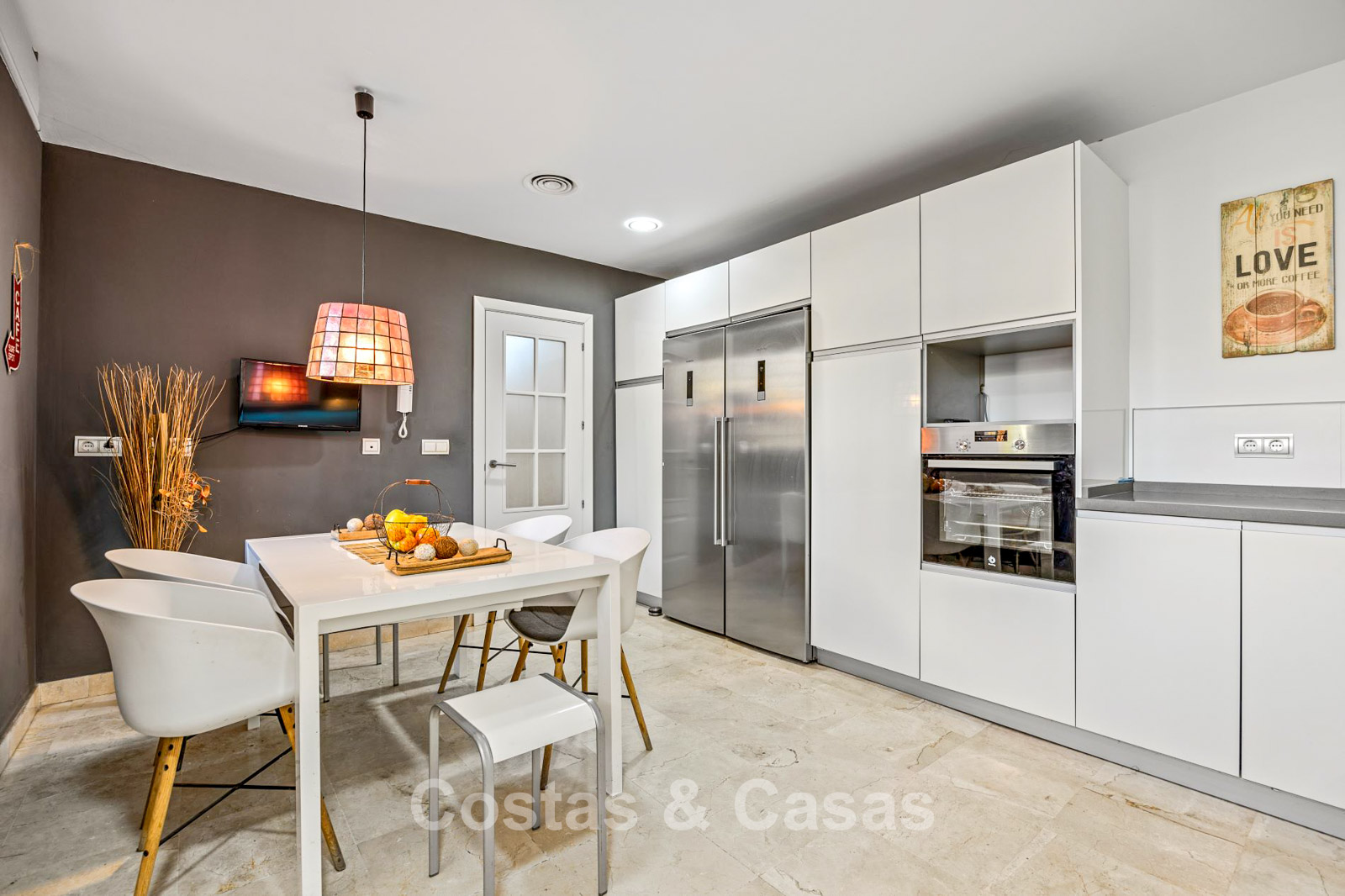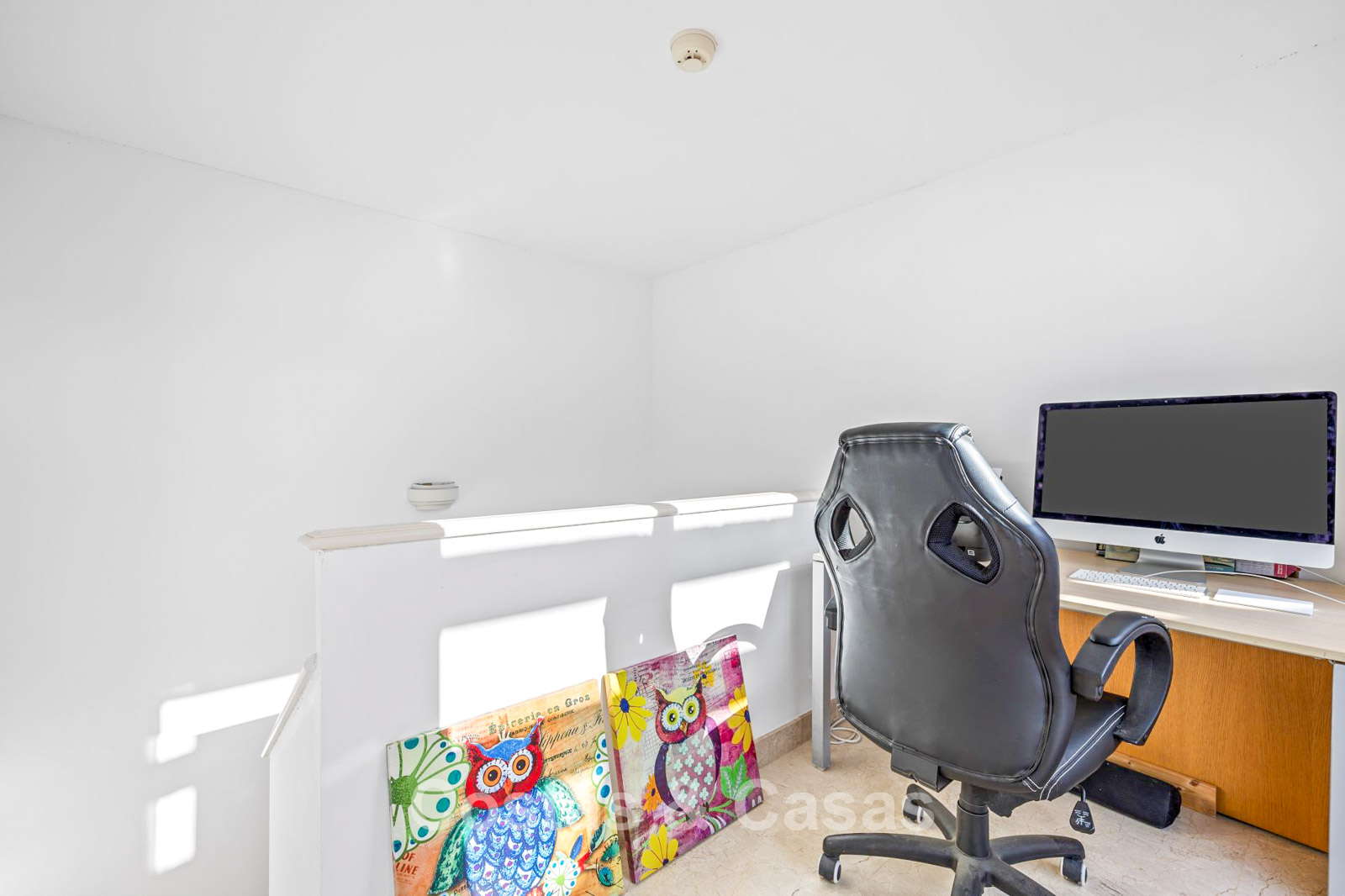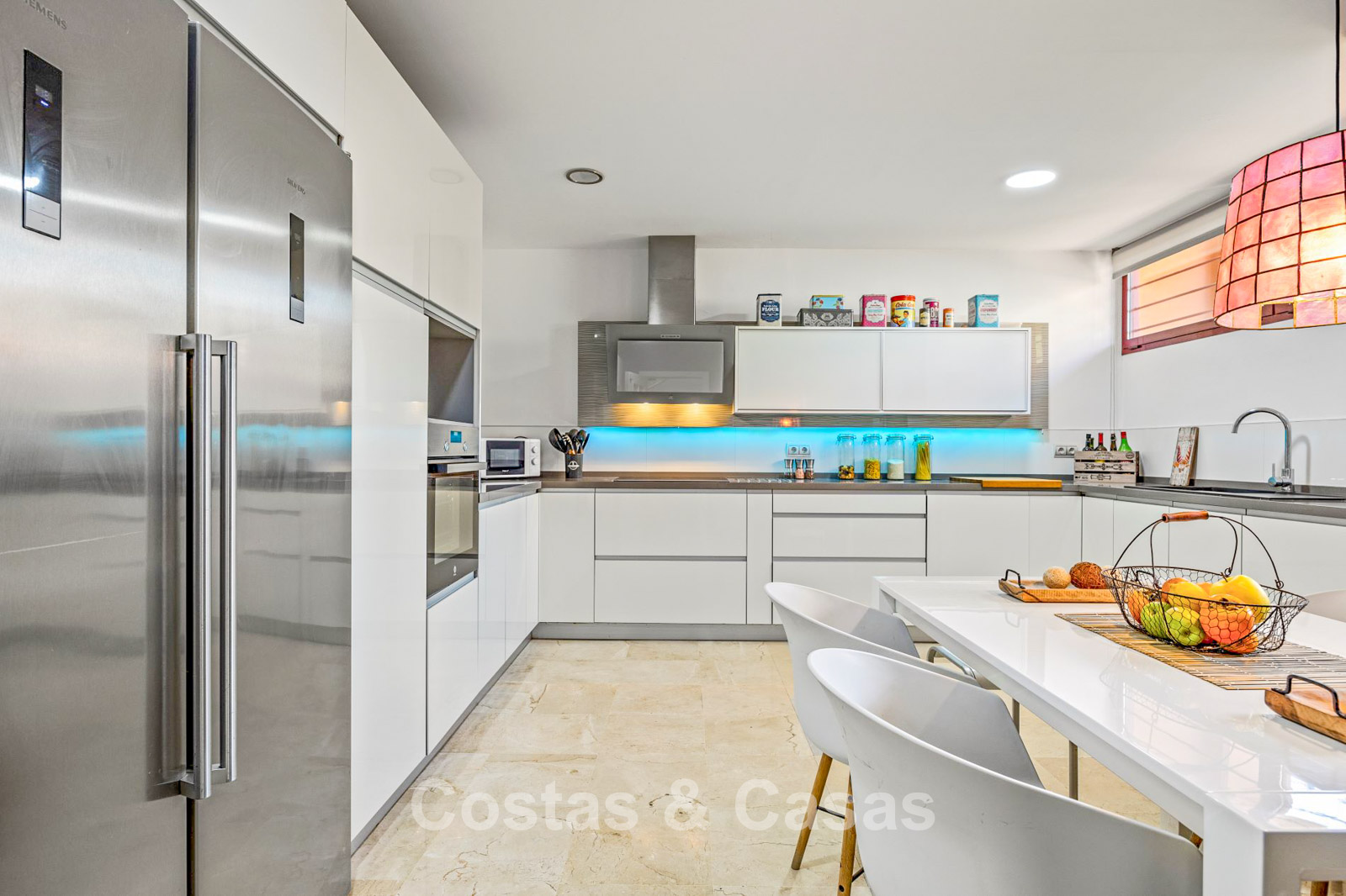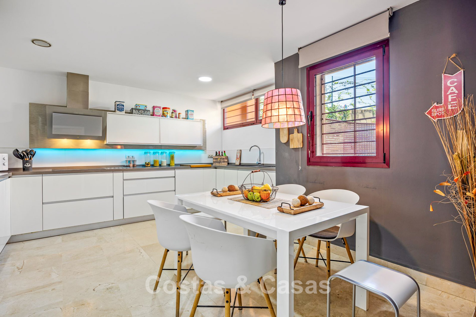 Casa semi adosada en un estilo arquitectónico mediterráneo moderno poco común. Las altas ventanas correderas del salón se abren a la amplia terraza cubierta. Sala de estar de planta abierta con una acogedora sala de televisión y un comedor integrado. Cocina totalmente equipada con electrodomésticos de primera calidad y mesa de comedor. 4 dormitorios, 3 baños y aseo independiente. En la planta inferior hay un alojamiento para invitados o personal con baño privado, sala de estar, cocina americana con mesa de comedor y entrada privada. Suelos de mármol. Trastero. Garaje interior para 2 coches.
