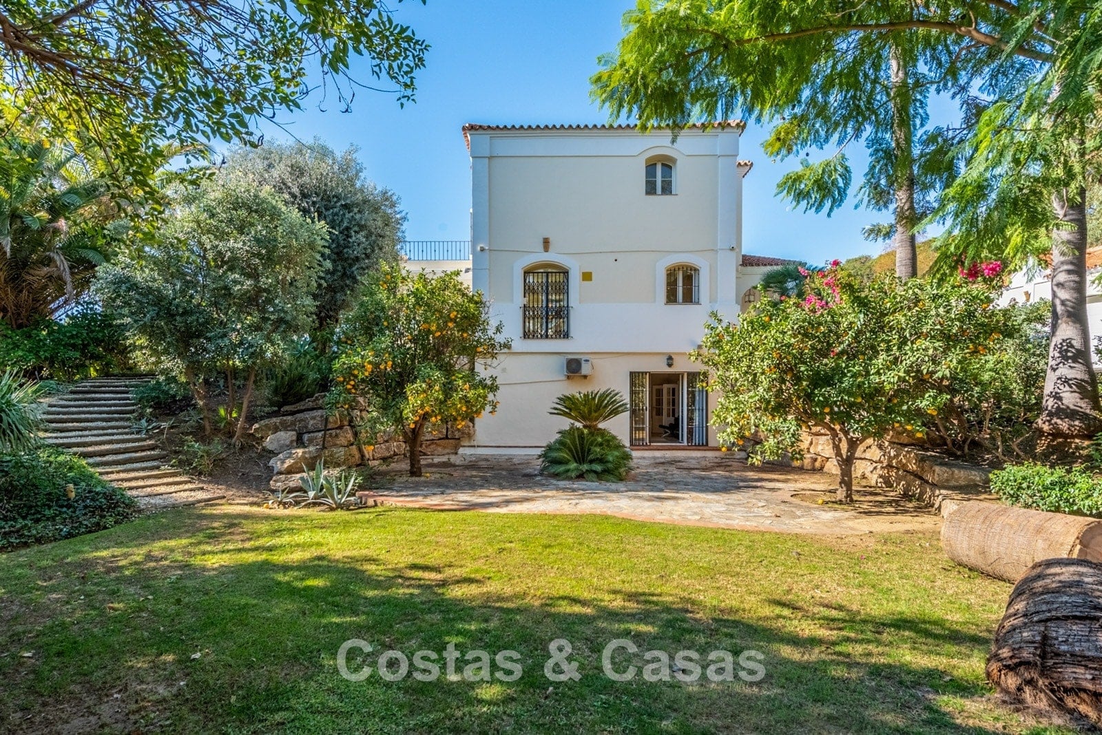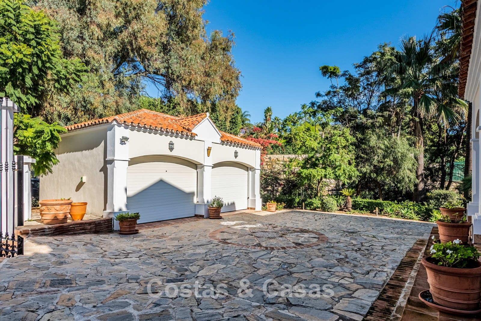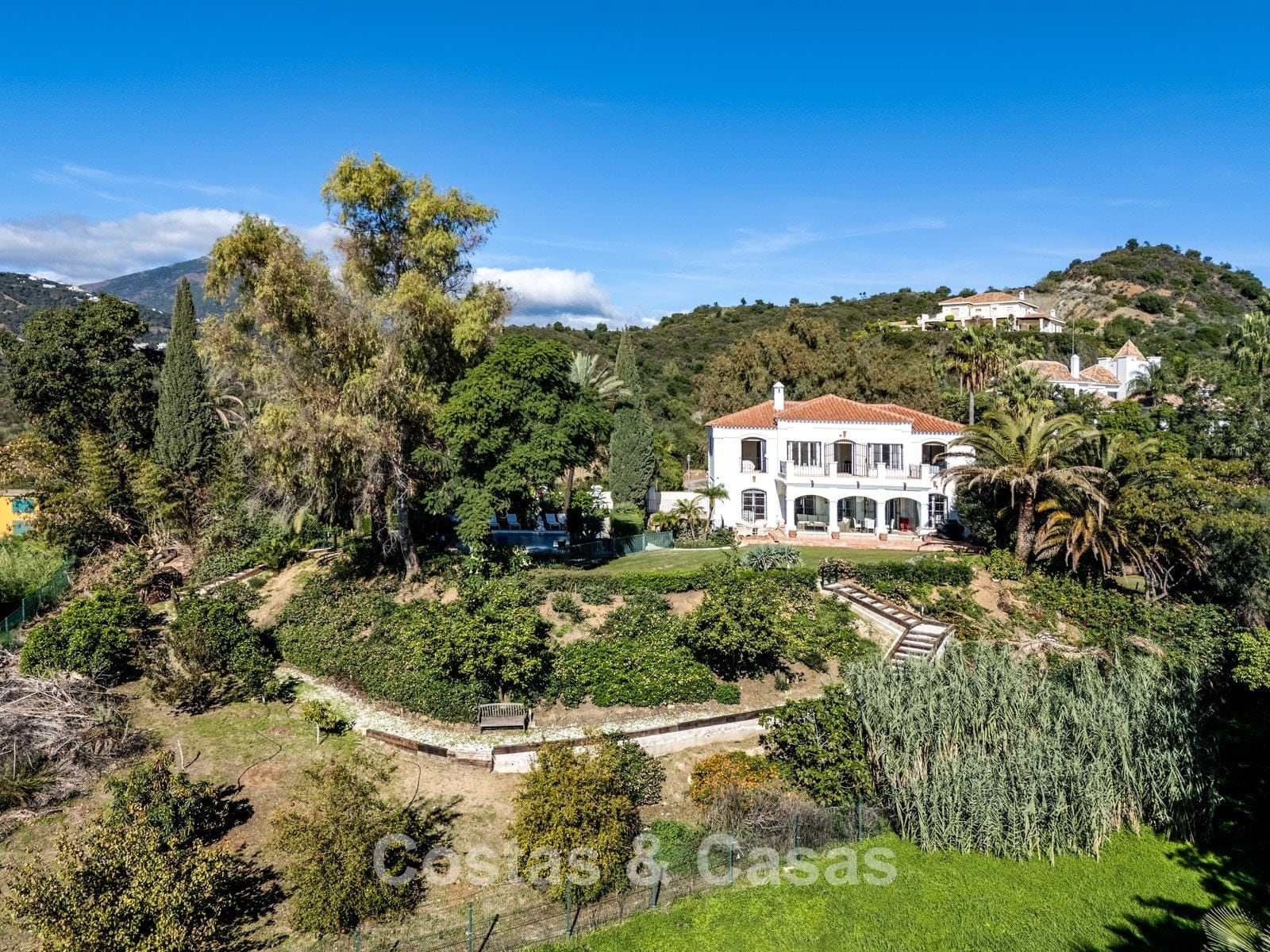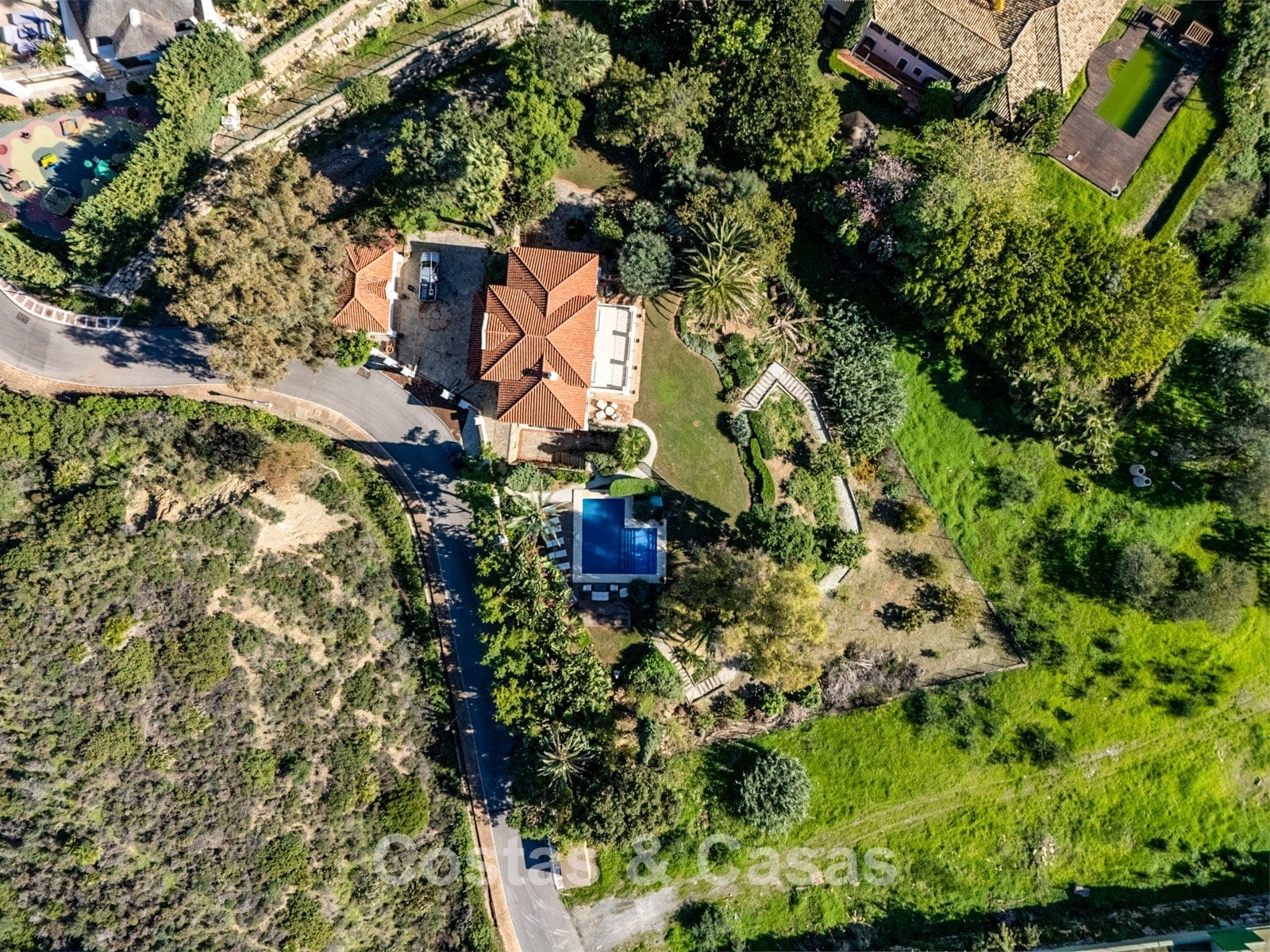 Amplia parcela, rodeada de exuberante vegetación. El jardín maduro irradia tranquilidad con su abundante vegetación. Una terraza anexa cuenta con un acogedor salón de invierno, completamente cerrado con cortinas de cristal, que ofrece comodidad durante todo el año. El espacio exterior se divide en tres zonas: una planta superior con piscina de obra y terrazas, una planta inferior con árboles frutales y un carácter rústico, y un patio ajardinado junto a la sala de juegos. Orientación sur. Extensas vistas a la costa.