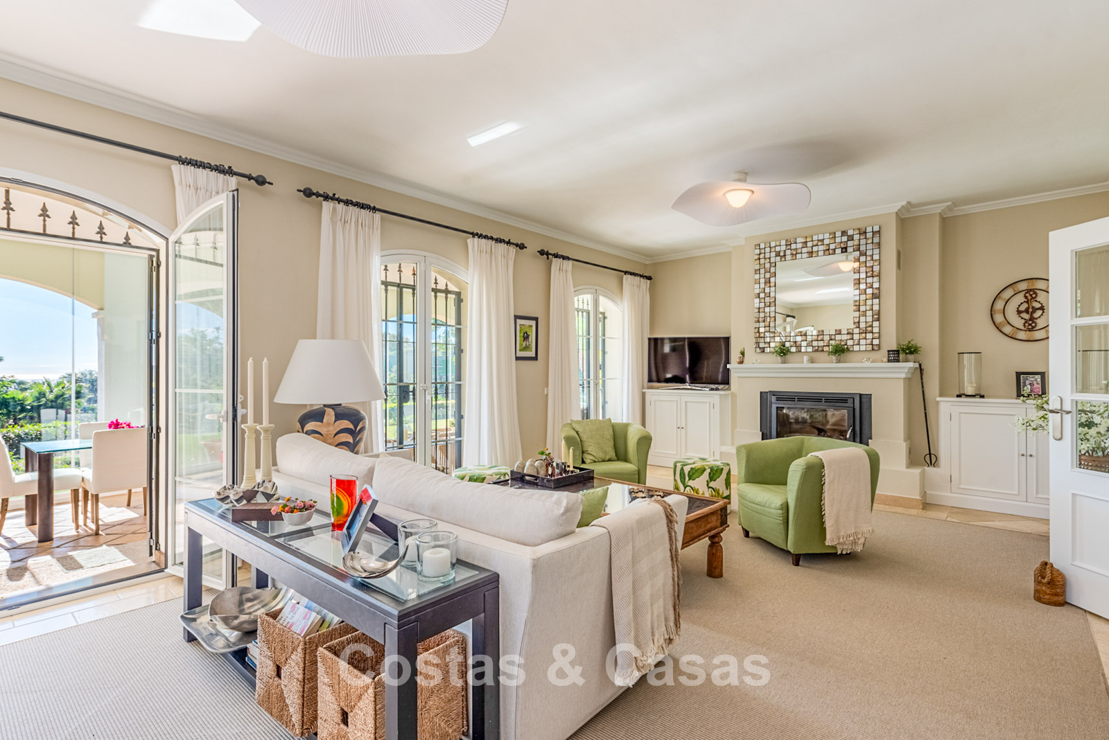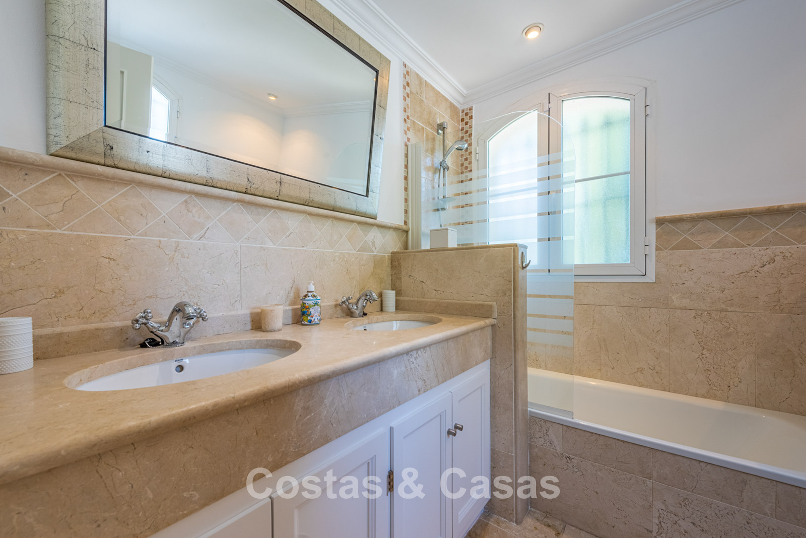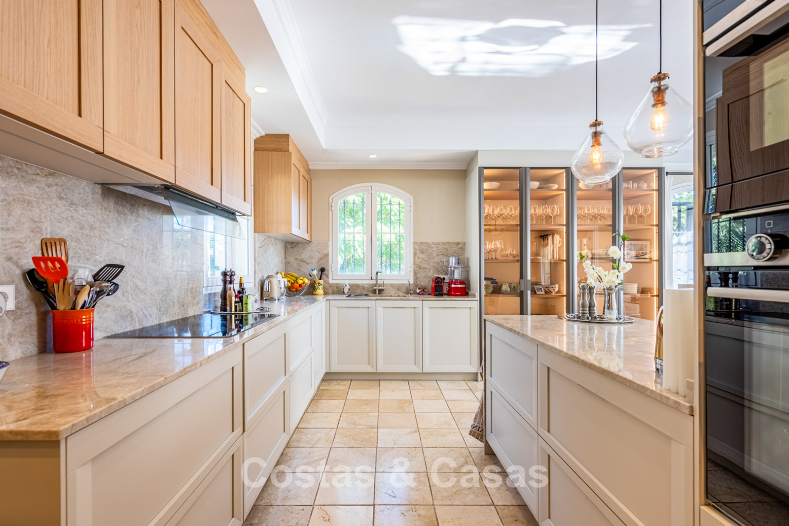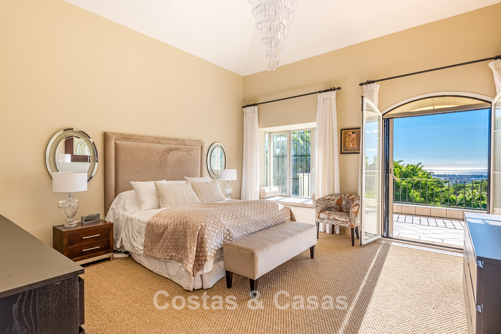 Villa independiente con encantadora arquitectura mediterránea. Recientemente renovada con materiales tradicionales de alta calidad. Un ambiente acogedor y elegante. Un recibidor de doble altura con una escalera que da a la planta superior le da la bienvenida. Un luminoso salón cuenta con una sala de TV, realzada por una encantadora chimenea, y da a una terraza cubierta. Junto a él se encuentra una moderna cocina, totalmente equipada con electrodomésticos y barra americana. Comedor integrado. Los altos ventanales con un elegante arco en la parte superior dejan entrar abundante luz natural y facilitan el acceso al exterior. 5 dormitorios y 5 baños. La suite principal se encuentra en el centro de la planta superior y disfruta de una terraza privada con impresionantes vistas a la vegetación y al mar. En la planta inferior, hay un dormitorio que puede convertirse en alojamiento para invitados o personal, con acceso directo a la zona exterior. Un espacio multifuncional que puede equiparse con una sala de cine o de juegos. Suelos de mármol travertino. Lavandería. Trastero. Garaje integrado para 2 coches.