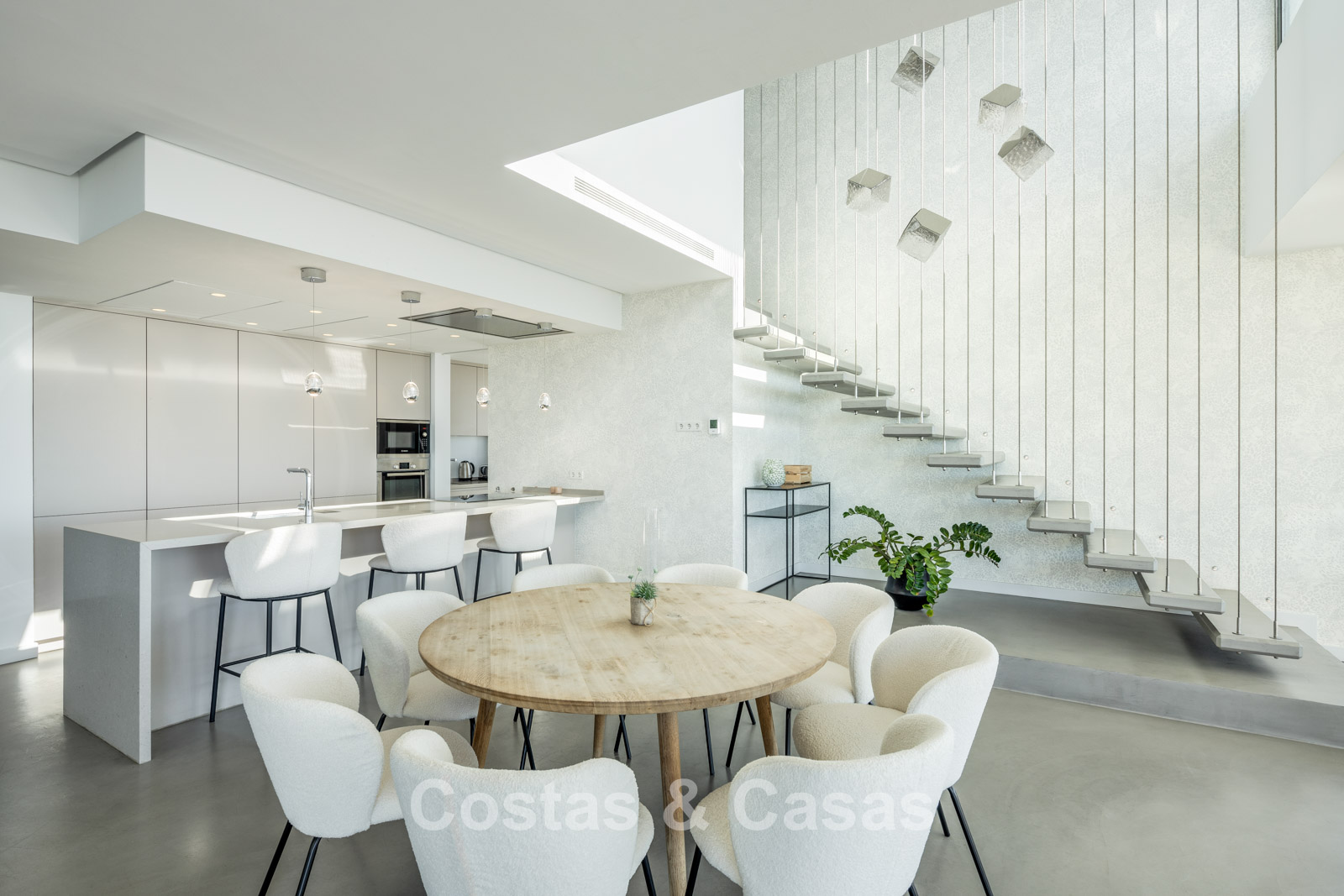 Esta villa tiene una arquitectura moderna y minimalista, diseñada con líneas limpias y un diseño geométrico. Construida con materiales de alta calidad y un acabado refinado. El interior respira una atmósfera serena gracias a la abundante luz natural y la paleta de colores suaves. Grandes ventanales correderos de suelo a techo ofrecen impresionantes vistas al mar y al paisaje circundante. Diseño de planta abierta. Un salón lujoso y luminoso con una decoración moderna y minimalista. Cocina comedor blanca elegante y totalmente equipada con electrodomésticos de alta calidad y una acogedora isla para sentarse. Junto a un cuarto de servicio/lavandería. Comedor integrado con techo iluminado de doble altura. La escalera de diseño flotante añade un acento arquitectónico al espacio habitable. 4 dormitorios, 4 baños y aseo independiente. Una sala multifuncional estará equipada con un cine y una zona de juegos. El suelo moldeado proporciona un acabado elegante y moderno con una apariencia suave y sin costuras. Trastero. Sala técnica. Cochera para 2 autos.