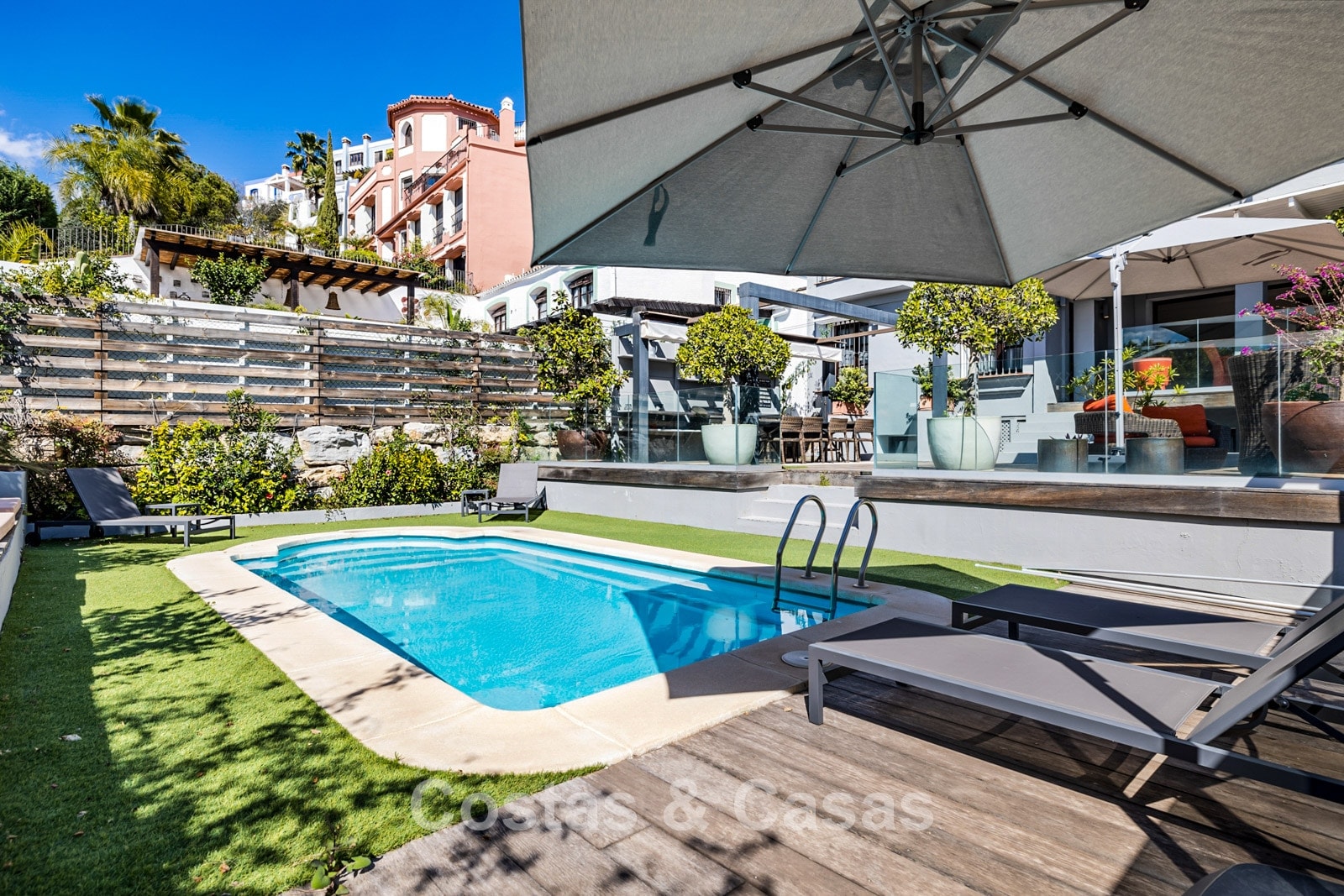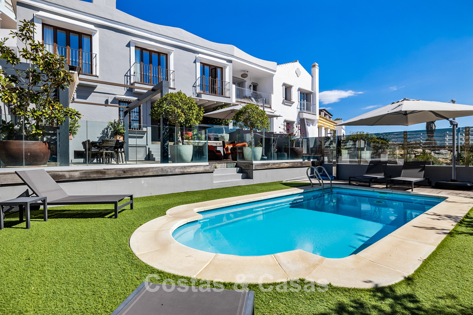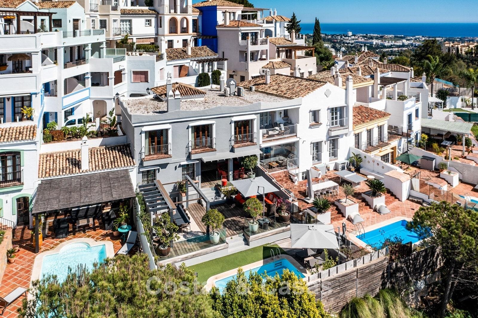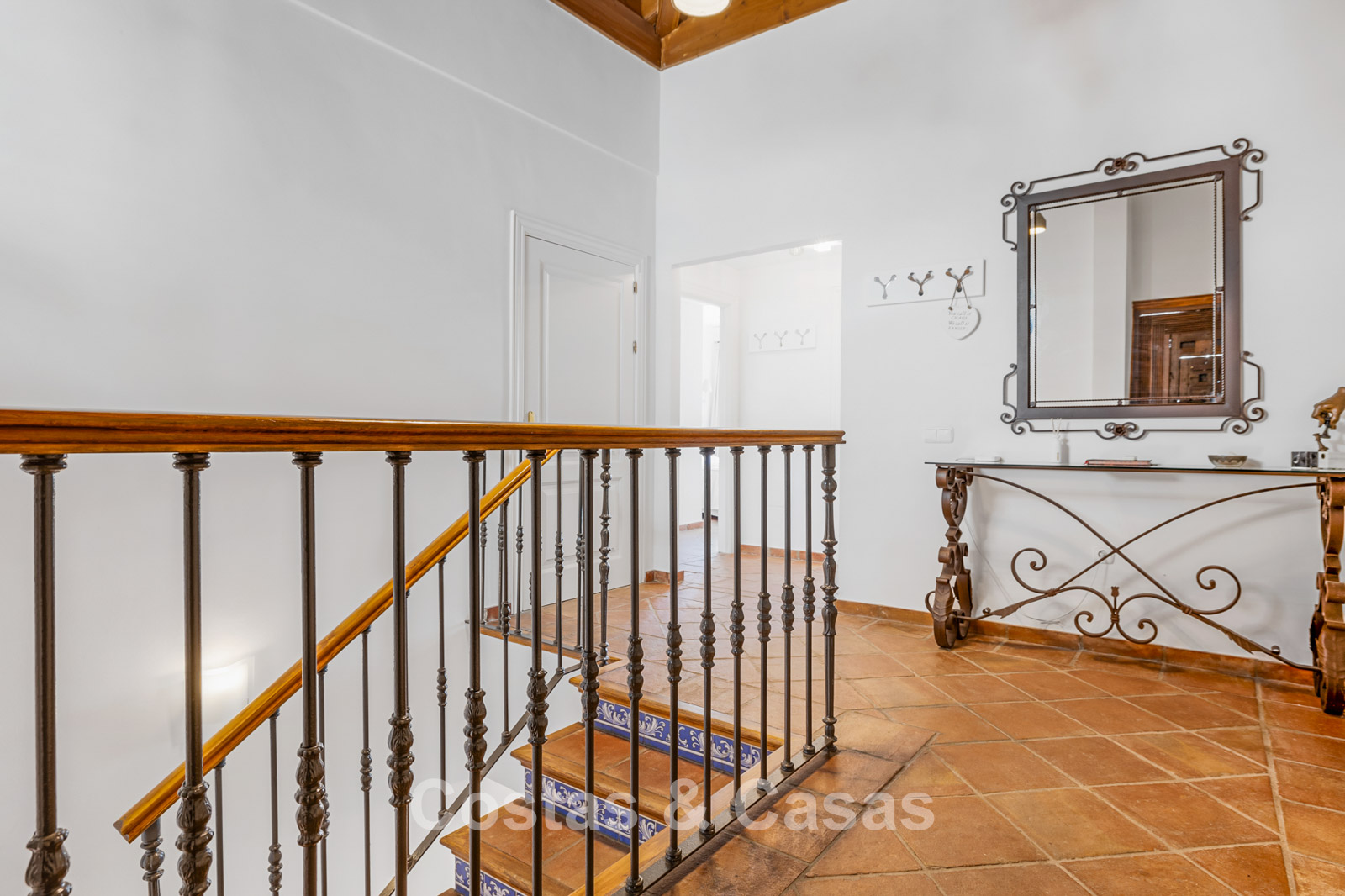 Casa adosada con un encanto andaluz atemporal. Recientemente reformada parcialmente con materiales de alta calidad. Situada al suroeste. Una terraza cubierta ofrece zona de comedor y se abre a un patio amplio y soleado. Piscina privada rodeada de tumbonas. Una terraza con pérgola está equipada con una cocina al aire libre, una zona de barbacoa y un comedor al aire libre. Amplias vistas al paisaje montañoso y al mar Mediterráneo. Los grandes ventanales dejan entrar abundante luz natural, creando una casa amplia y luminosa. Sala de estar de concepto abierto con sala de TV junto a la chimenea. Práctica cocina abierta con electrodomésticos Bosch y barra de desayuno. 5 dormitorios, 4 baños y aseo independiente. Suelos de mármol. Cuarto de lavado. Garaje interior para un coche.