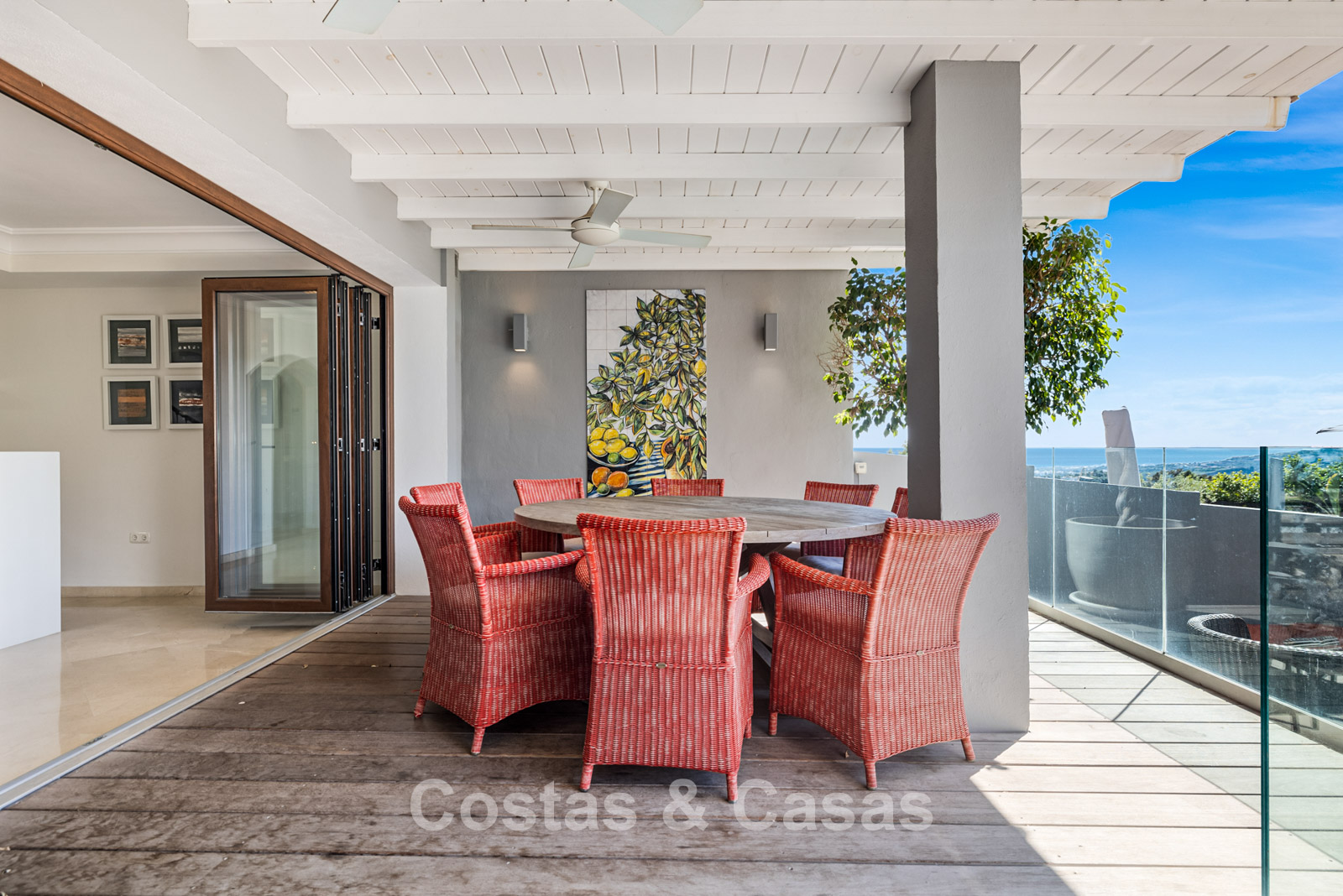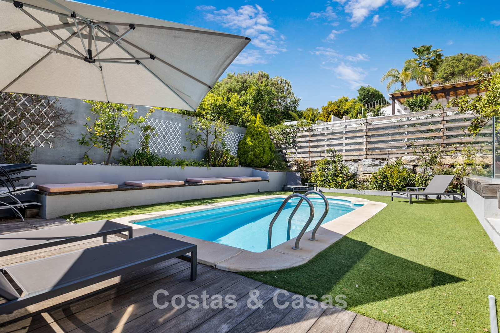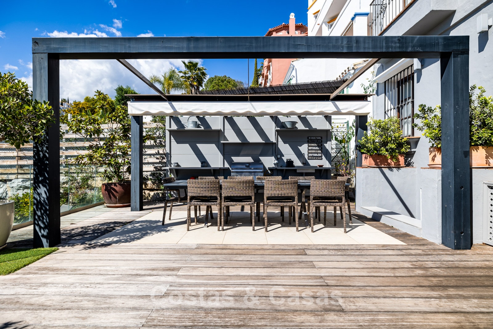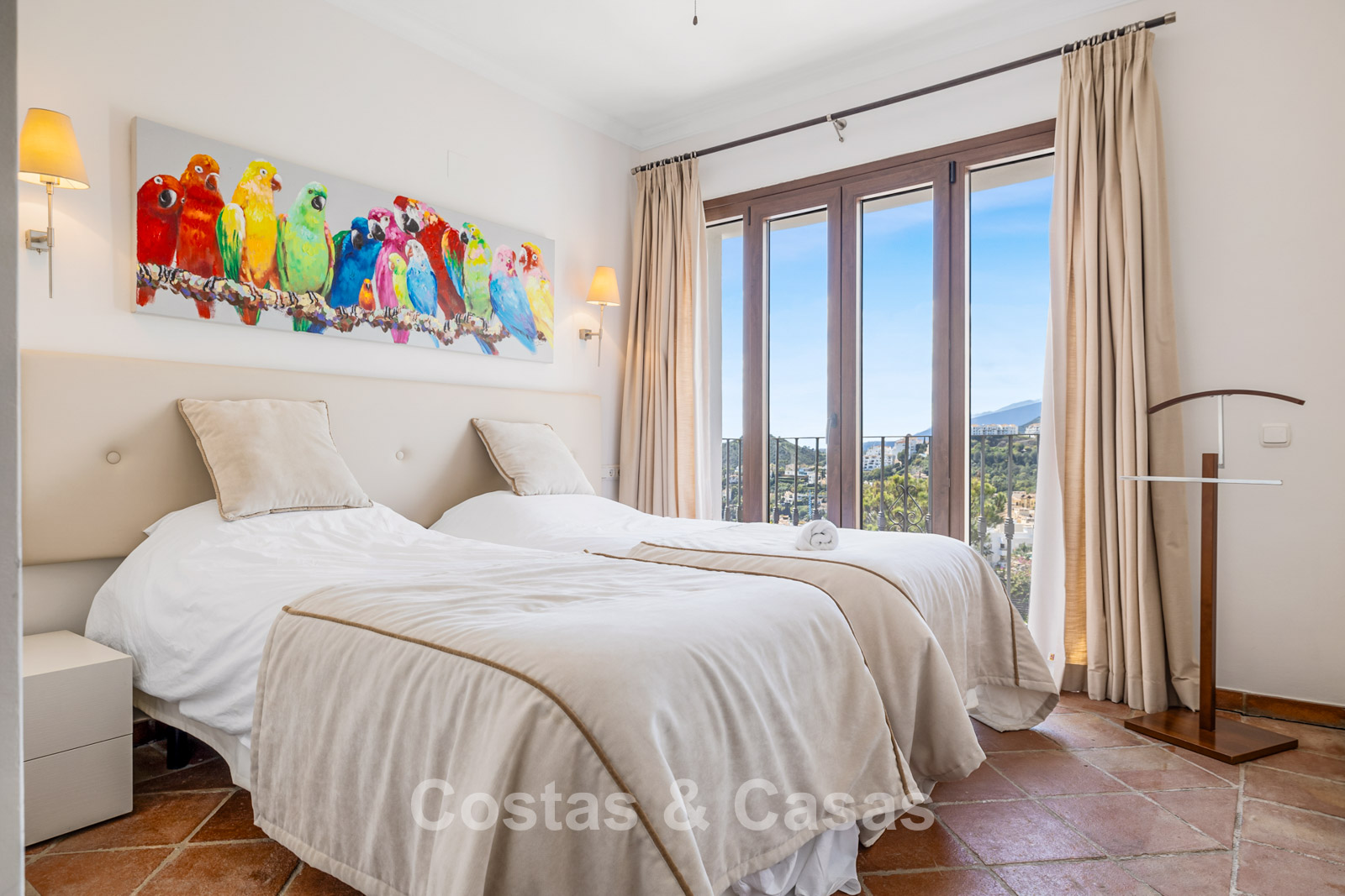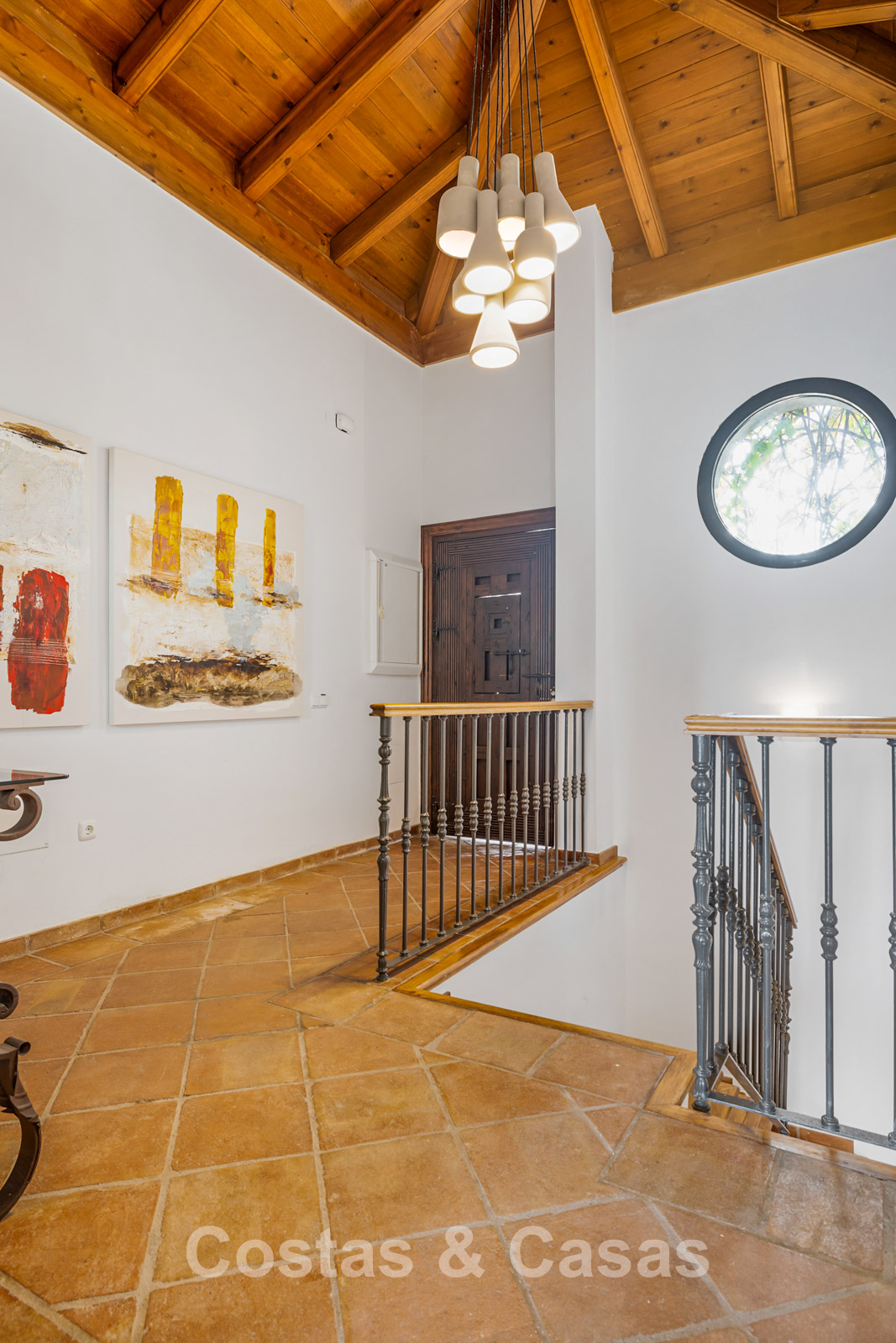 Casa adosada con un encanto andaluz atemporal. Recientemente reformada parcialmente con materiales de alta calidad. Situada al suroeste. Una terraza cubierta ofrece zona de comedor y se abre a un patio amplio y soleado. Piscina privada rodeada de tumbonas. Una terraza con pérgola está equipada con una cocina al aire libre, una zona de barbacoa y un comedor al aire libre. Amplias vistas al paisaje montañoso y al mar Mediterráneo. Los grandes ventanales dejan entrar abundante luz natural, creando una casa amplia y luminosa. Sala de estar de concepto abierto con sala de TV junto a la chimenea. Práctica cocina abierta con electrodomésticos Bosch y barra de desayuno. 5 dormitorios, 4 baños y aseo independiente. Suelos de mármol. Cuarto de lavado. Garaje interior para un coche.