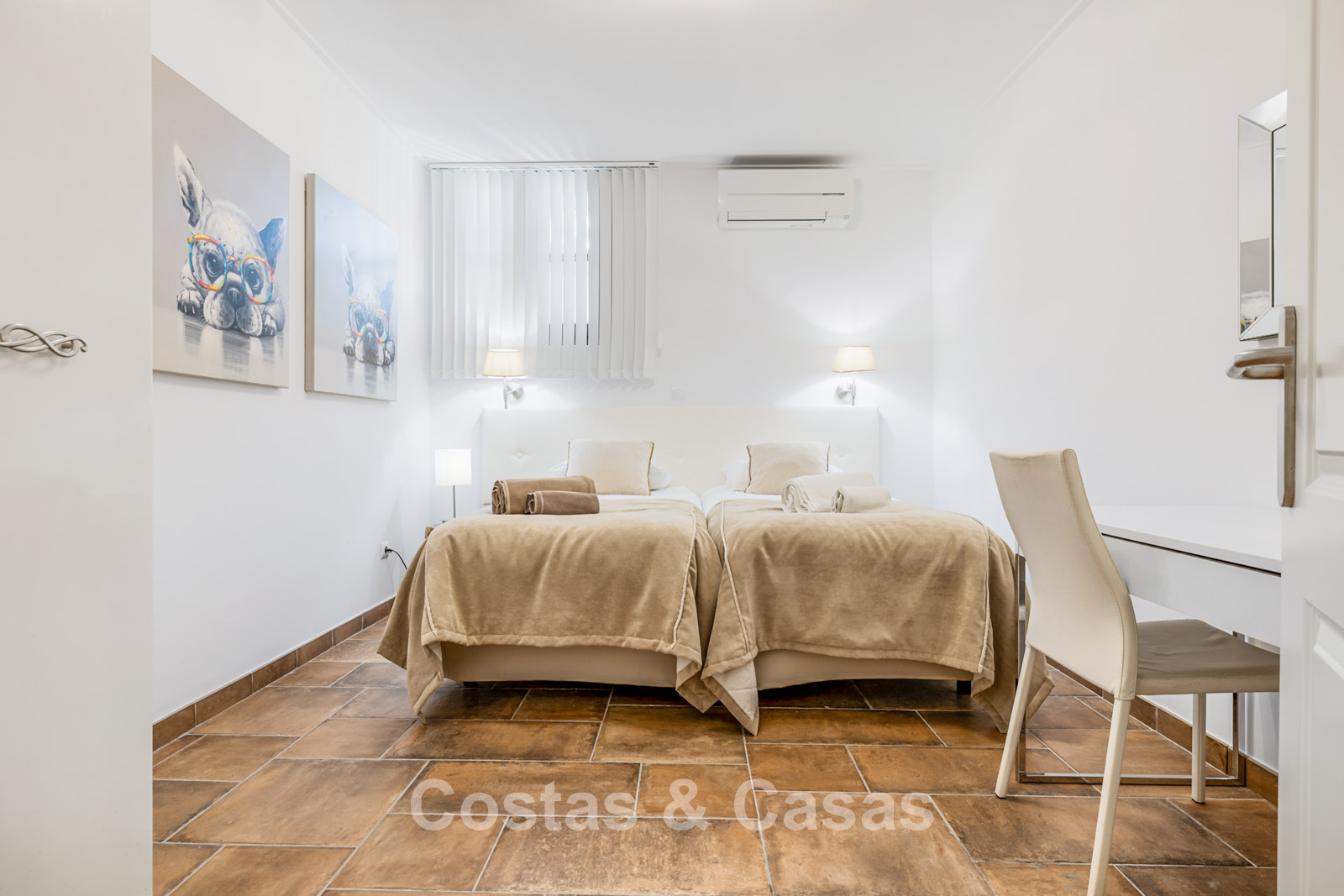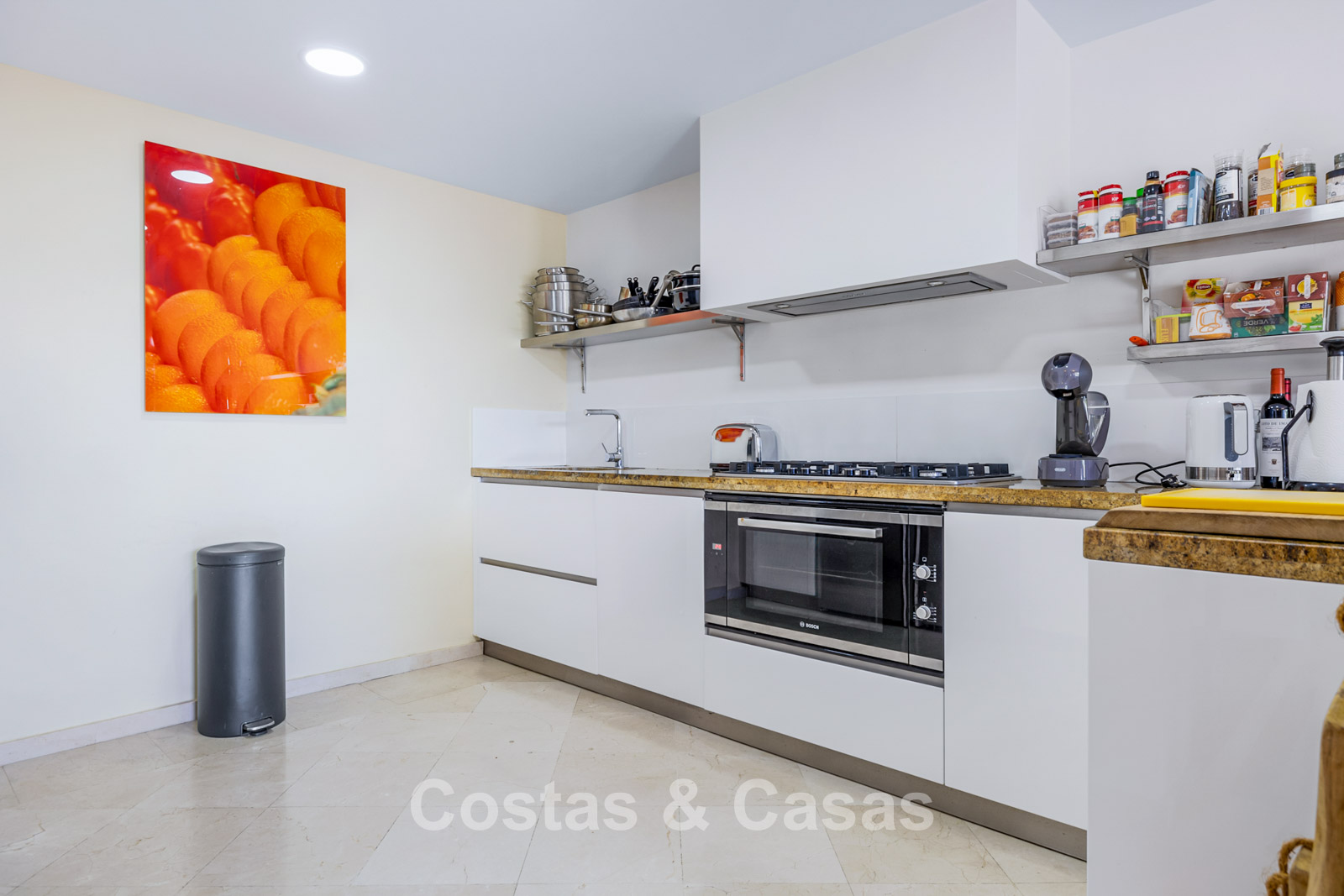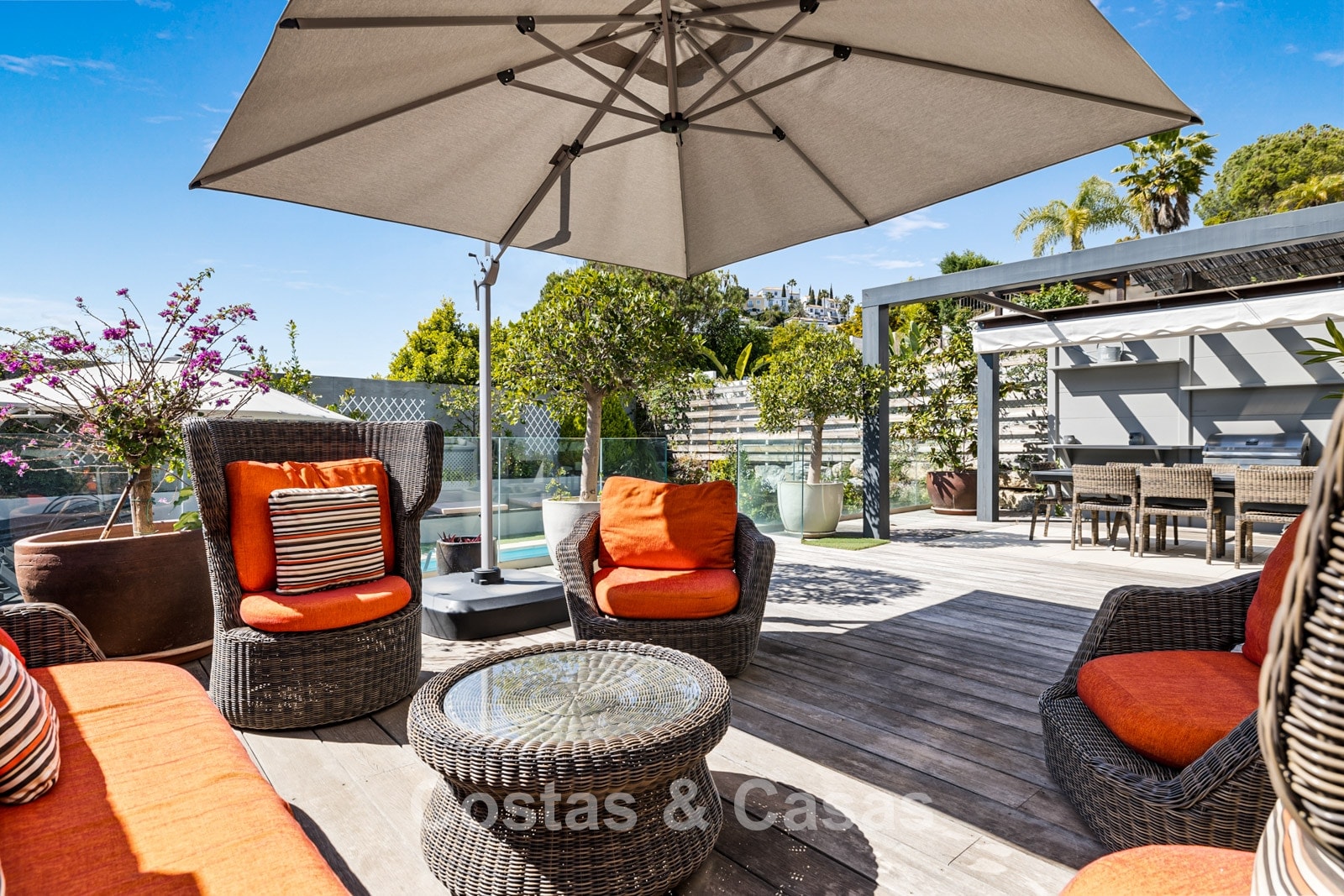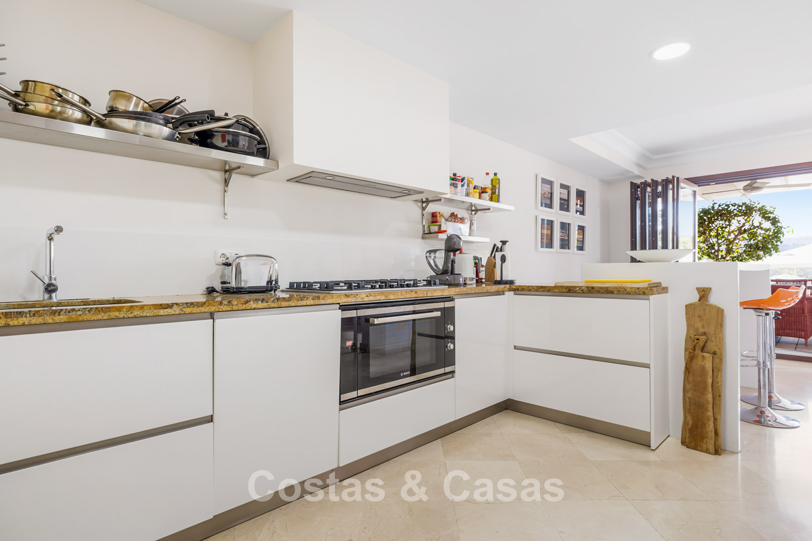 Casa adosada con un encanto andaluz atemporal. Recientemente reformada parcialmente con materiales de alta calidad. Situada al suroeste. Una terraza cubierta ofrece zona de comedor y se abre a un patio amplio y soleado. Piscina privada rodeada de tumbonas. Una terraza con pérgola está equipada con una cocina al aire libre, una zona de barbacoa y un comedor al aire libre. Amplias vistas al paisaje montañoso y al mar Mediterráneo. Los grandes ventanales dejan entrar abundante luz natural, creando una casa amplia y luminosa. Sala de estar de concepto abierto con sala de TV junto a la chimenea. Práctica cocina abierta con electrodomésticos Bosch y barra de desayuno. 5 dormitorios, 4 baños y aseo independiente. Suelos de mármol. Cuarto de lavado. Garaje interior para un coche.