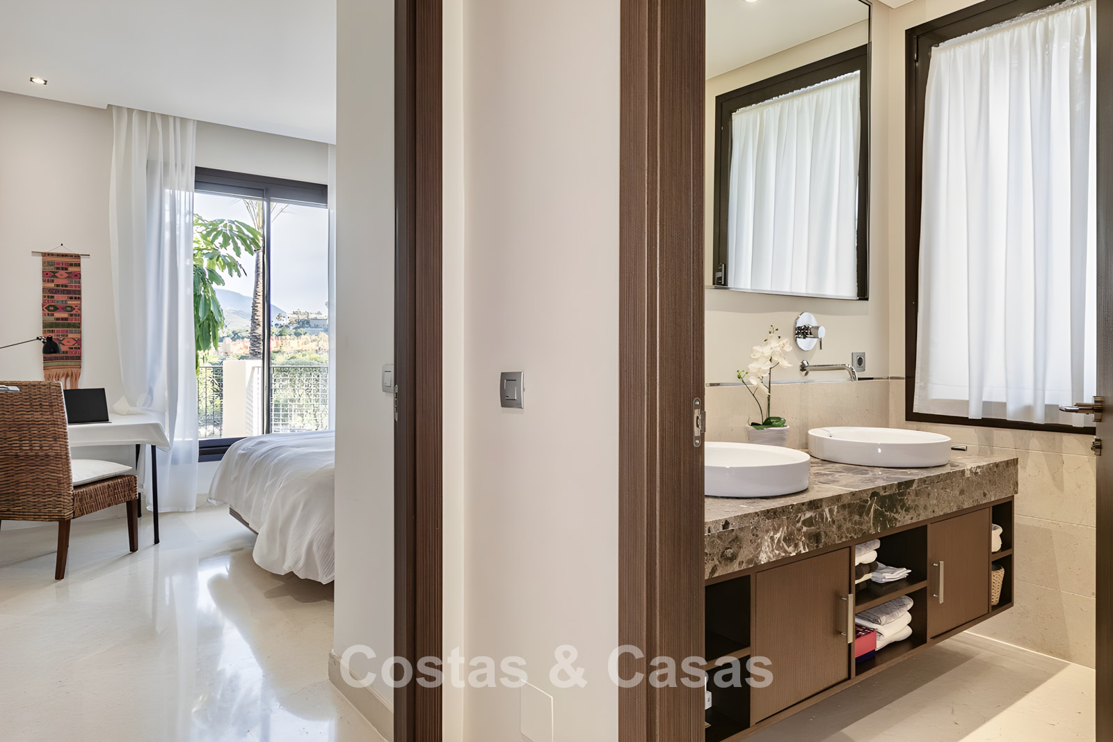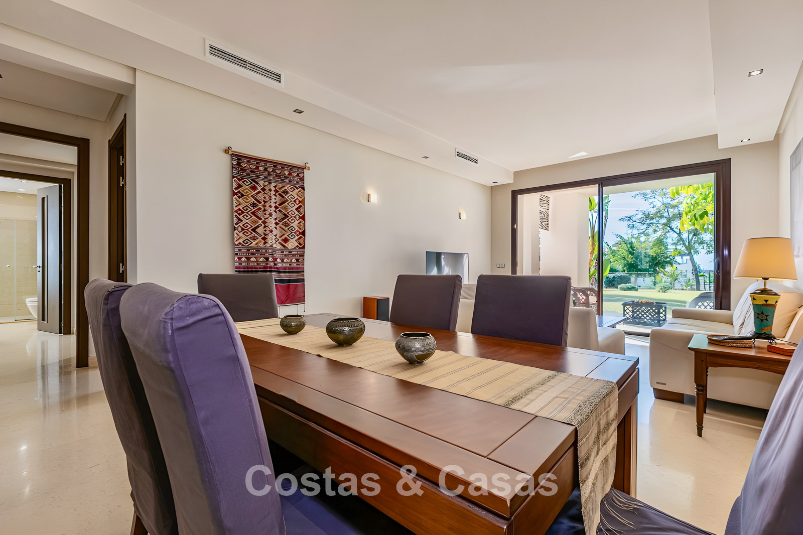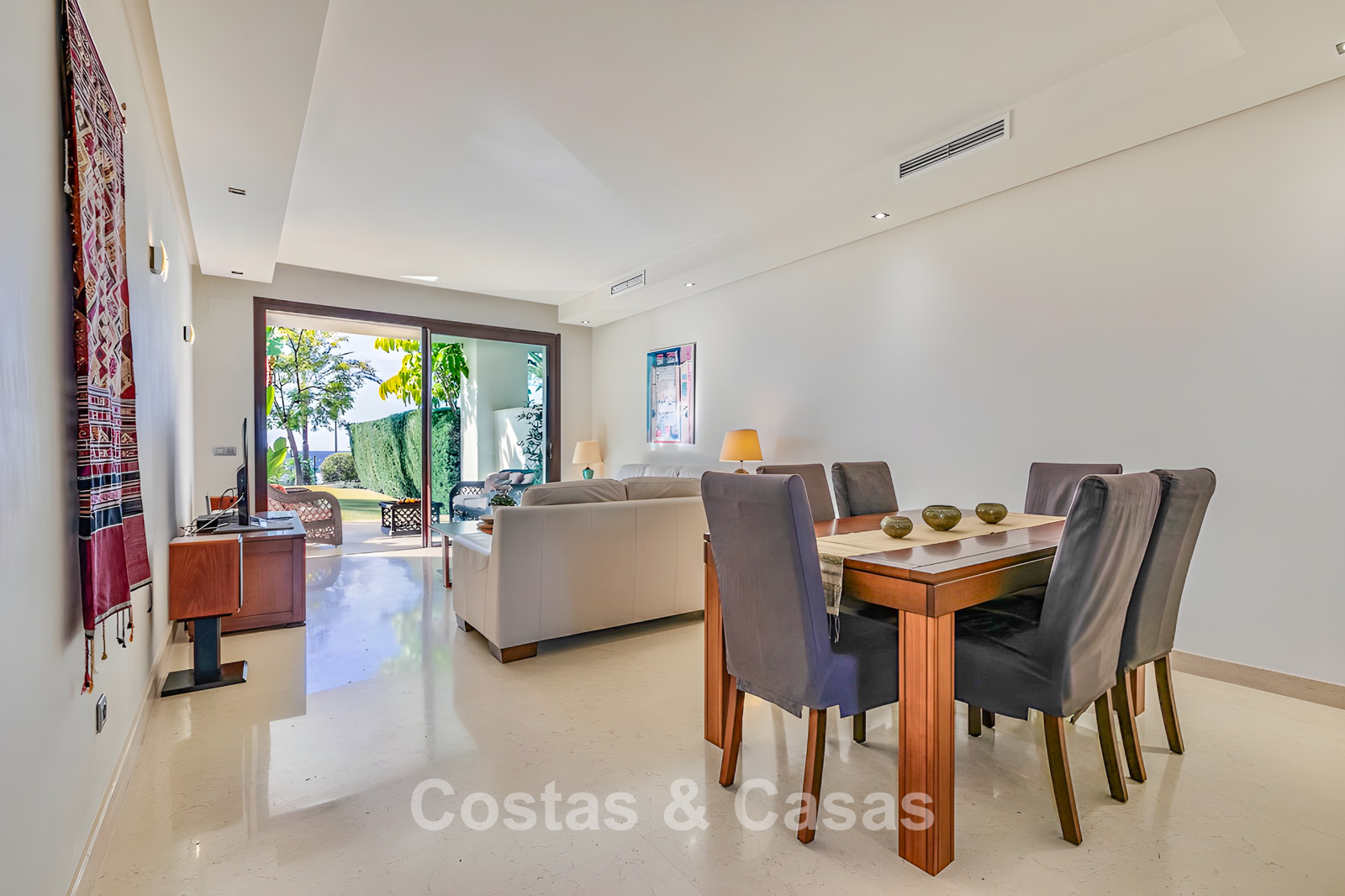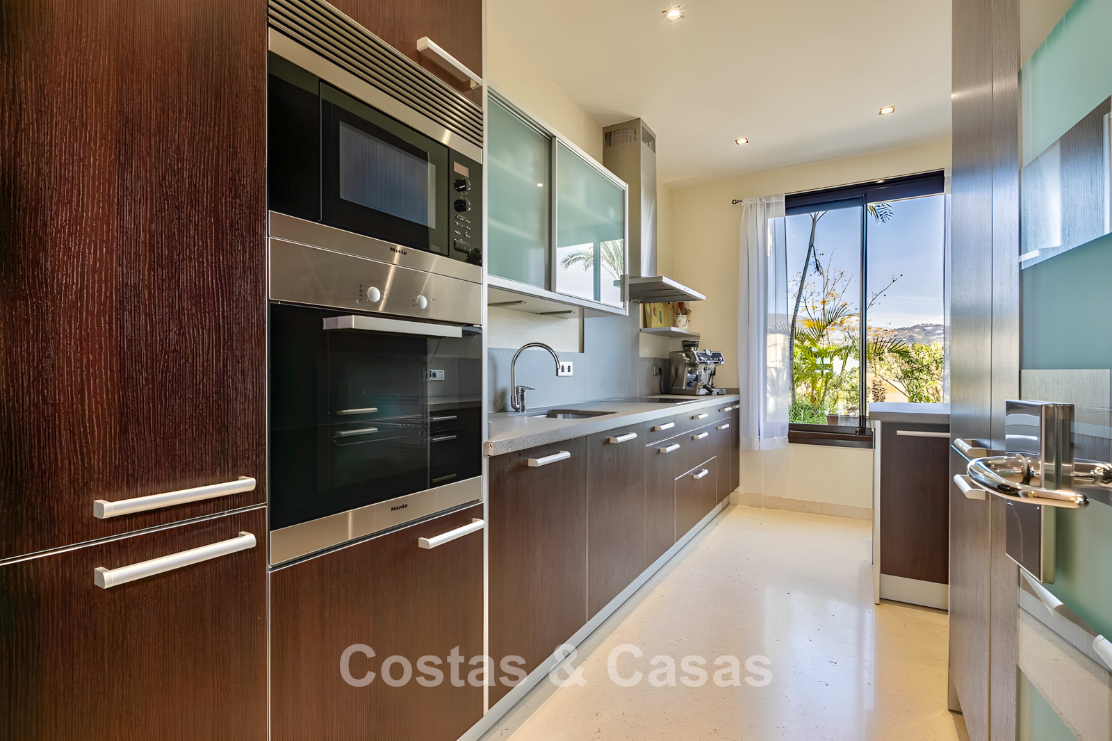 Apartamento en planta baja. Utilizando materiales de calidad y un acabado de alta calidad. Orientada al suroeste. Vista del jardín, del paisaje montañoso circundante y del mar Mediterráneo. El espacioso jardín privado de 202m² es mantenido por la comunidad y ofrece acceso directo a la gran piscina comunitaria. Las altas ventanas corredizas con perfiles empotrados en la sala de estar proporcionan abundante luz natural. Distribución de planta abierta. Amplia sala de estar con sala de TV y comedor. Cocina independiente y práctica con mucho espacio de almacenamiento, electrodomésticos Miele y un acogedor comedor. 3 dormitorios, 2 baños. La suite principal cuenta con un vestidor y un elegante baño en suite, completo con bañera de hidromasaje y ducha separada. Dos de los tres dormitorios también ofrecen acceso directo a la terraza y al jardín, lo que crea una experiencia de vida interior y exterior perfecta. Suelos de mármol. Trastero. Parking subterráneo privado.