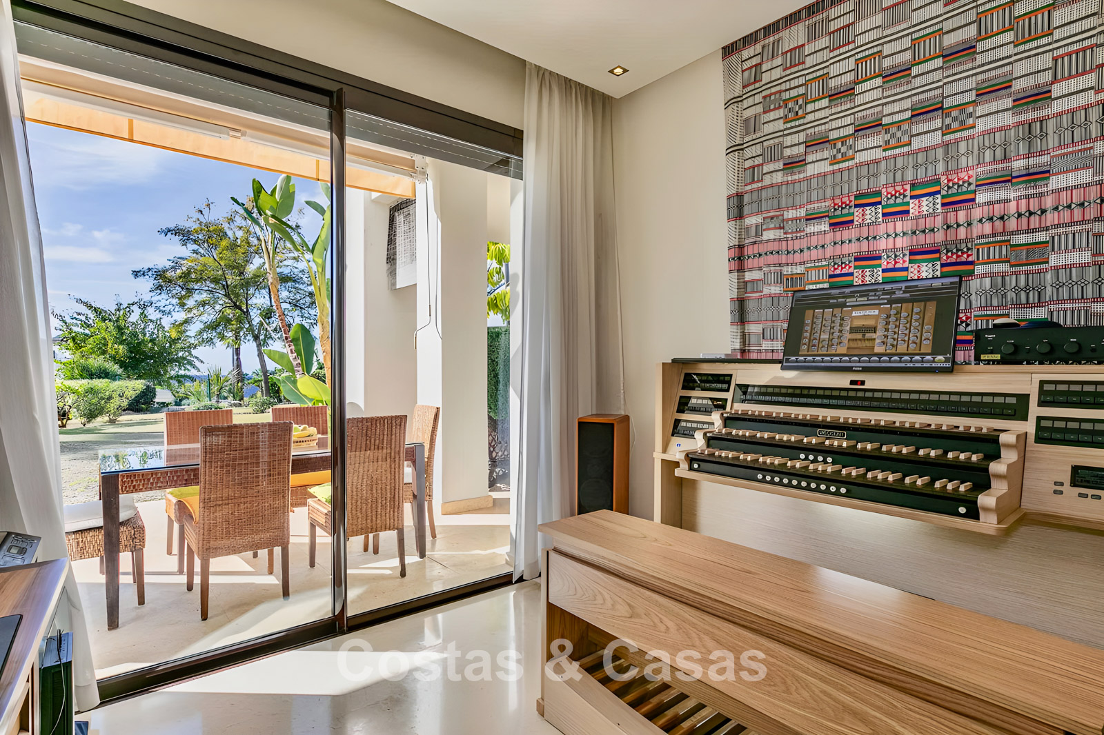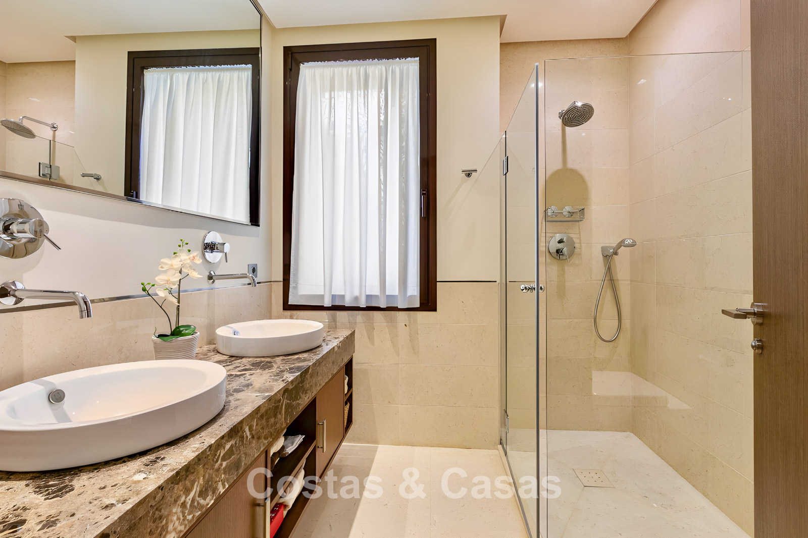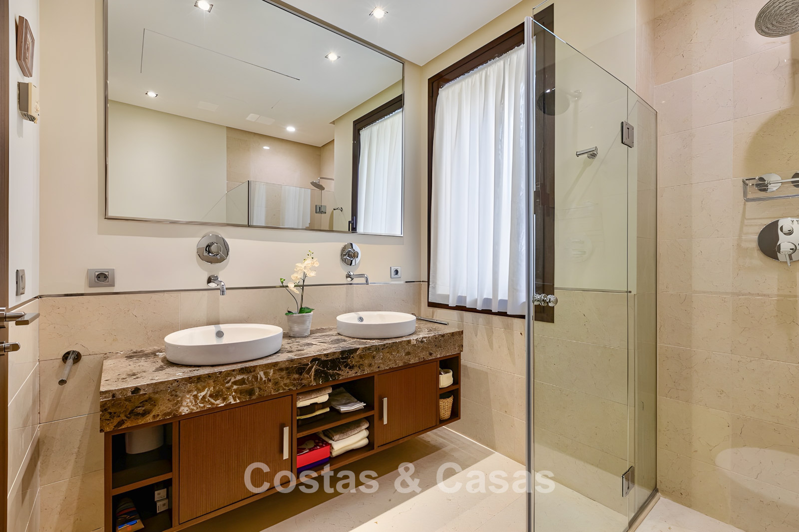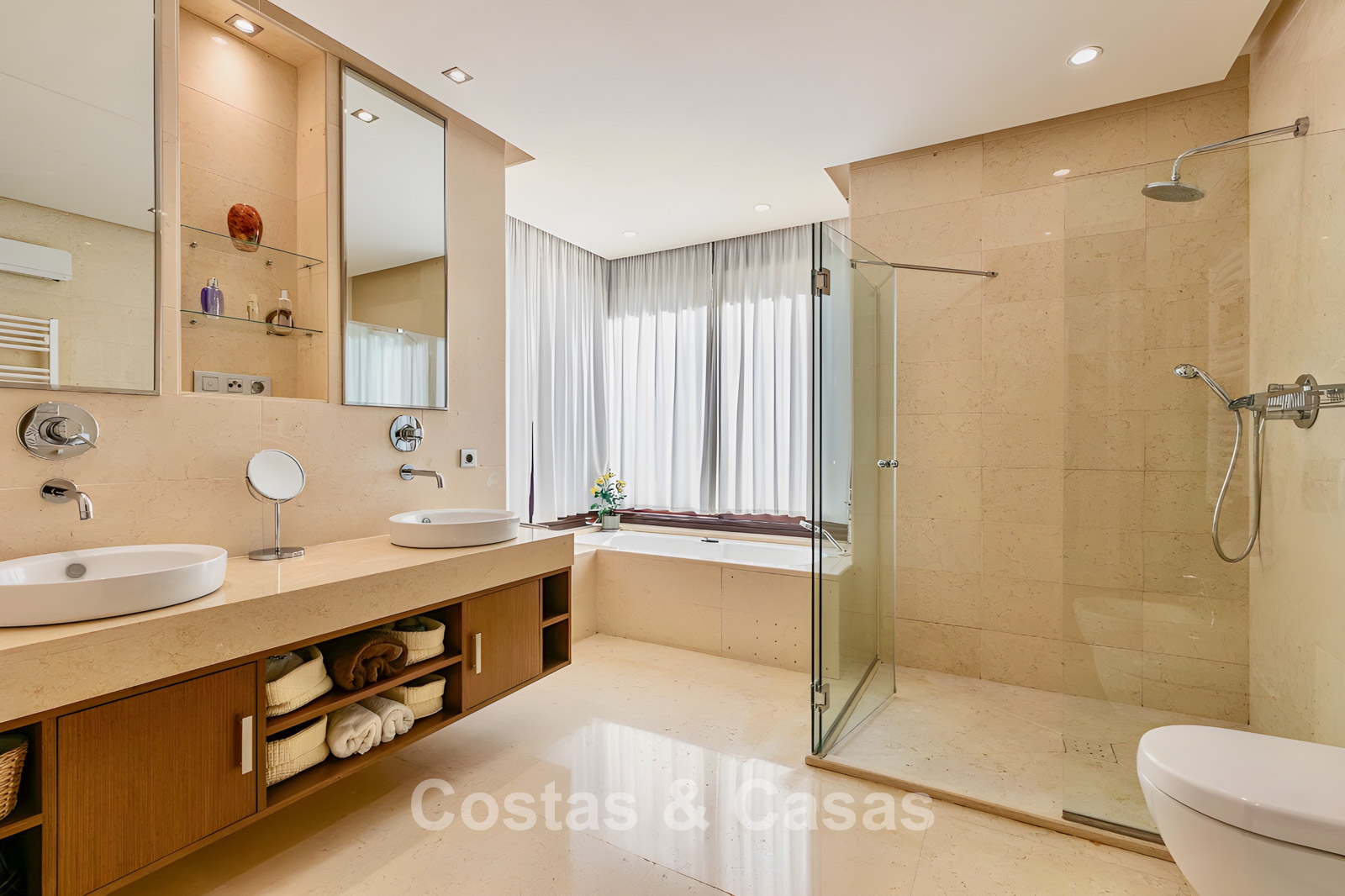 Apartamento en planta baja. Utilizando materiales de calidad y un acabado de alta calidad. Orientada al suroeste. Vista del jardín, del paisaje montañoso circundante y del mar Mediterráneo. El espacioso jardín privado de 202m² es mantenido por la comunidad y ofrece acceso directo a la gran piscina comunitaria. Las altas ventanas corredizas con perfiles empotrados en la sala de estar proporcionan abundante luz natural. Distribución de planta abierta. Amplia sala de estar con sala de TV y comedor. Cocina independiente y práctica con mucho espacio de almacenamiento, electrodomésticos Miele y un acogedor comedor. 3 dormitorios, 2 baños. La suite principal cuenta con un vestidor y un elegante baño en suite, completo con bañera de hidromasaje y ducha separada. Dos de los tres dormitorios también ofrecen acceso directo a la terraza y al jardín, lo que crea una experiencia de vida interior y exterior perfecta. Suelos de mármol. Trastero. Parking subterráneo privado.