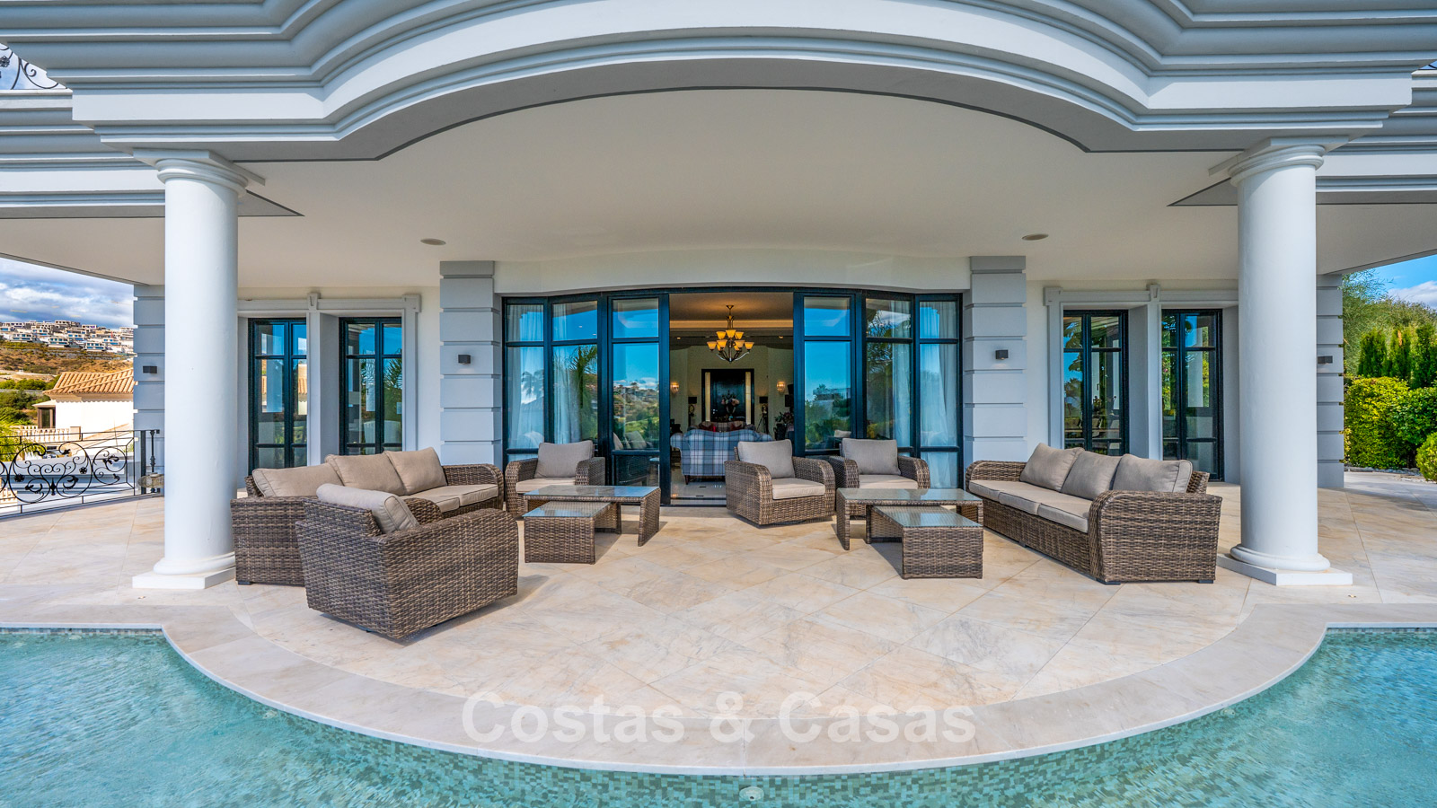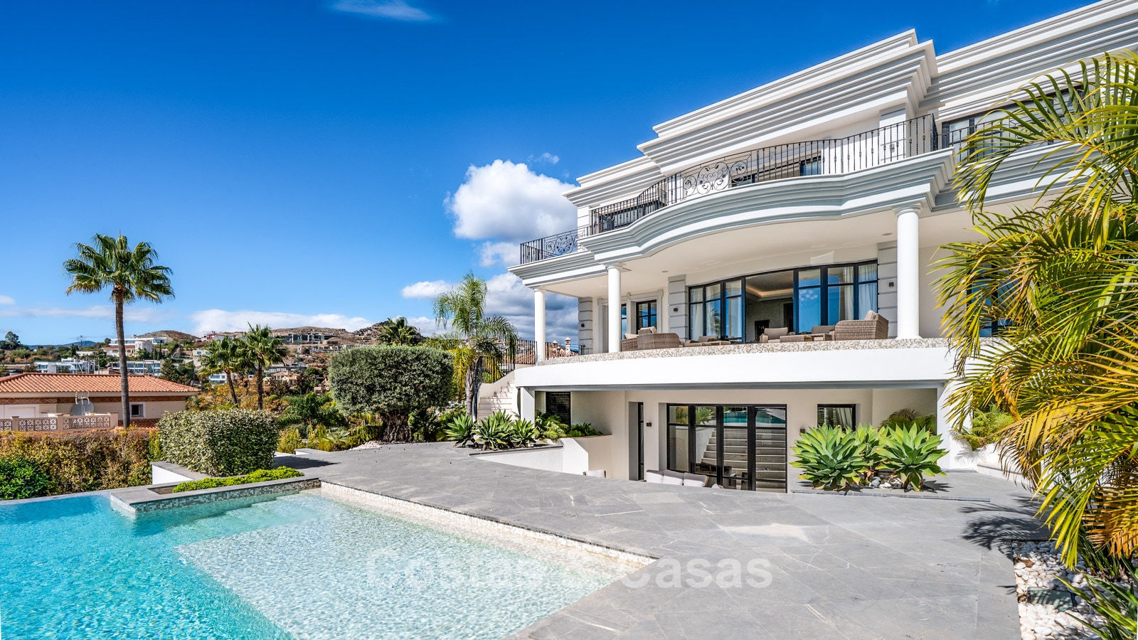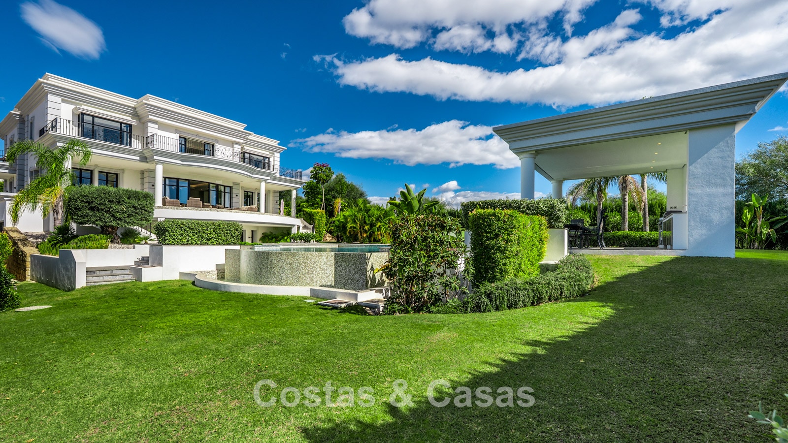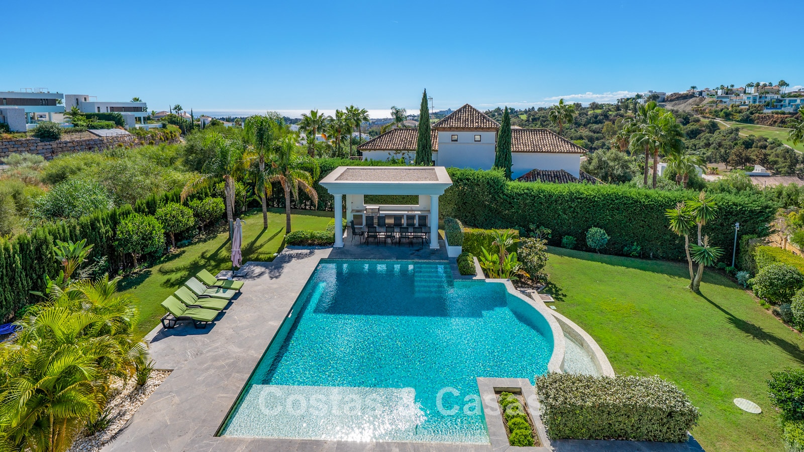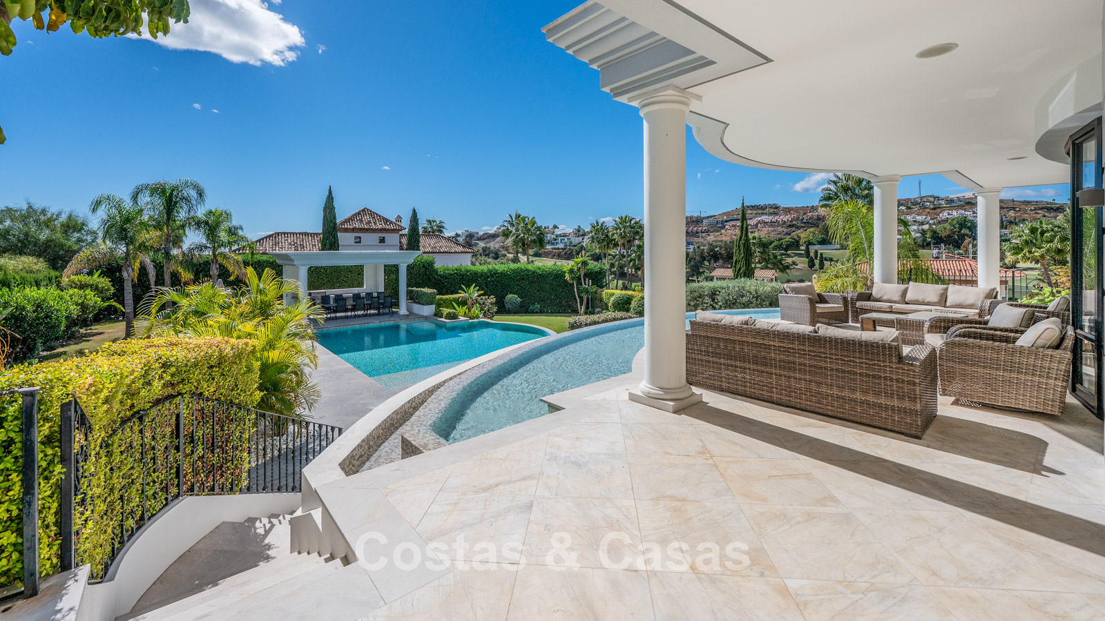 La amplia parcela está completamente ajardinada con paisajismo tropical. La zona exterior cuenta con una gran piscina rodeada de terrazas y con cocina exterior. Varias terrazas cubiertas y descubiertas conectan la villa perfectamente con el jardín.
