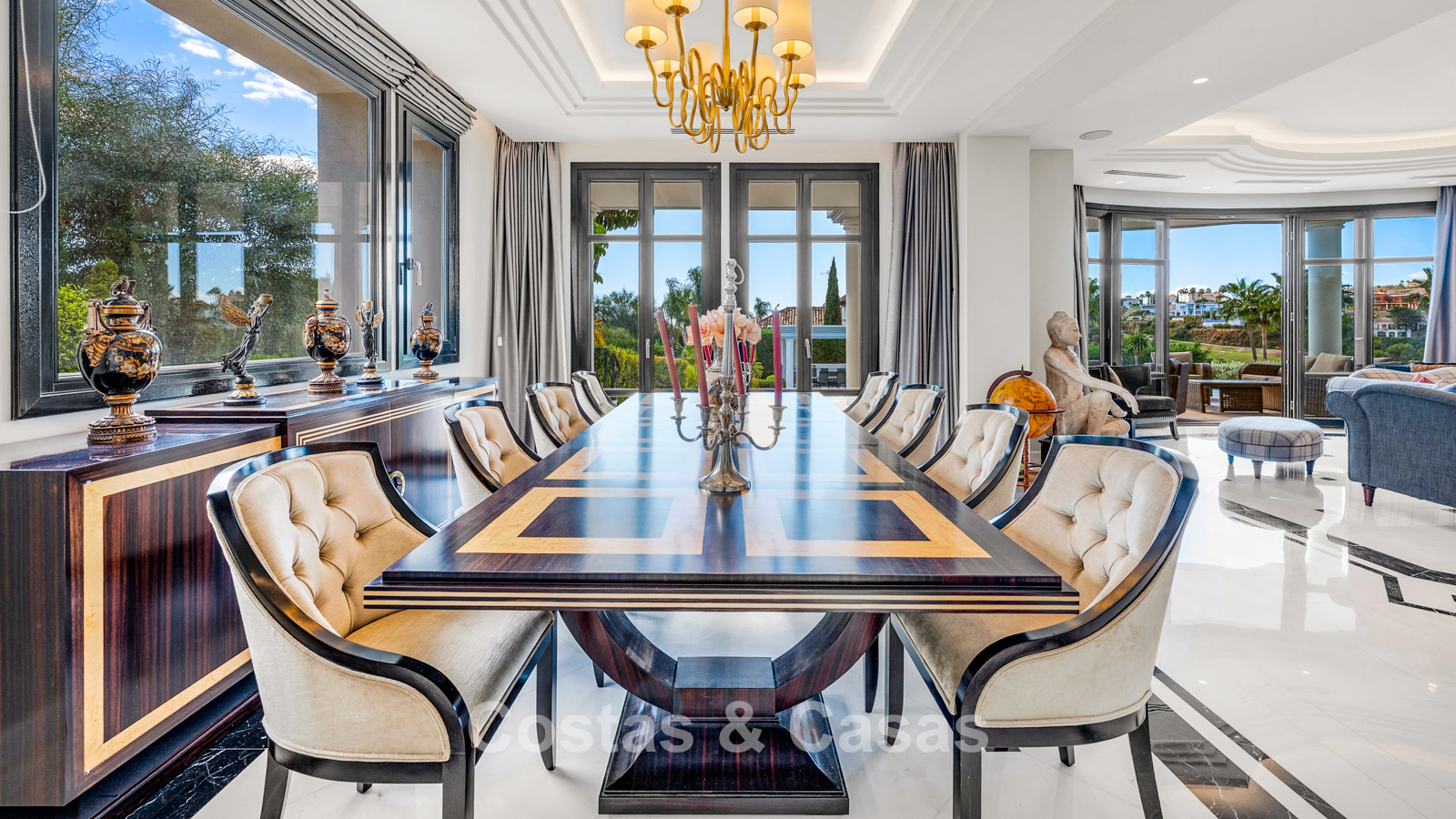 Esta majestuosa villa se encuentra en excelente estado y combina elegancia clásica con lujo moderno. La propiedad se distribuye en tres amplias plantas con una arquitectura simétrica. Se han utilizado materiales de la más alta calidad, incluyendo mármol refinado y carpintería de alta calidad. La villa disfruta de una orientación sur ideal y ofrece vistas al campo de golf, al valle, a las montañas y al mar abierto. El interior transmite grandeza gracias a un espectacular vestíbulo de doble altura con una claraboya en forma de cúpula. Amplia zona de estar abierta con salón de TV y comedor integrado. El espacioso salón tiene una distribución abierta con una chimenea clásica como punto central. Cocina independiente totalmente equipada con acceso directo al comedor y a la terraza. La villa dispone de 5 elegantes dormitorios, cada uno con baño en suite y armarios empotrados. También hay un aseo de invitados en la planta baja. La planta inferior es un auténtico paraíso para el relax, con instalaciones como cine privado, gimnasio totalmente equipado, sauna, baño turco y exclusiva bodega. Apartamento de servicio completo para personal o invitados. Amplio trastero y lavandería independiente. Sala técnica. Garaje interior para 2 coches. Aparcamiento adicional en la parcela.