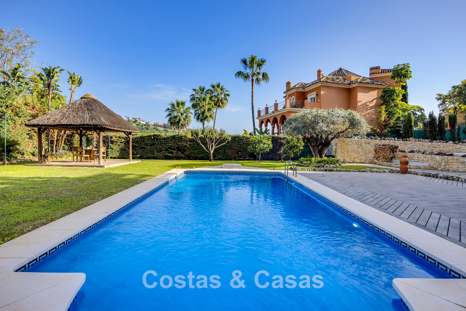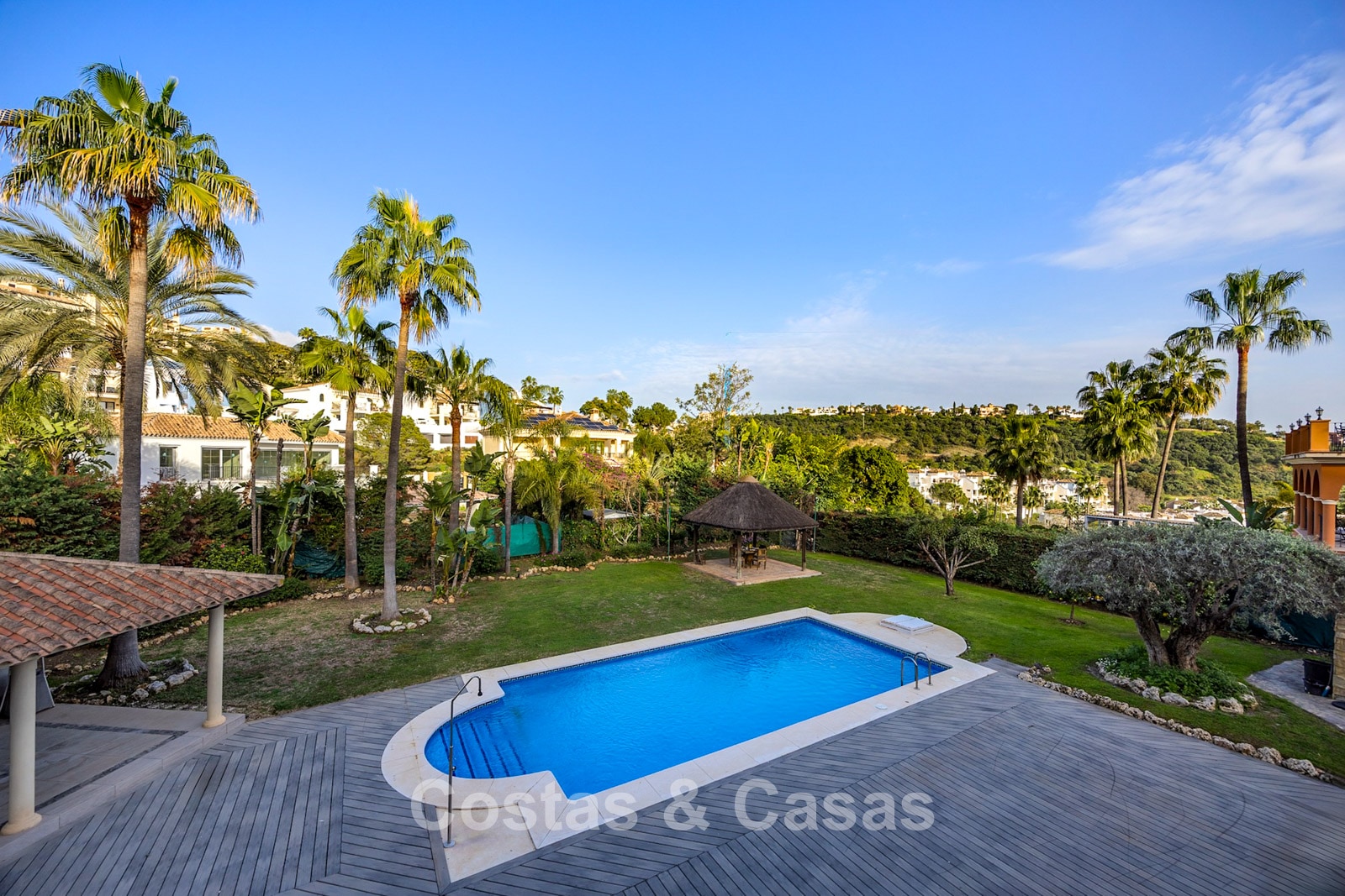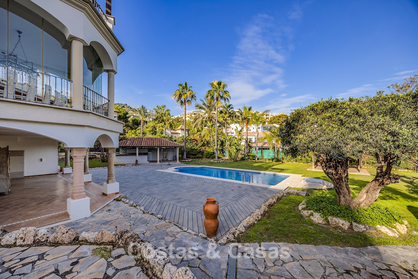Amplia parcela, rodeada de plantaciones altas que proporcionan la privacidad necesaria. Un jardín bellamente diseñado ofrece una refinada combinación de palmeras tropicales, árboles maduros y un extenso césped. Piscina privada con terraza solárium adyacente. Zona de barbacoa junto a la piscina. Varias terrazas soleadas y cubiertas están equipadas con opciones de relajación como zonas de estar y un jacuzzi. Situada al oeste. Vista del jardín y parte del mar Mediterráneo.