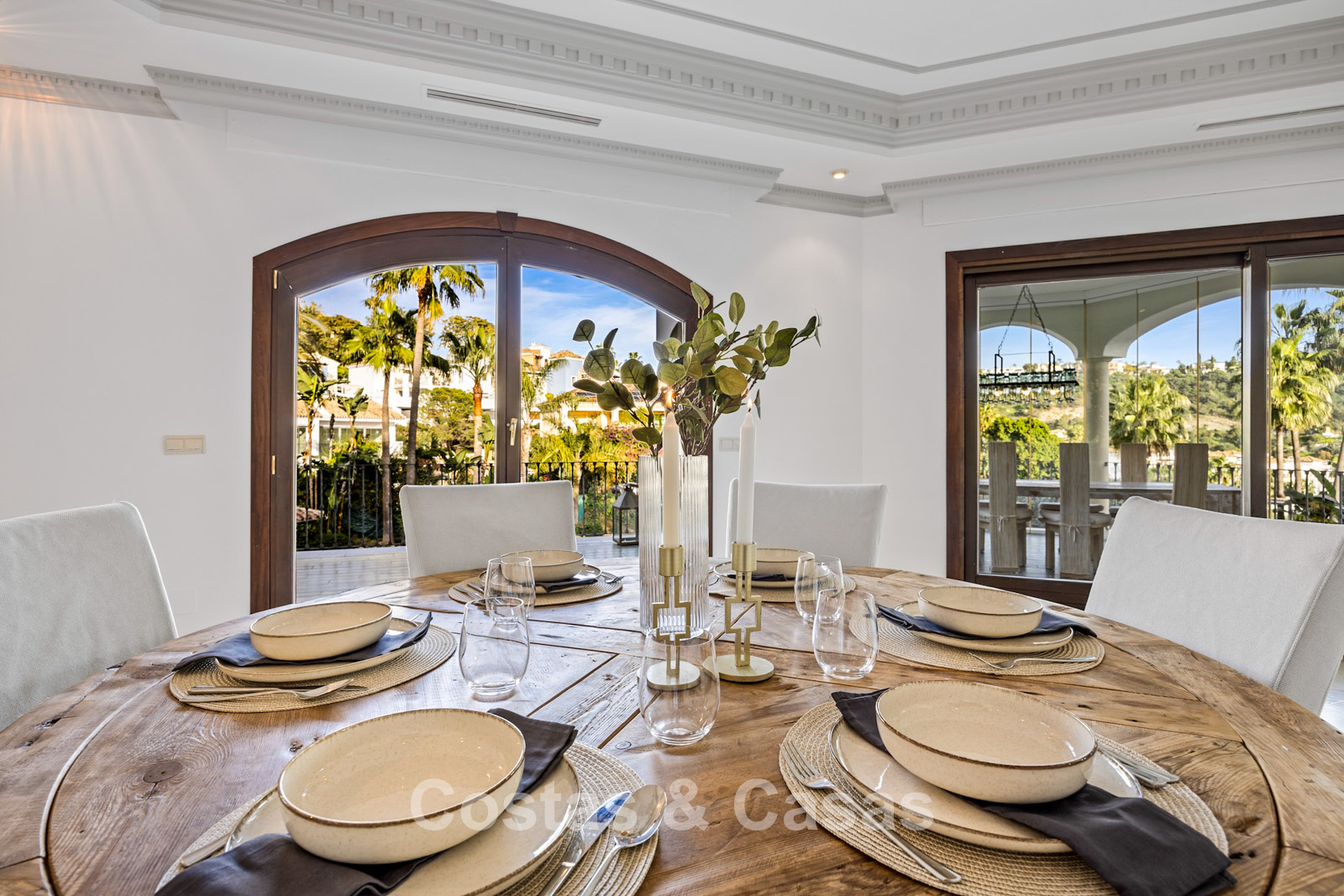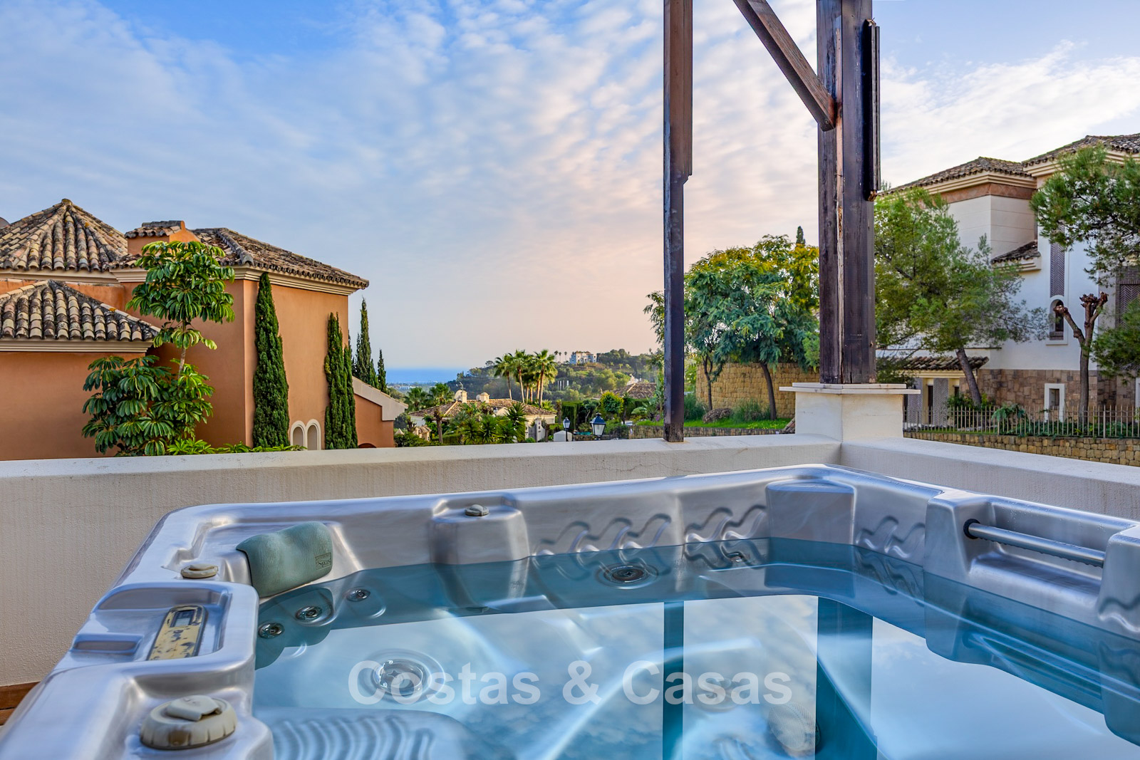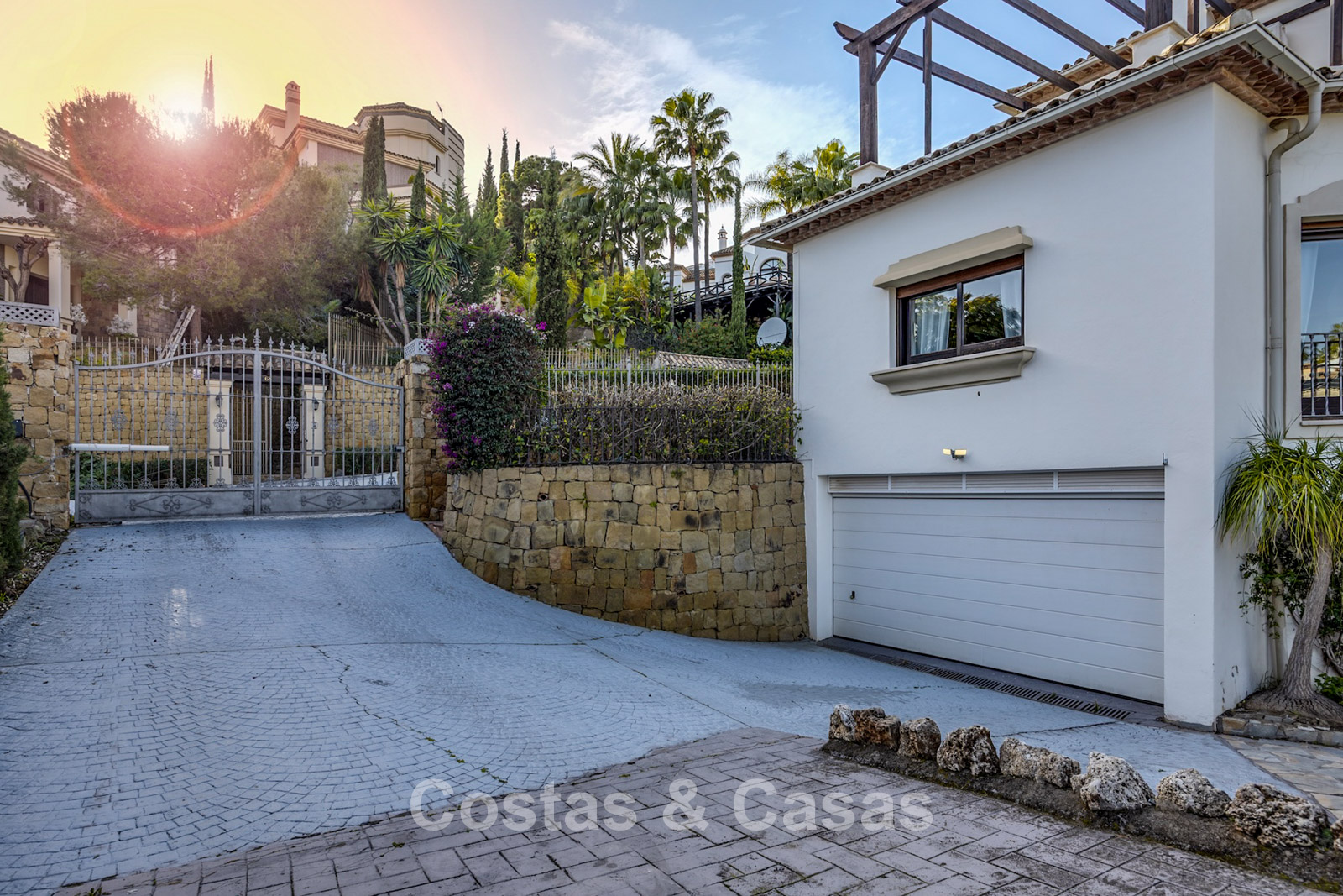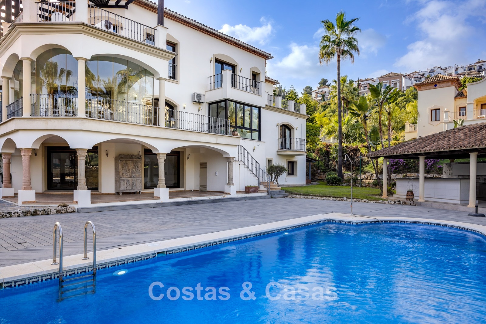Amplia parcela, rodeada de plantaciones altas que proporcionan la privacidad necesaria. Un jardín bellamente diseñado ofrece una refinada combinación de palmeras tropicales, árboles maduros y un extenso césped. Piscina privada con terraza solárium adyacente. Zona de barbacoa junto a la piscina. Varias terrazas soleadas y cubiertas están equipadas con opciones de relajación como zonas de estar y un jacuzzi. Situada al oeste. Vista del jardín y parte del mar Mediterráneo.