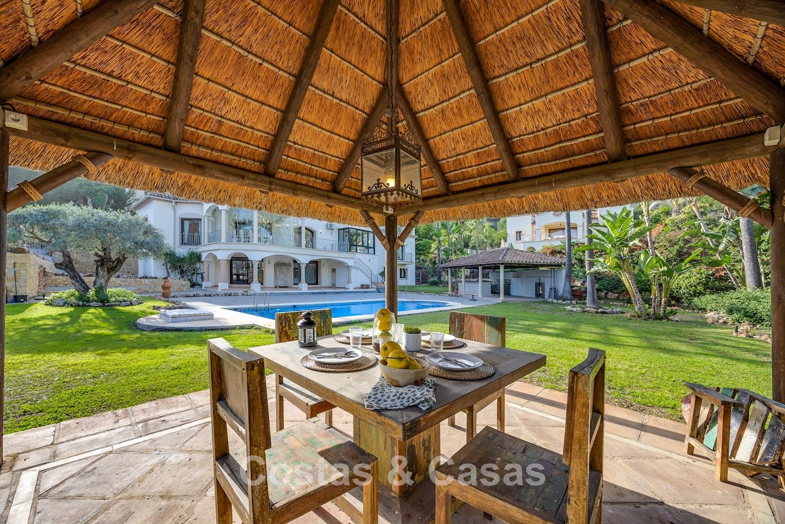 Amplio jardín privado con piscina y acogedoras zonas exteriores.