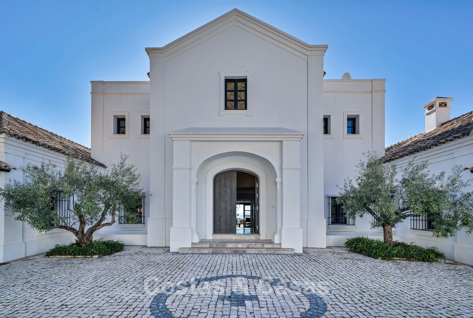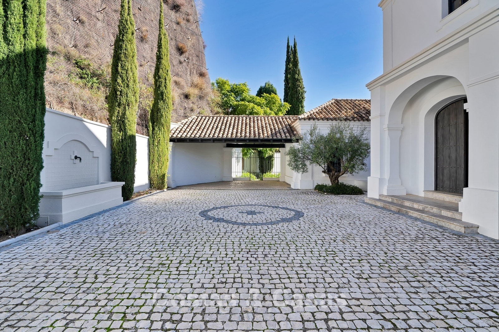 Villa independiente de estilo tradicional con arquitectura inspirada en Andalucía. La propiedad destaca por sus acabados de alta calidad y su cuidada atención al detalle. Acceso mediante camino privado con entrada cerrada. Fachada señorial con una entrada representativa. El acceso principal conduce a un amplio hall de entrada, presidido por dos escaleras que transmiten una sensación de elegancia y distinción. Grandes ventanales aportan abundante luz natural. Distribución interior de concepto abierto. Amplio salón con varias zonas de estar, incluyendo una acogedora sala de televisión con chimenea. Comedor formal. Gran cocina totalmente equipada con electrodomésticos de alta gama y una isla central con zona de asientos. 5 dormitorios y 6 baños. Apartamento de invitados independiente con dormitorio y salón propios, ideal para visitas o personal. El sótano está diseñado como una exclusiva zona de ocio e incluye un elegante bar, una versátil sala de entretenimiento con mesa de billar y una sala de cine independiente. Además, esta planta dispone de un gimnasio completamente equipado y un lujoso spa con sauna, piscina interior climatizada y jacuzzi, ideal para el máximo confort y bienestar. Aparcamiento para varios vehículos.