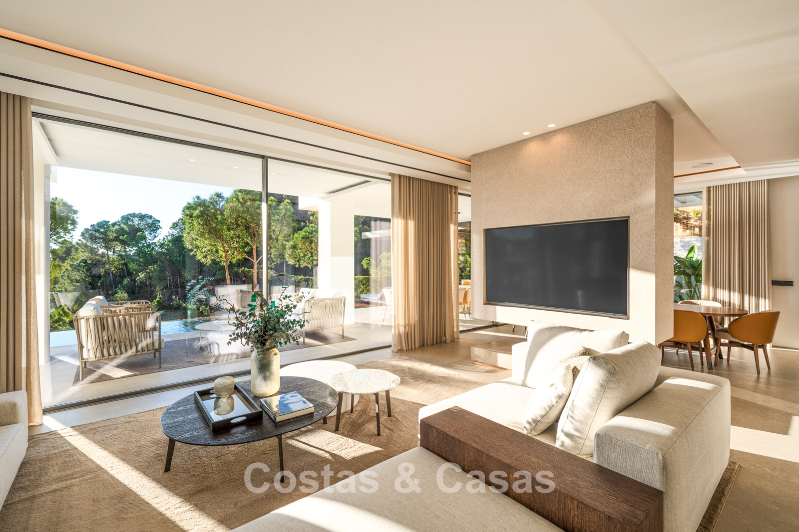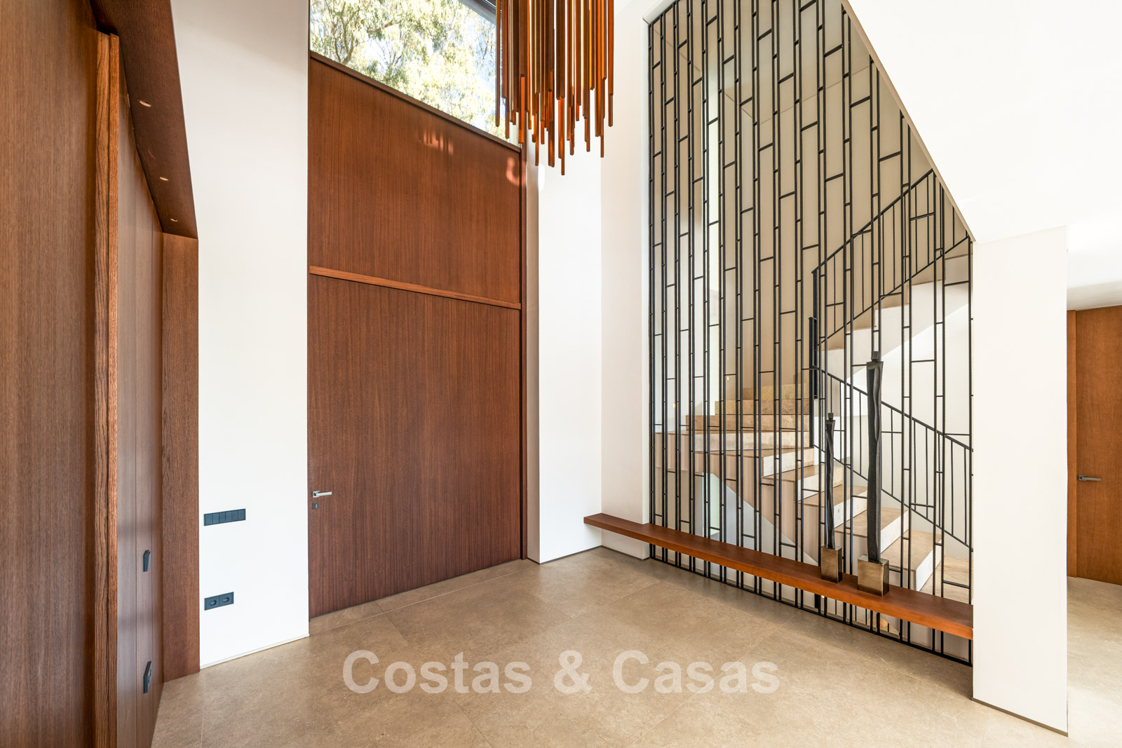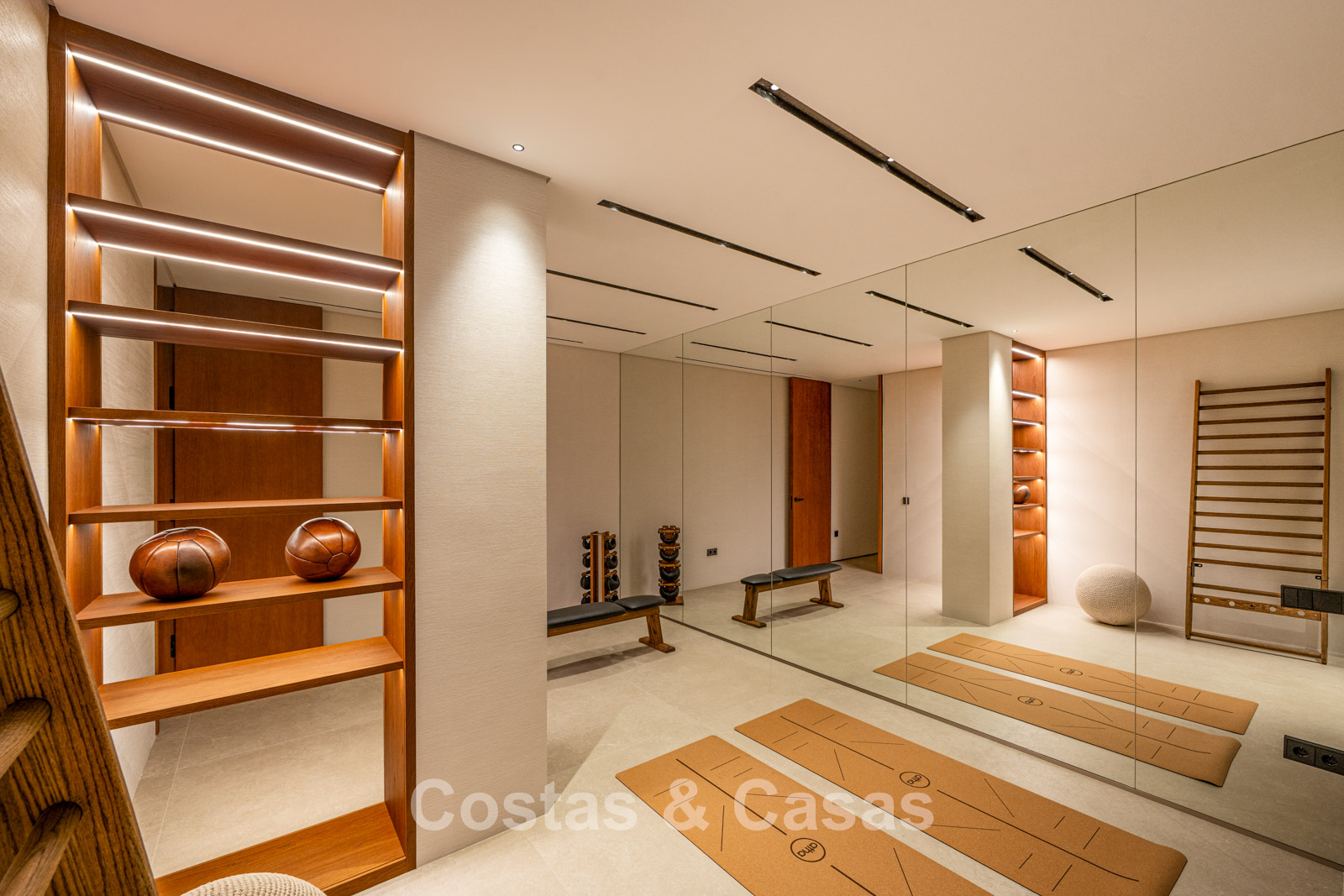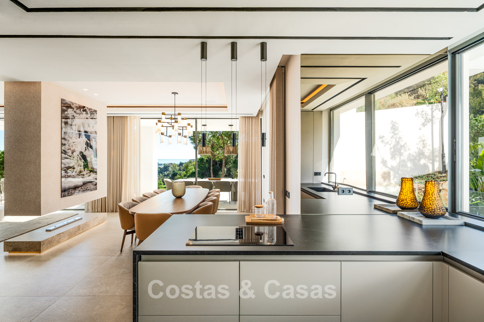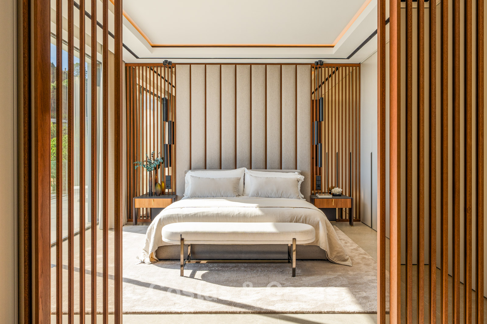 La arquitectura combina líneas contemporáneas limpias y simétricas con sutiles influencias mediterráneas, dando como resultado una villa elegante y atemporal. Construida con materiales de alta calidad cuidadosamente seleccionados y detalles de acabado refinados. Orientación sureste. Vistas despejadas a los campos de golf, a la emblemática montaña La Concha y al mar Mediterráneo. Imponente hall de entrada con techo de doble altura. Ventanas correderas de suelo a techo con perfiles integrados que aportan abundante luz natural y crean una transición fluida entre interior y exterior. Diseño de planta abierta. Salón luminoso y espacioso con zona de TV y comedor. La cocina de alta gama hecha a medida se integra a la perfección con el salón y está equipada con electrodomésticos Gaggenau y barra de desayuno. 6 dormitorios, 7 baños y 2 aseos de invitados. Elegante zona social en la planta inferior con salón de TV, bar y spa con piscina interior climatizada, sauna y gimnasio. Lavandería equipada con electrodomésticos Miele. Garaje integrado para 2 coches con punto de carga para vehículos eléctricos.