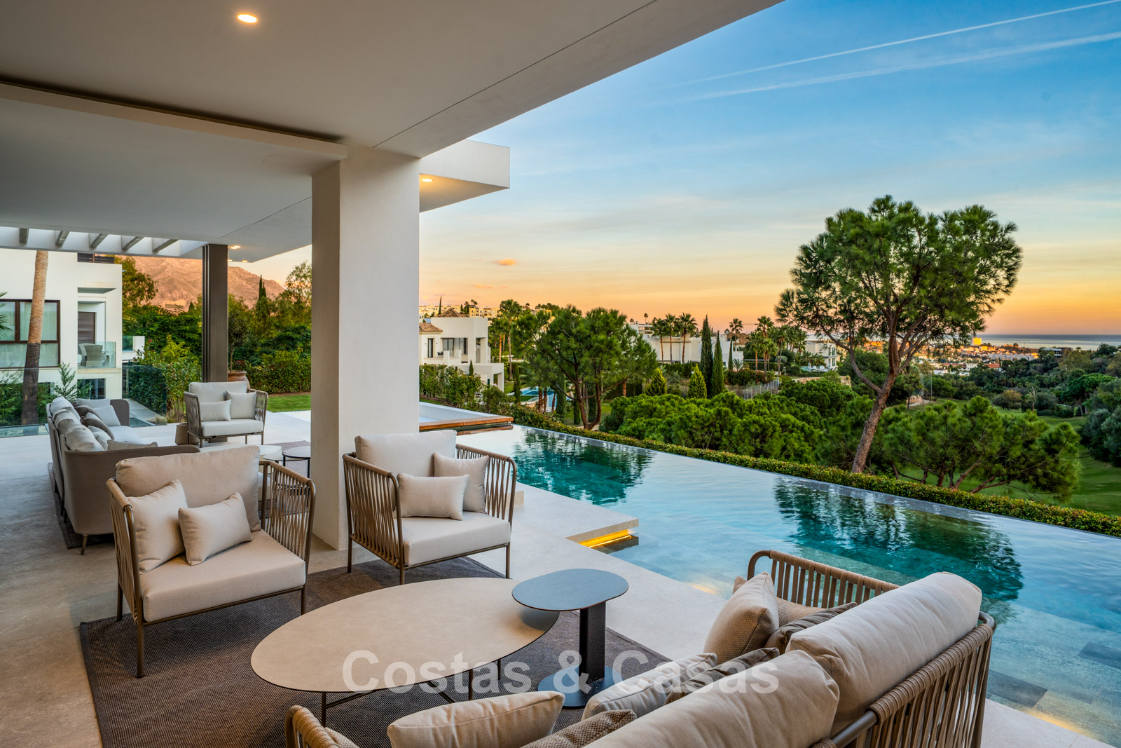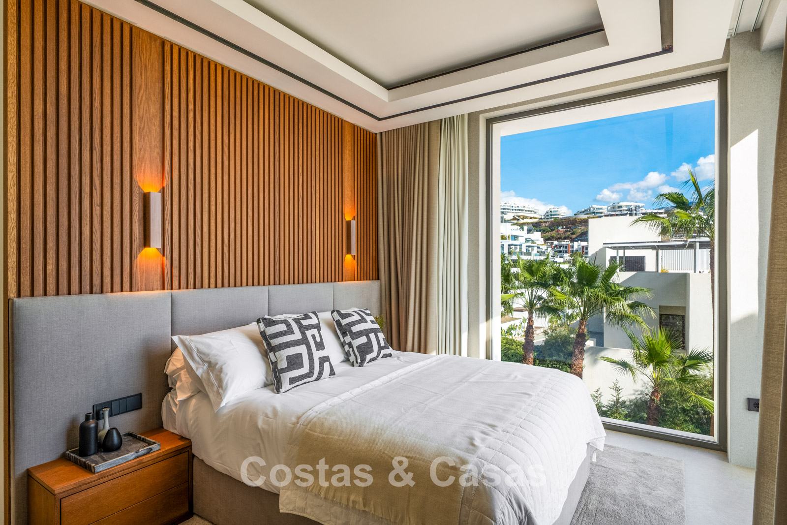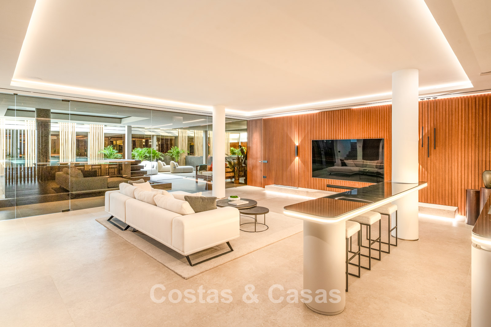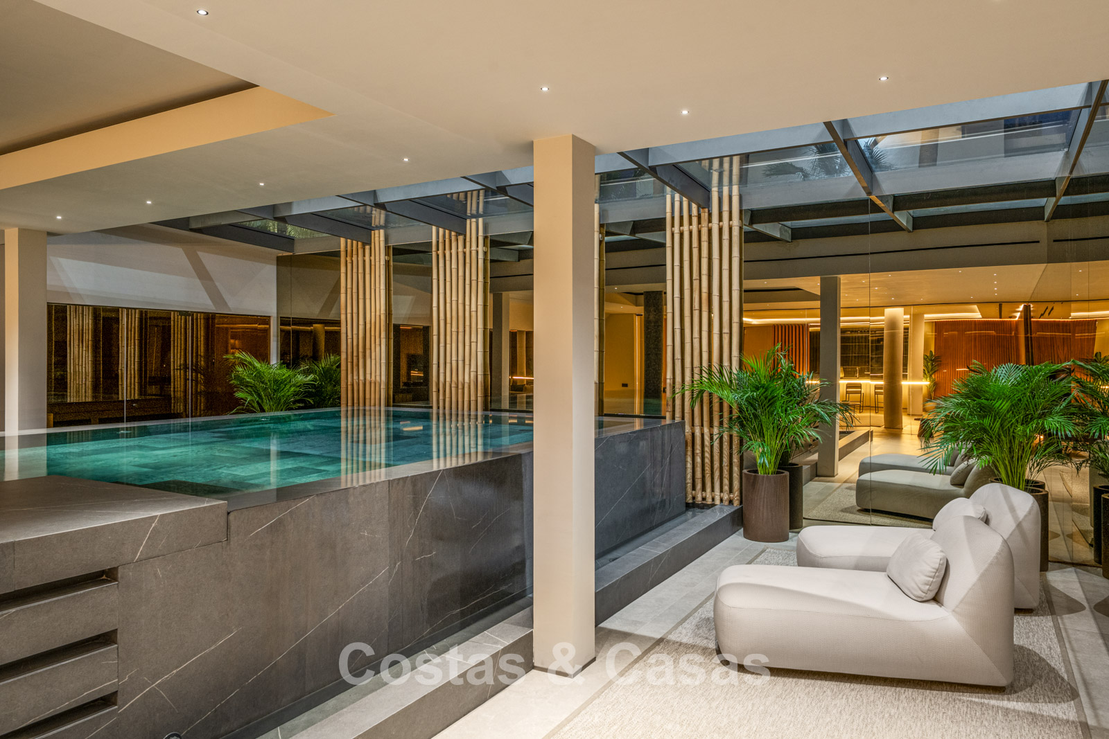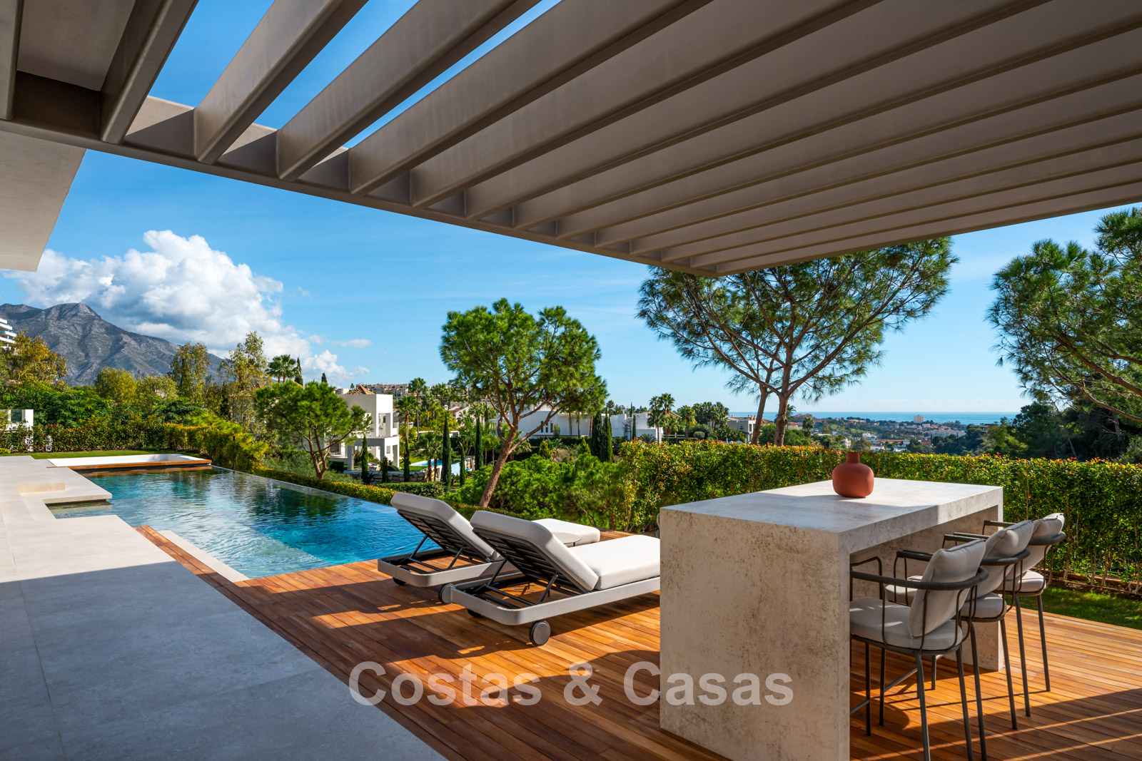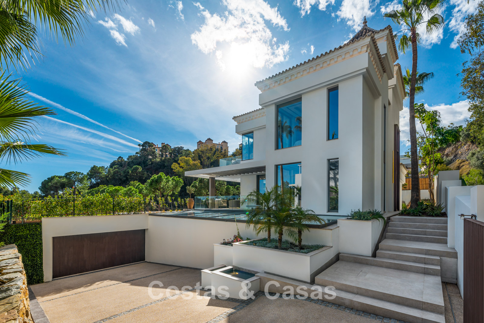 La arquitectura combina líneas contemporáneas limpias y simétricas con sutiles influencias mediterráneas, dando como resultado una villa elegante y atemporal. Construida con materiales de alta calidad cuidadosamente seleccionados y detalles de acabado refinados. Orientación sureste. Vistas despejadas a los campos de golf, a la emblemática montaña La Concha y al mar Mediterráneo. Imponente hall de entrada con techo de doble altura. Ventanas correderas de suelo a techo con perfiles integrados que aportan abundante luz natural y crean una transición fluida entre interior y exterior. Diseño de planta abierta. Salón luminoso y espacioso con zona de TV y comedor. La cocina de alta gama hecha a medida se integra a la perfección con el salón y está equipada con electrodomésticos Gaggenau y barra de desayuno. 6 dormitorios, 7 baños y 2 aseos de invitados. Elegante zona social en la planta inferior con salón de TV, bar y spa con piscina interior climatizada, sauna y gimnasio. Lavandería equipada con electrodomésticos Miele. Garaje integrado para 2 coches con punto de carga para vehículos eléctricos.