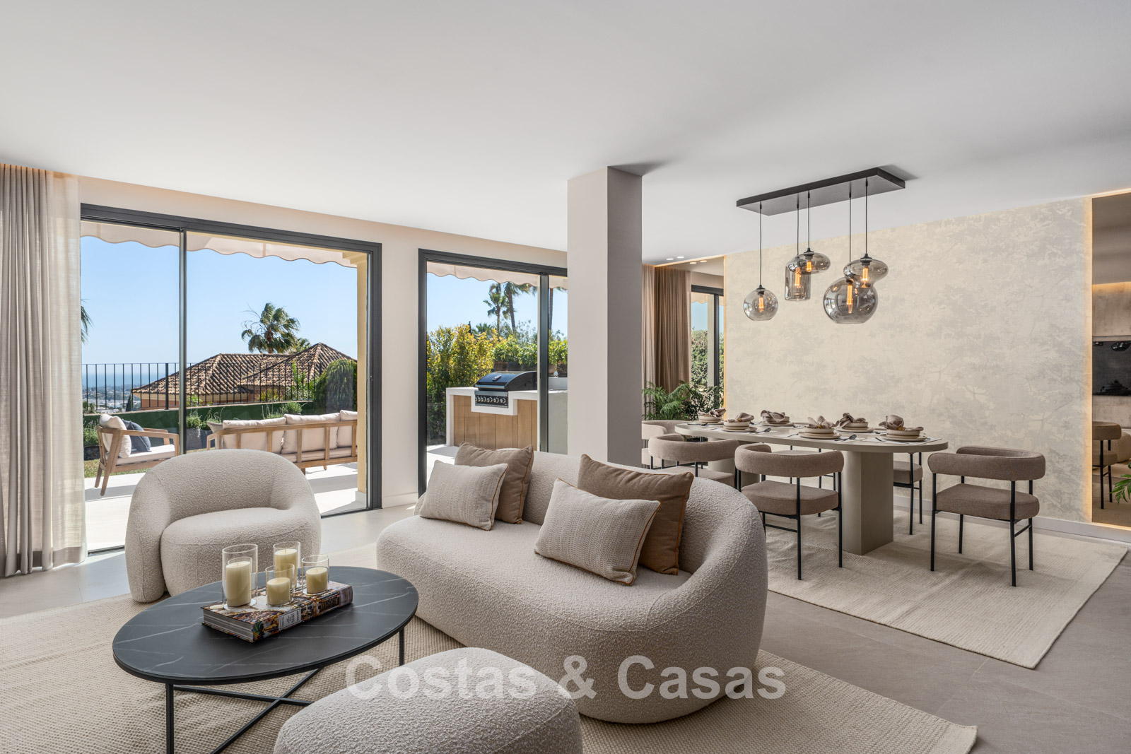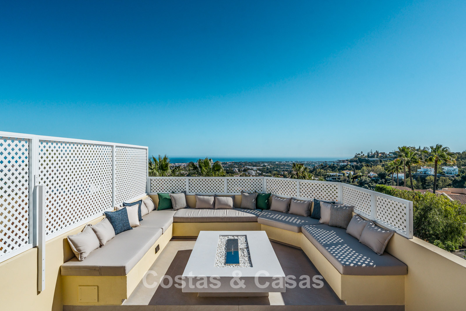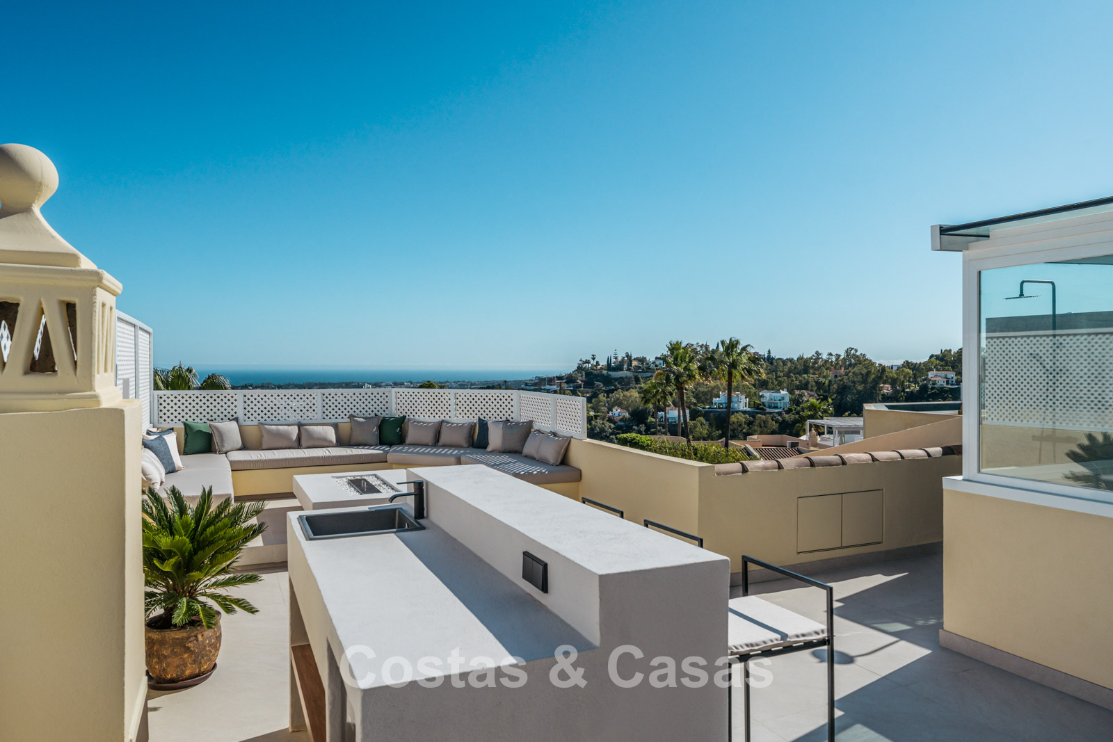 Jardín privado cerrado con una encantadora zona de césped. Terraza soleada con cocina exterior y barbacoa. La atmosférica terraza de la azotea cuenta con una acogedora zona de descanso junto a la chimenea y un elegante bar donde podrá relajarse y disfrutar de una bebida. Situada al sur. Vistas panorámicas sobre el valle hacia la montaña de La Concha y el mar Mediterráneo.