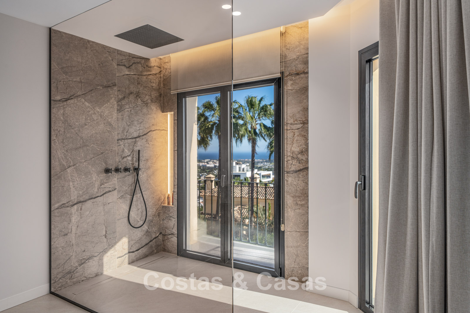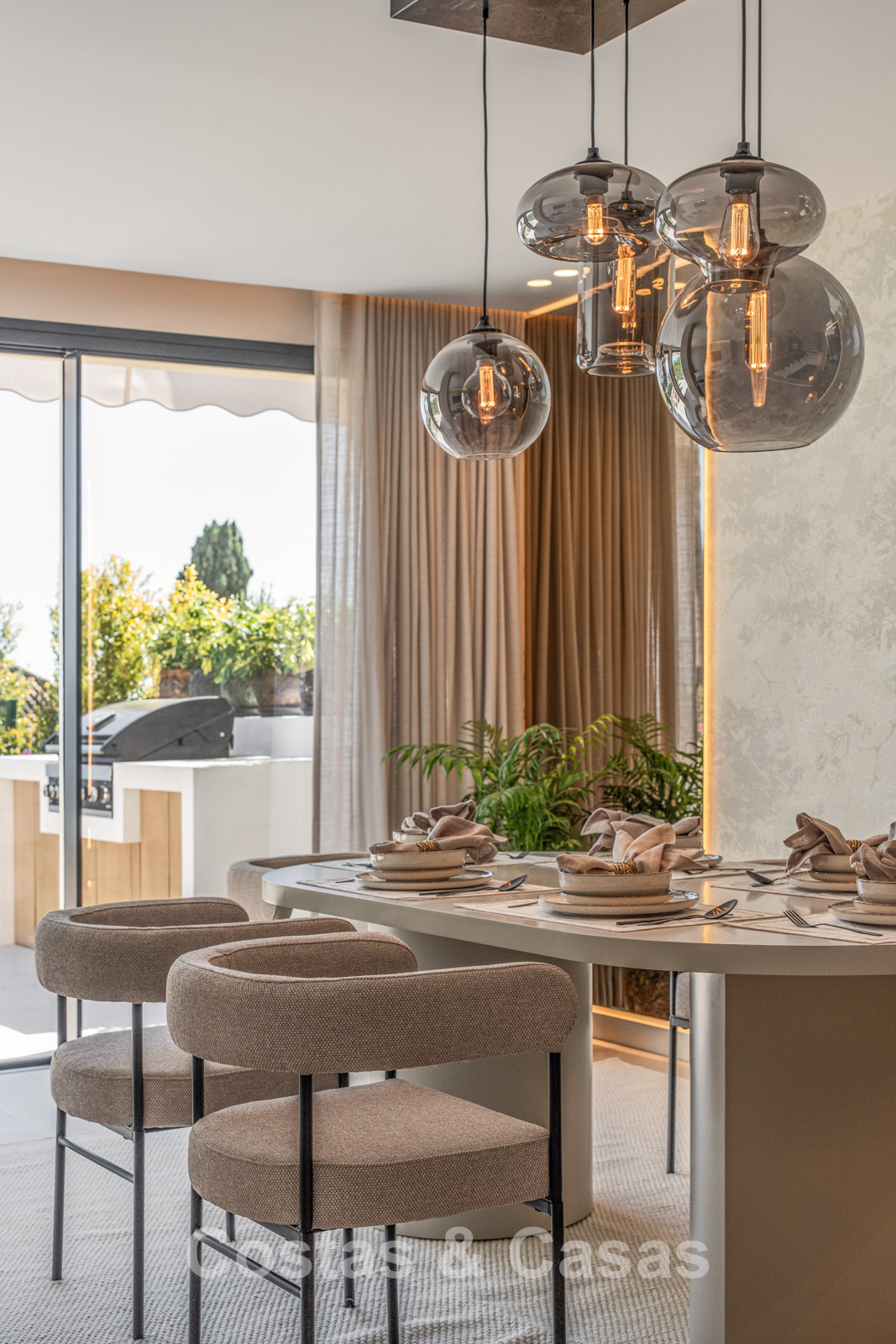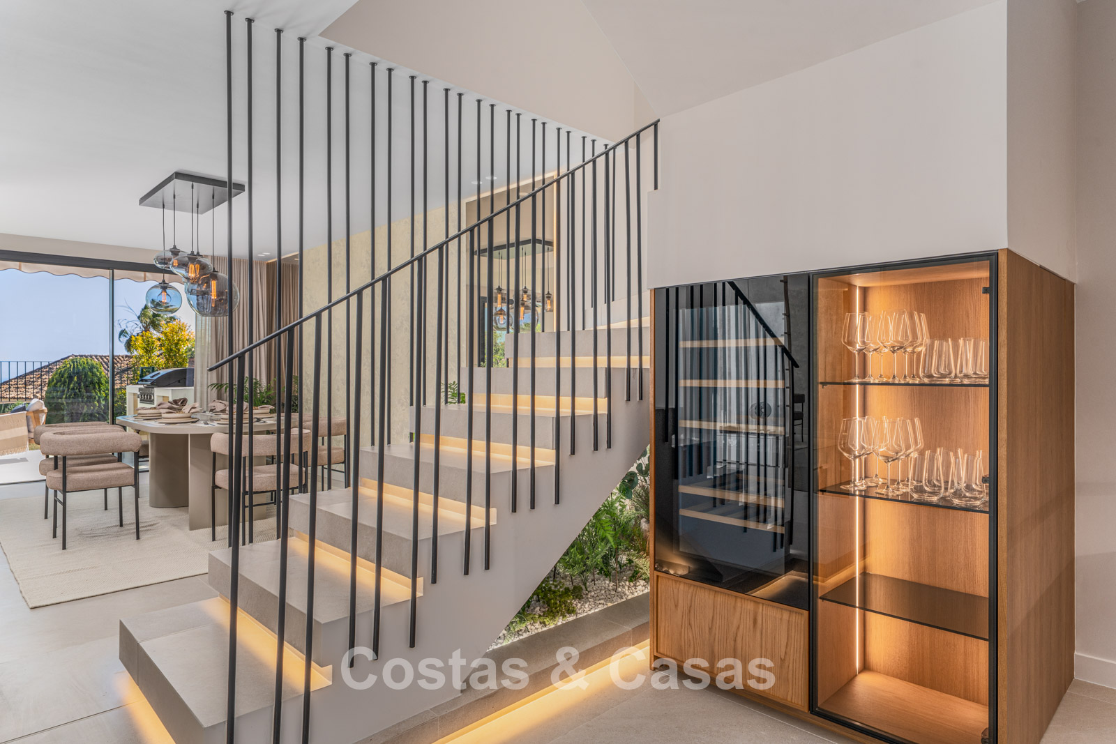 Jardín privado cerrado con una encantadora zona de césped. Terraza soleada con cocina exterior y barbacoa. La atmosférica terraza de la azotea cuenta con una acogedora zona de descanso junto a la chimenea y un elegante bar donde podrá relajarse y disfrutar de una bebida. Situada al sur. Vistas panorámicas sobre el valle hacia la montaña de La Concha y el mar Mediterráneo.