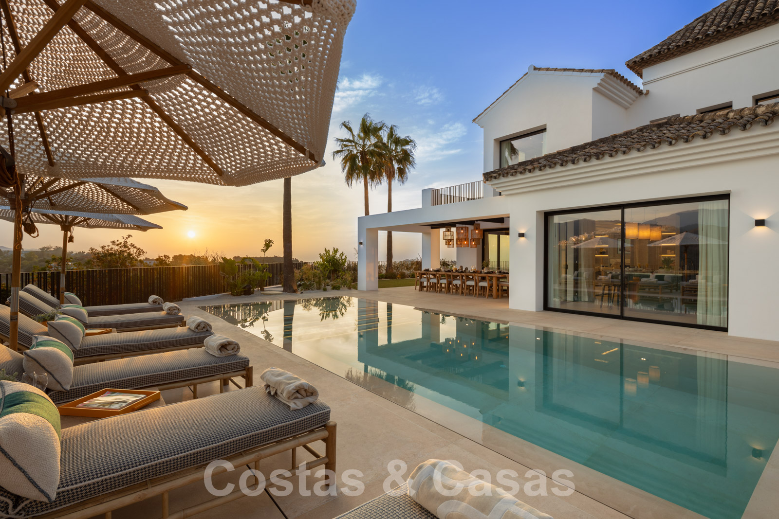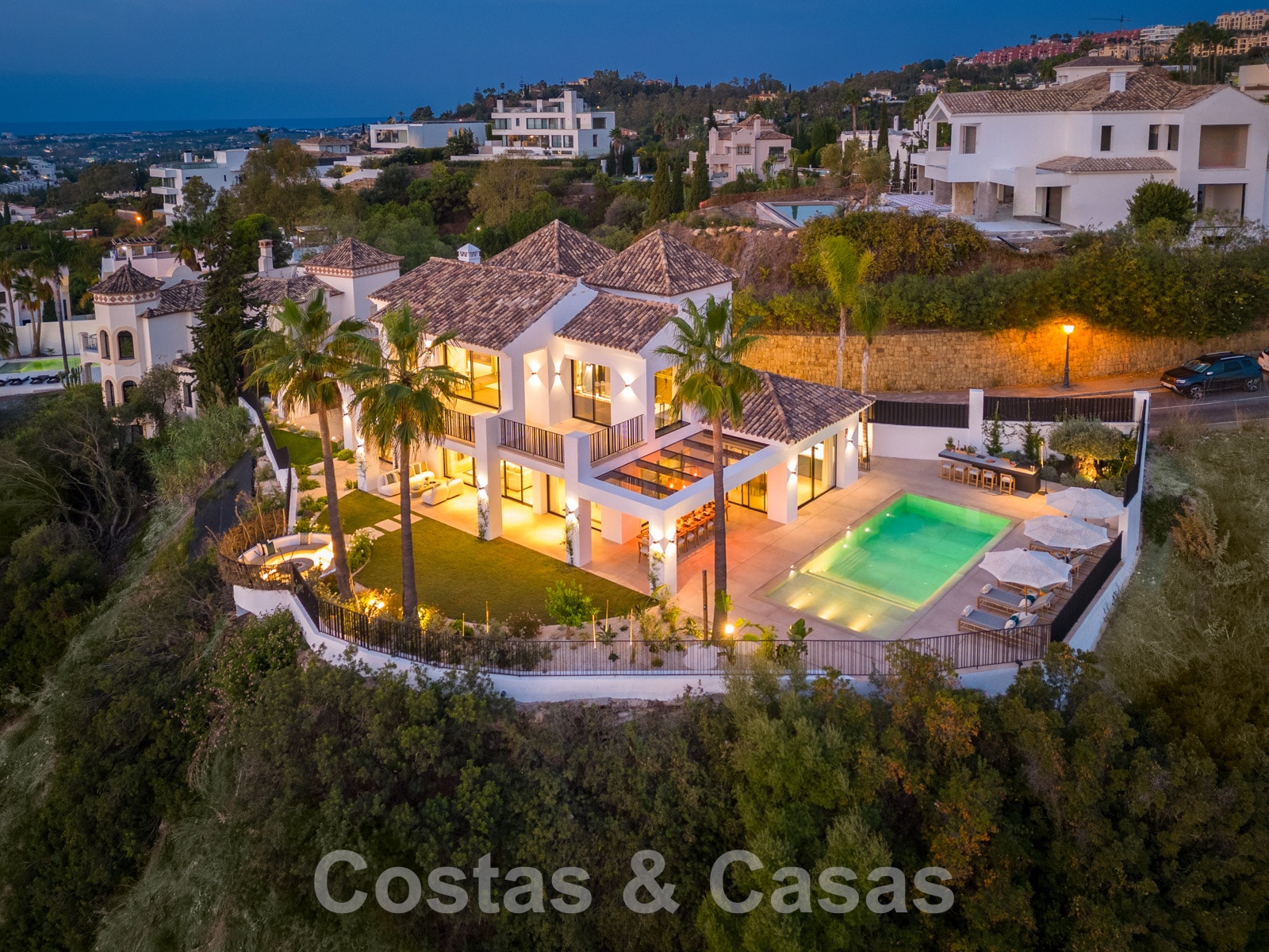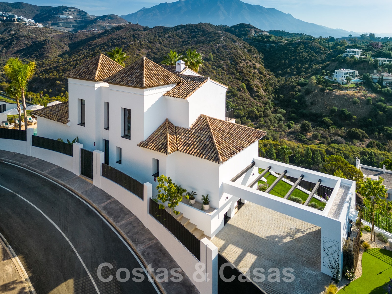 Parcela totalmente vallada en una posición elevada. Cuidado jardín paisajista diseñado con su propio campo de minigolf. Gran piscina con terraza adyacente equipada con tumbonas. Amplias terrazas cubiertas y descubiertas equipadas con varios rincones de relajación, incluyendo un salón hundido con hoguera y una isla de cocina para sentarse. Orientación sur con fabulosas vistas del paisaje montañoso, los campos de golf y el mar Mediterráneo.