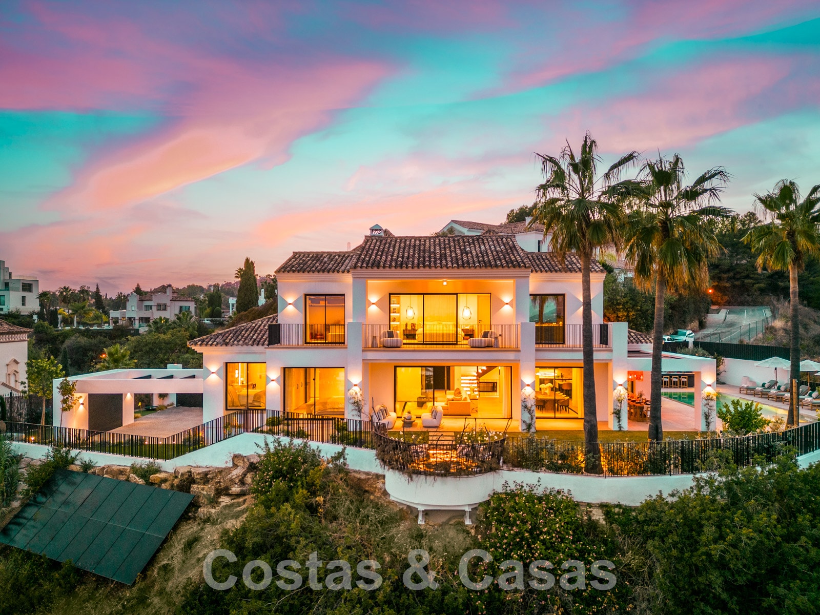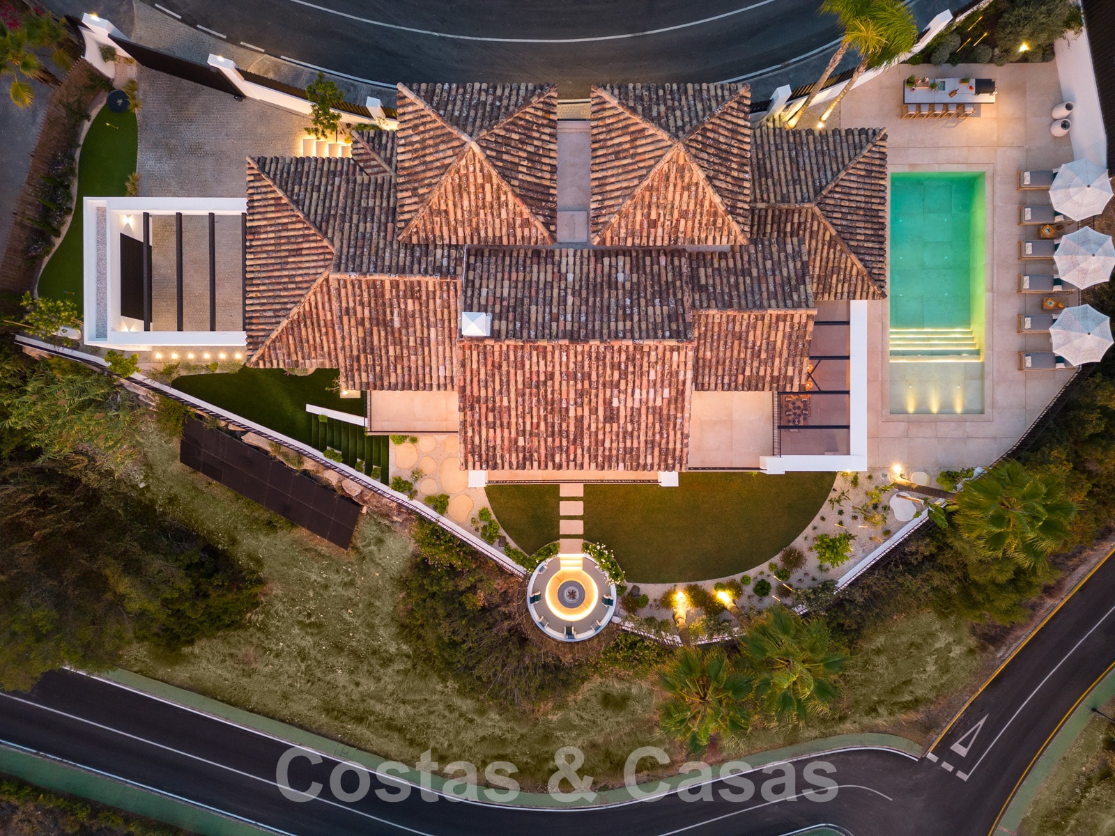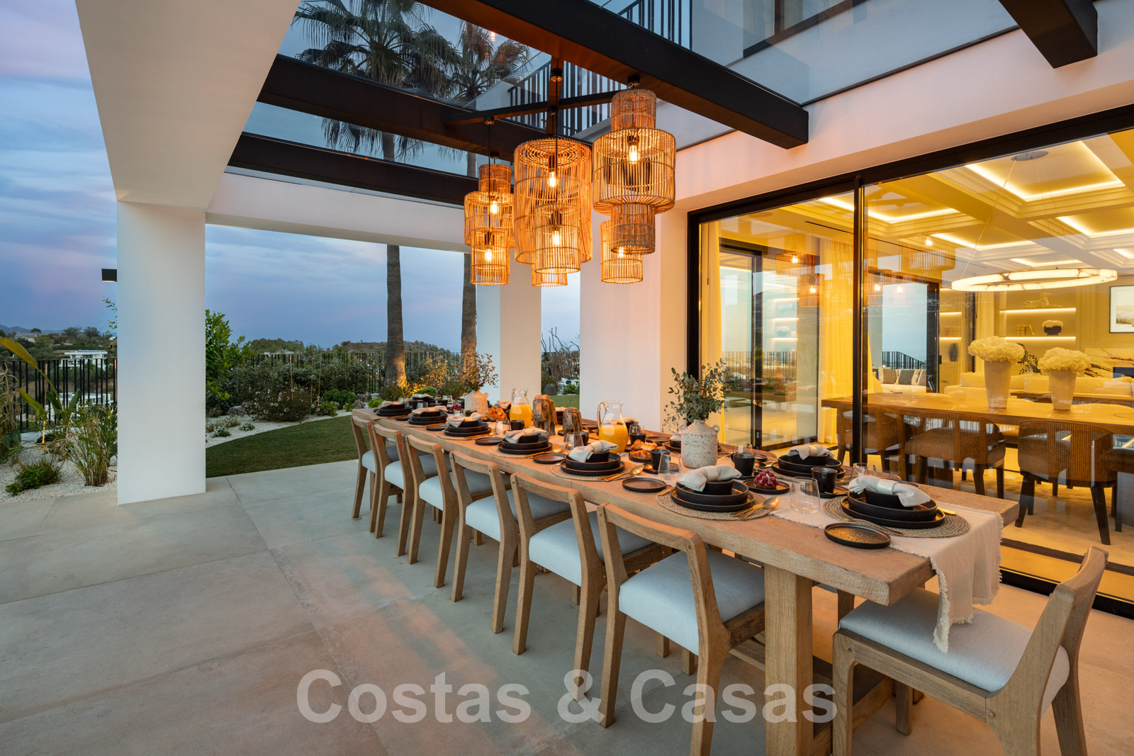 Parcela totalmente vallada en una posición elevada. Cuidado jardín paisajista diseñado con su propio campo de minigolf. Gran piscina con terraza adyacente equipada con tumbonas. Amplias terrazas cubiertas y descubiertas equipadas con varios rincones de relajación, incluyendo un salón hundido con hoguera y una isla de cocina para sentarse. Orientación sur con fabulosas vistas del paisaje montañoso, los campos de golf y el mar Mediterráneo.