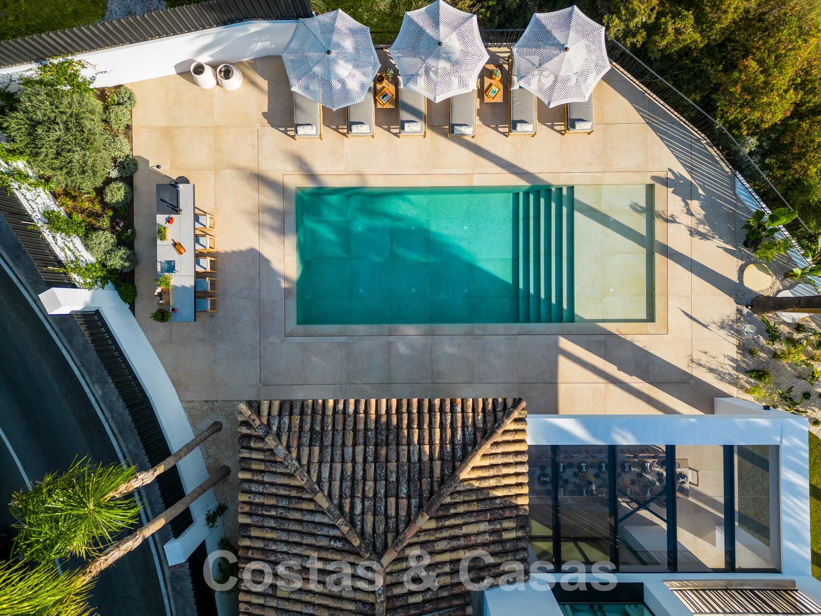 Superficie parcela: 1.754m² Superficie total construida: 548m² Superficie terraza cubierta: 43m² Superficie terraza descubierta: 165m² Dormitorios: 5 Baños: 8 Superficie piscina: 44m
