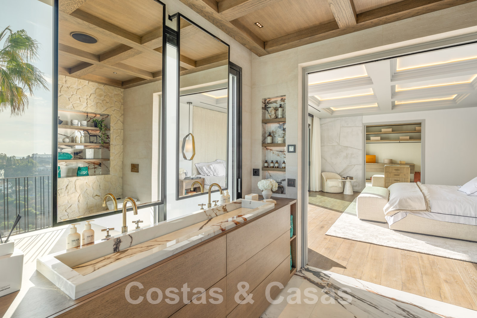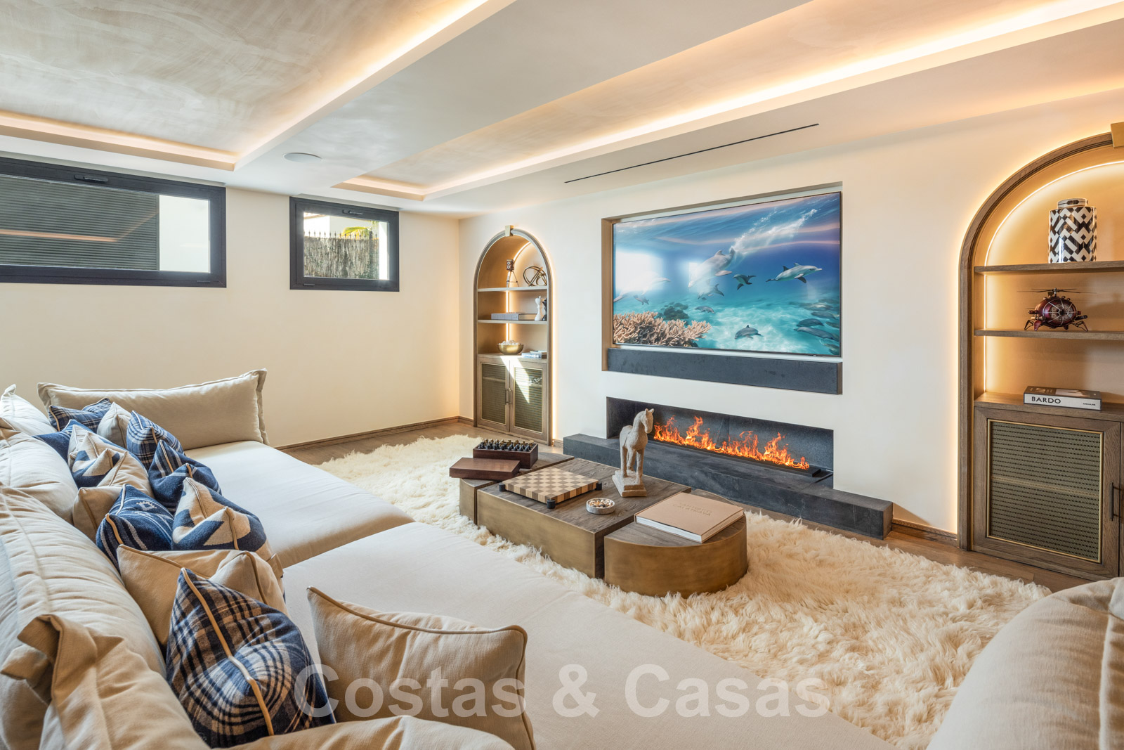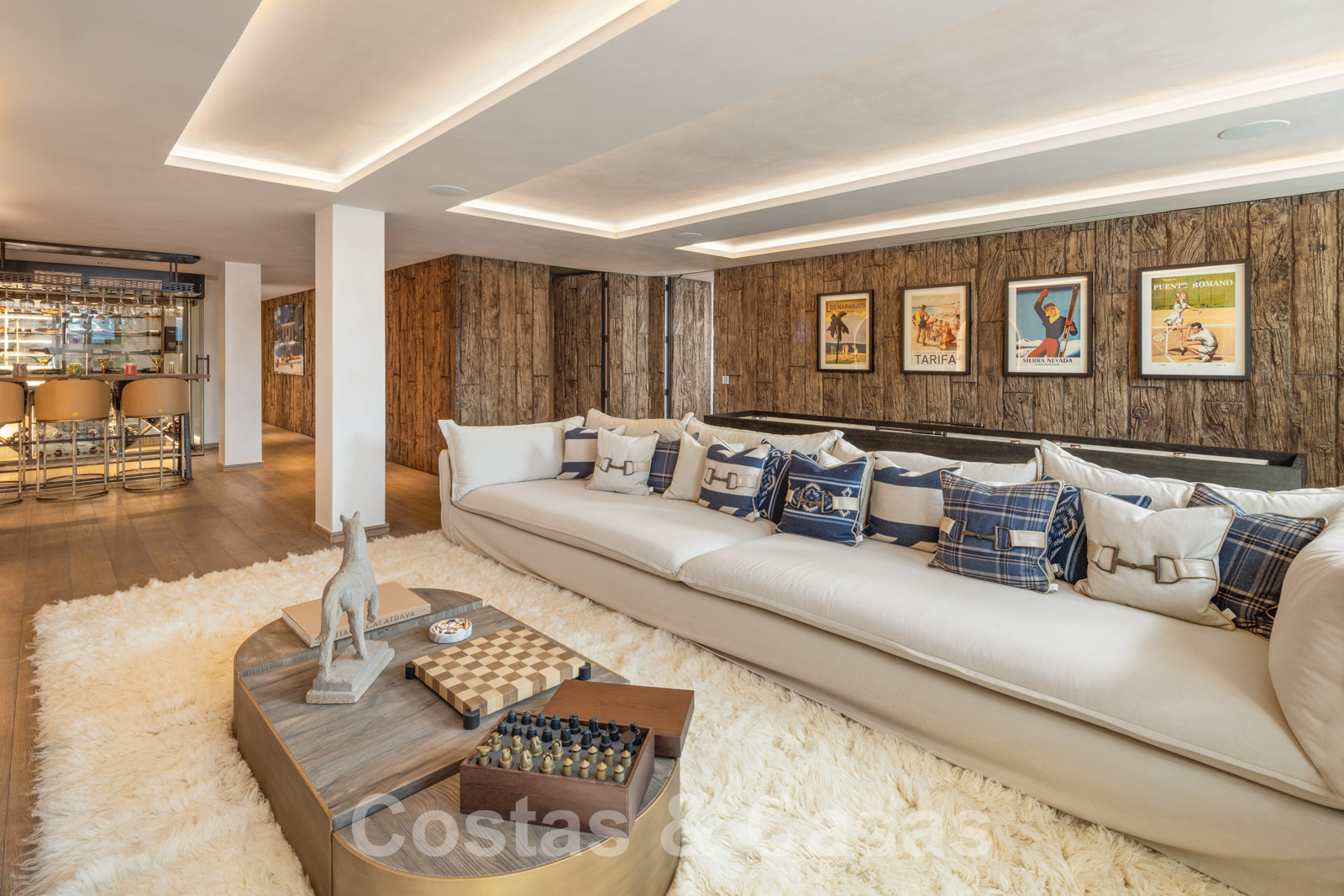 Villa independiente con arquitectura española atemporal. Utilizando materiales de primera clase con un ojo específico para un acabado refinado. Interior completamente a medida con tejidos de las marcas Dedar y Ralph Lauren. Una puerta motorizada da acceso al camino de entrada y cochera. Amplio hall de entrada con guardarropa y aseo de invitados. Una escalera arquitectónicamente iluminada conecta las 3 plantas residenciales. Sala de estar de planta abierta con sala de TV y comedor integrado. Cocina de diseño Clive Christian totalmente equipada con isla central de mármol. Gracias a las altas ventanas correderas con marcos empotrados, prácticamente todas las habitaciones disfrutan de una generosa iluminación. Amplia suite principal con suelos de madera, un lujoso cuarto de baño y vestidor. En la planta inferior: gimnasio totalmente equipado, zona de spa con hammam, ducha doble y aseo de invitados, bodega, zona recreativa con sala de TV, bar de vinos, sala de juegos y dormitorio de invitados en suite. Suelos de gres porcelánico (120x120cm) y parquet de roble. Trastero, lavadero. Garaje para 2 coches.