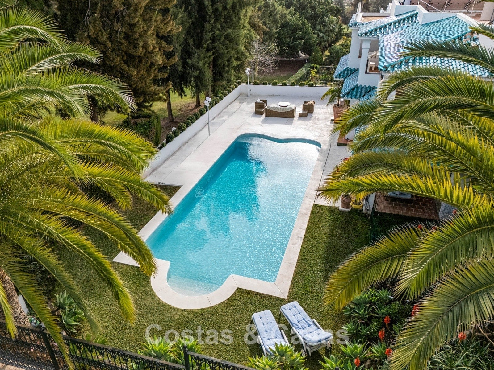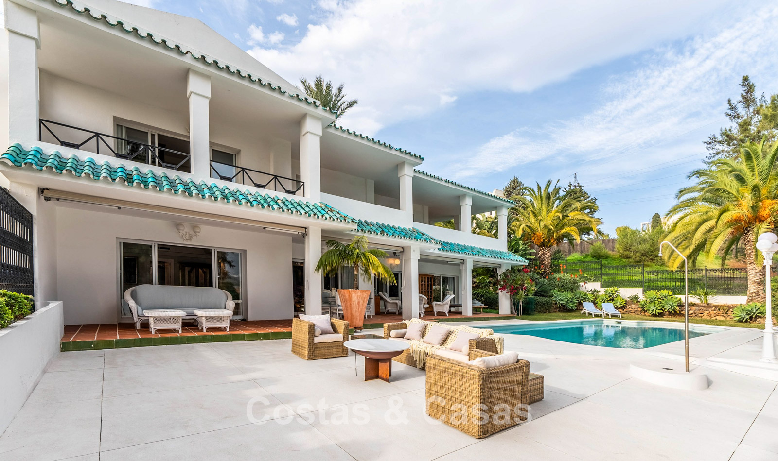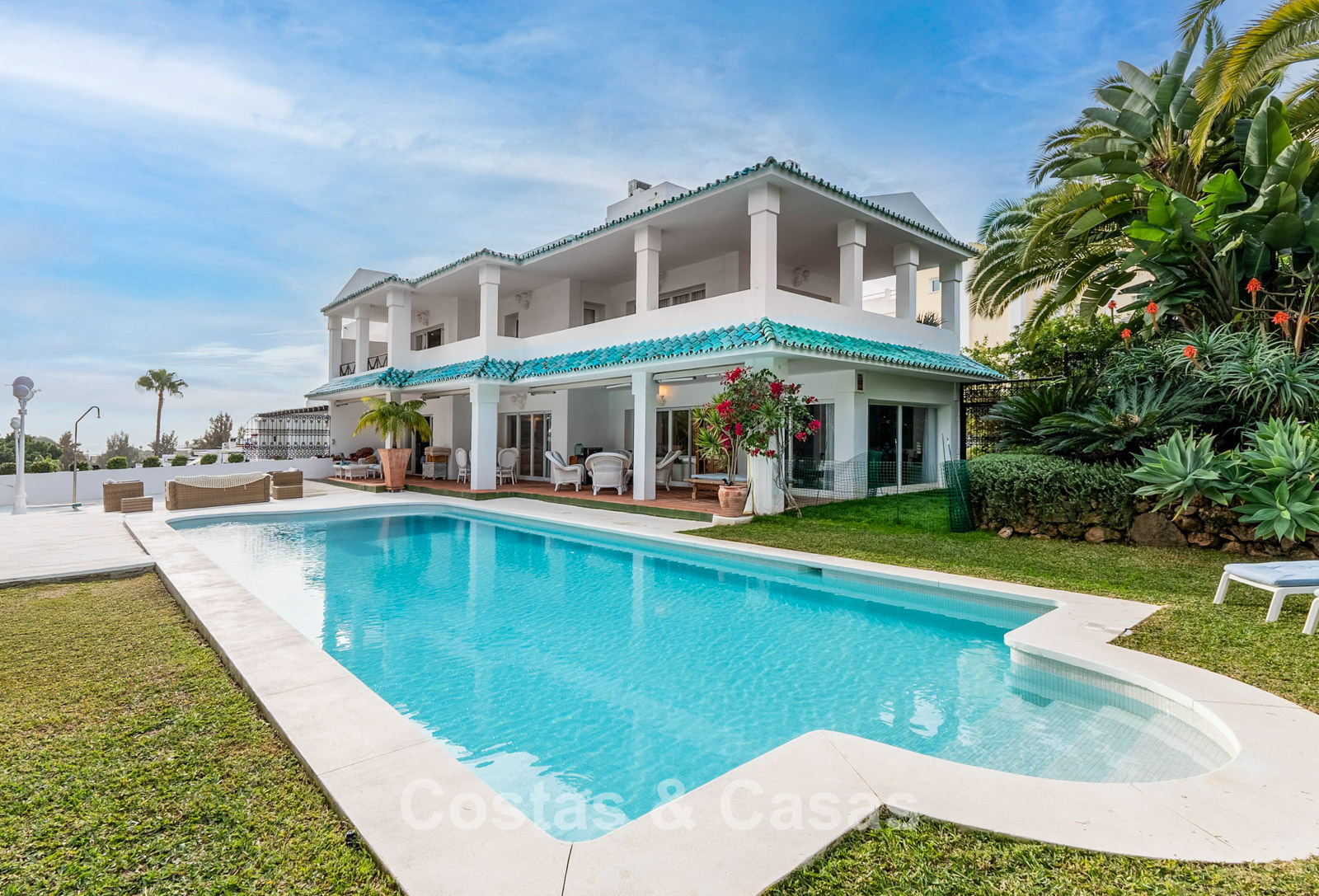 El cuidado jardín privado está completamente vallado y limita con el campo de golf. Piscina climatizada de agua salada. Las terrazas soleadas y cubiertas ofrecen mucho espacio para instalar tumbonas. La casa ofrece la posibilidad de añadir una planta extra, lo que amplía aún más el diseño y hace que la hermosa vista al mar sea aún más visible. Orientación este.