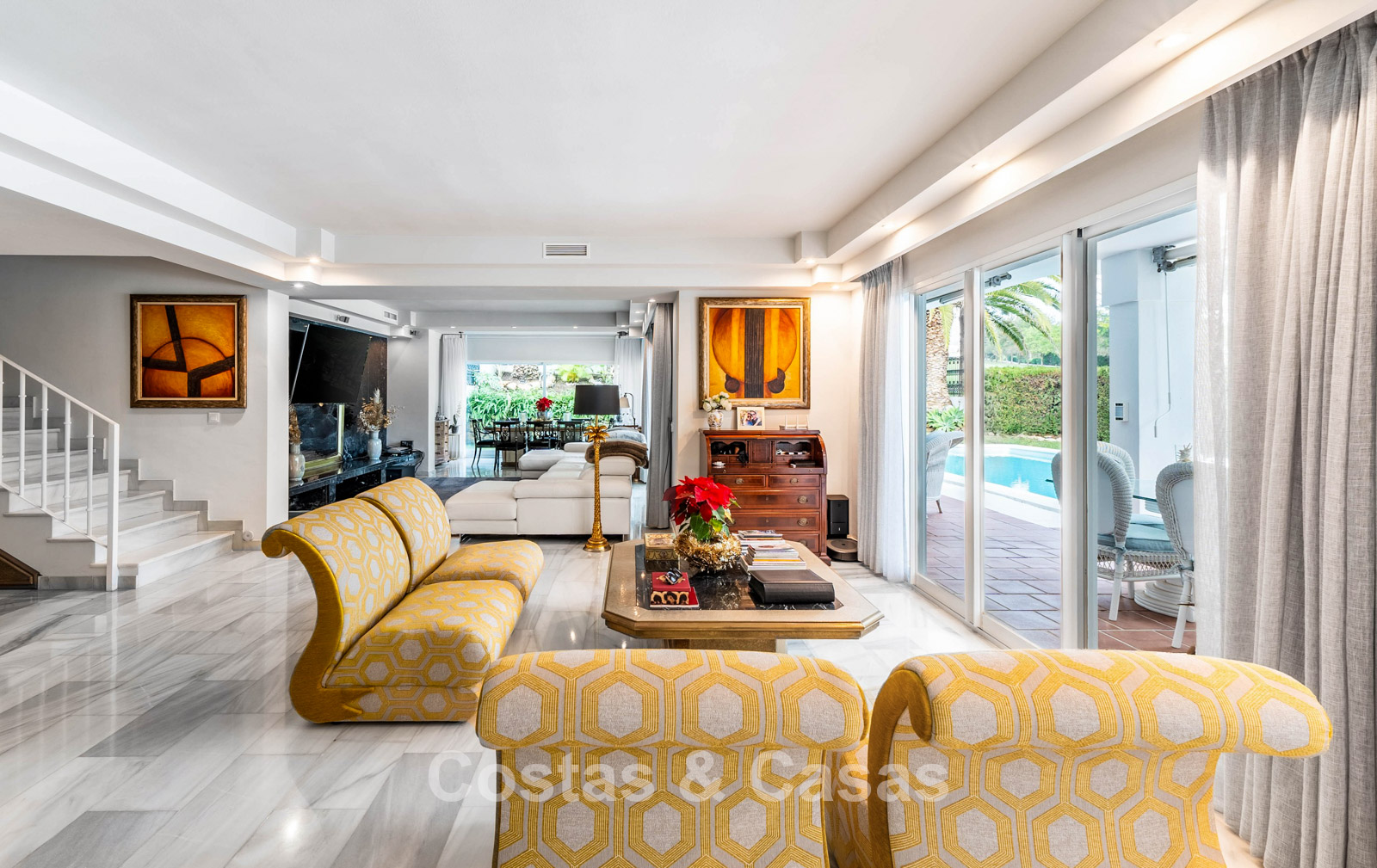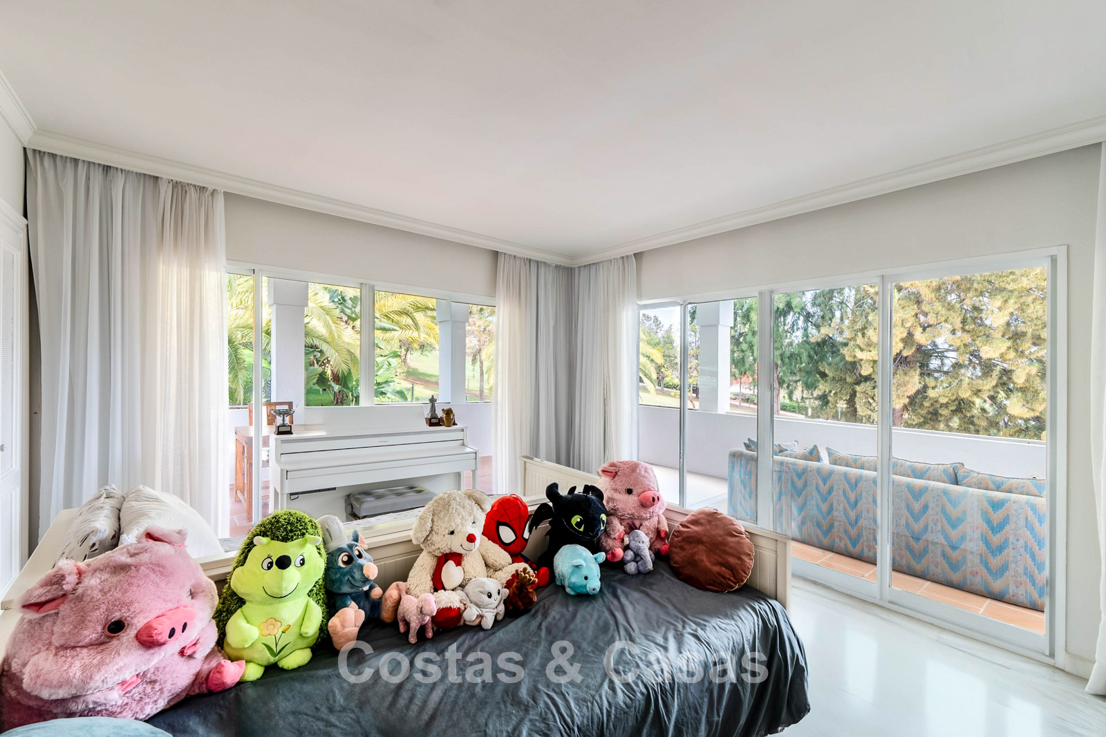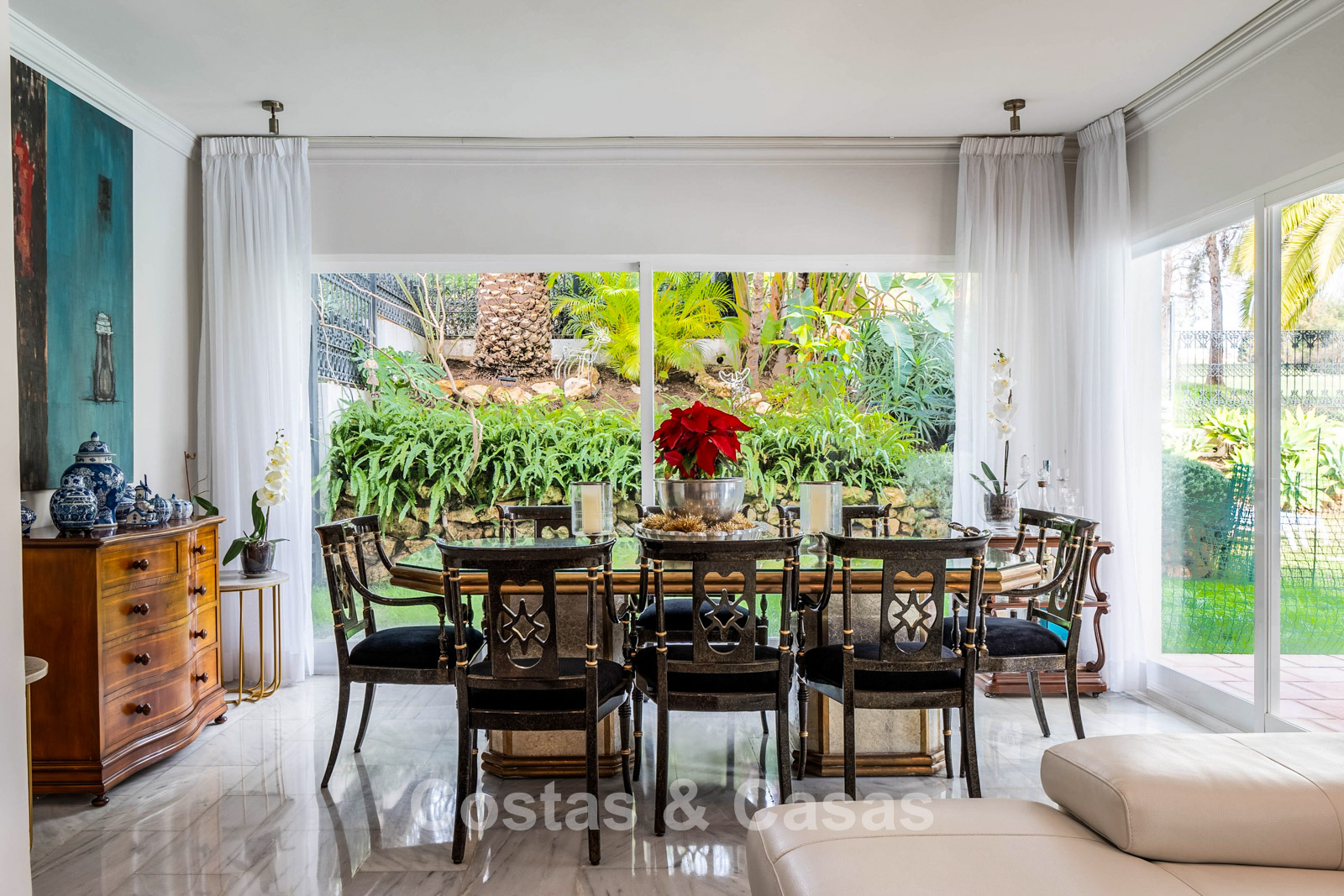 El cuidado jardín privado está completamente vallado y limita con el campo de golf. Piscina climatizada de agua salada. Las terrazas soleadas y cubiertas ofrecen mucho espacio para instalar tumbonas. La casa ofrece la posibilidad de añadir una planta extra, lo que amplía aún más el diseño y hace que la hermosa vista al mar sea aún más visible. Orientación este.
