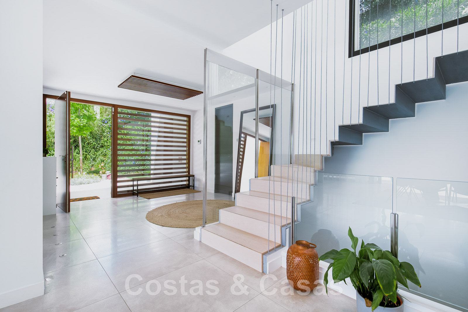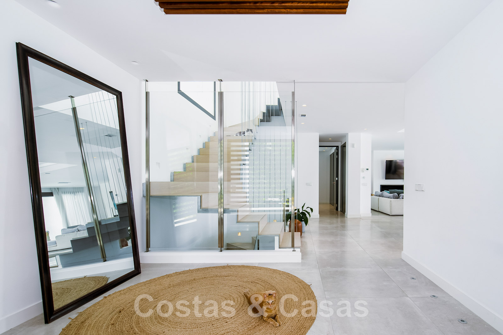 Recibidor con escaleras flotantes con barandillas de cristal.