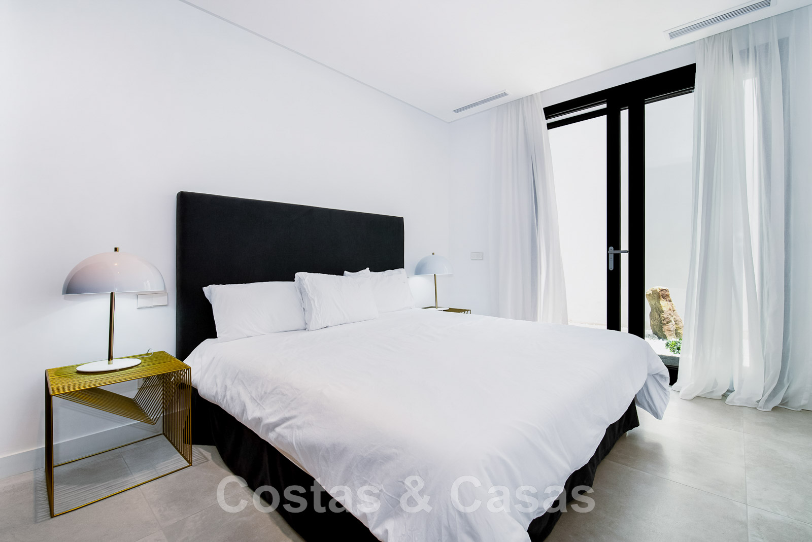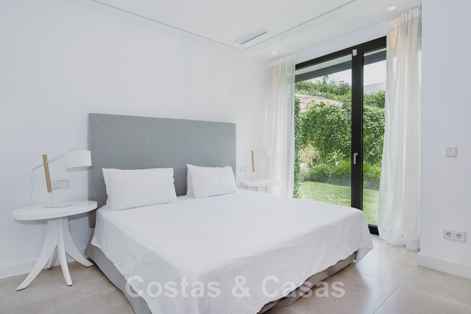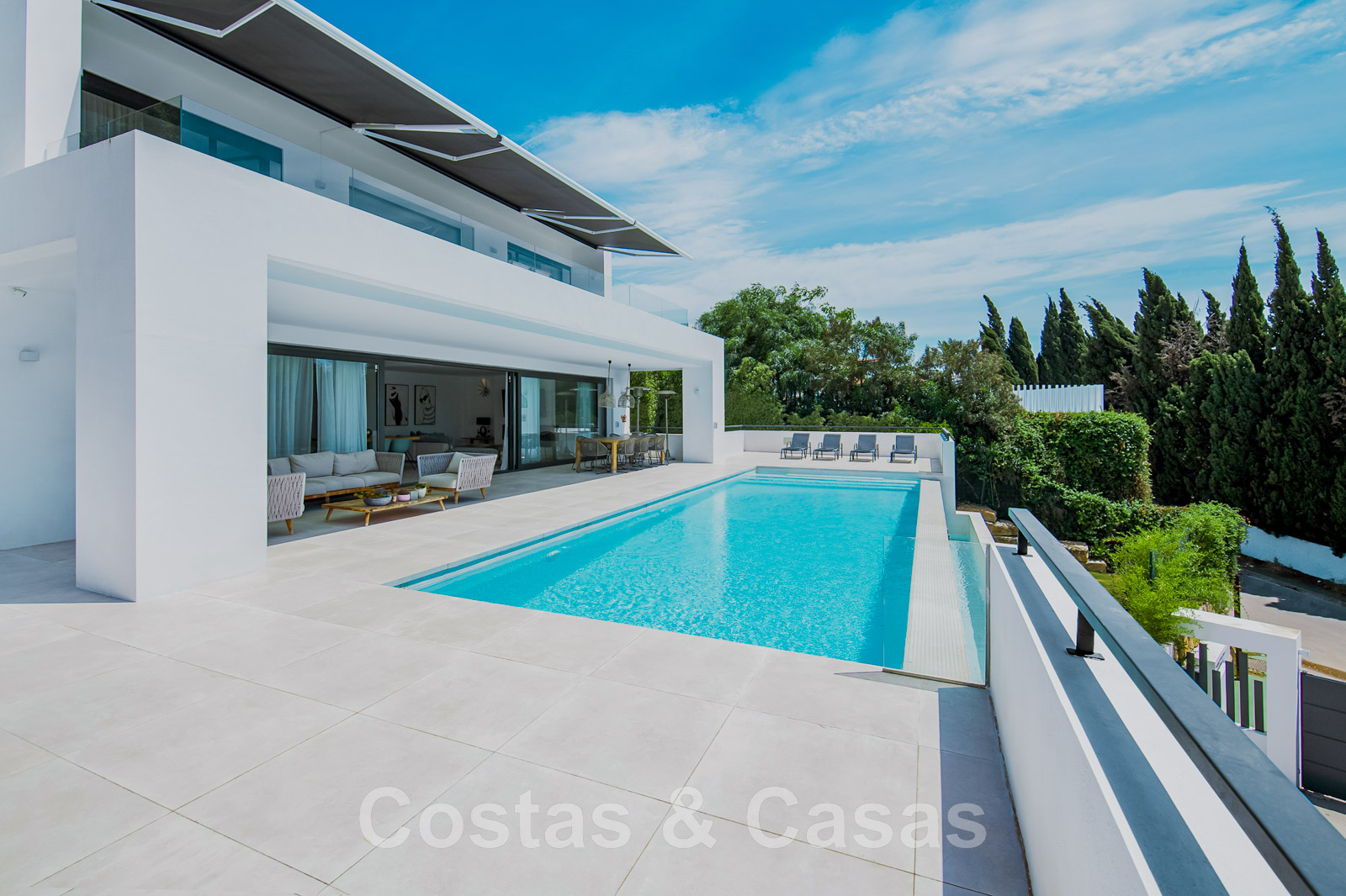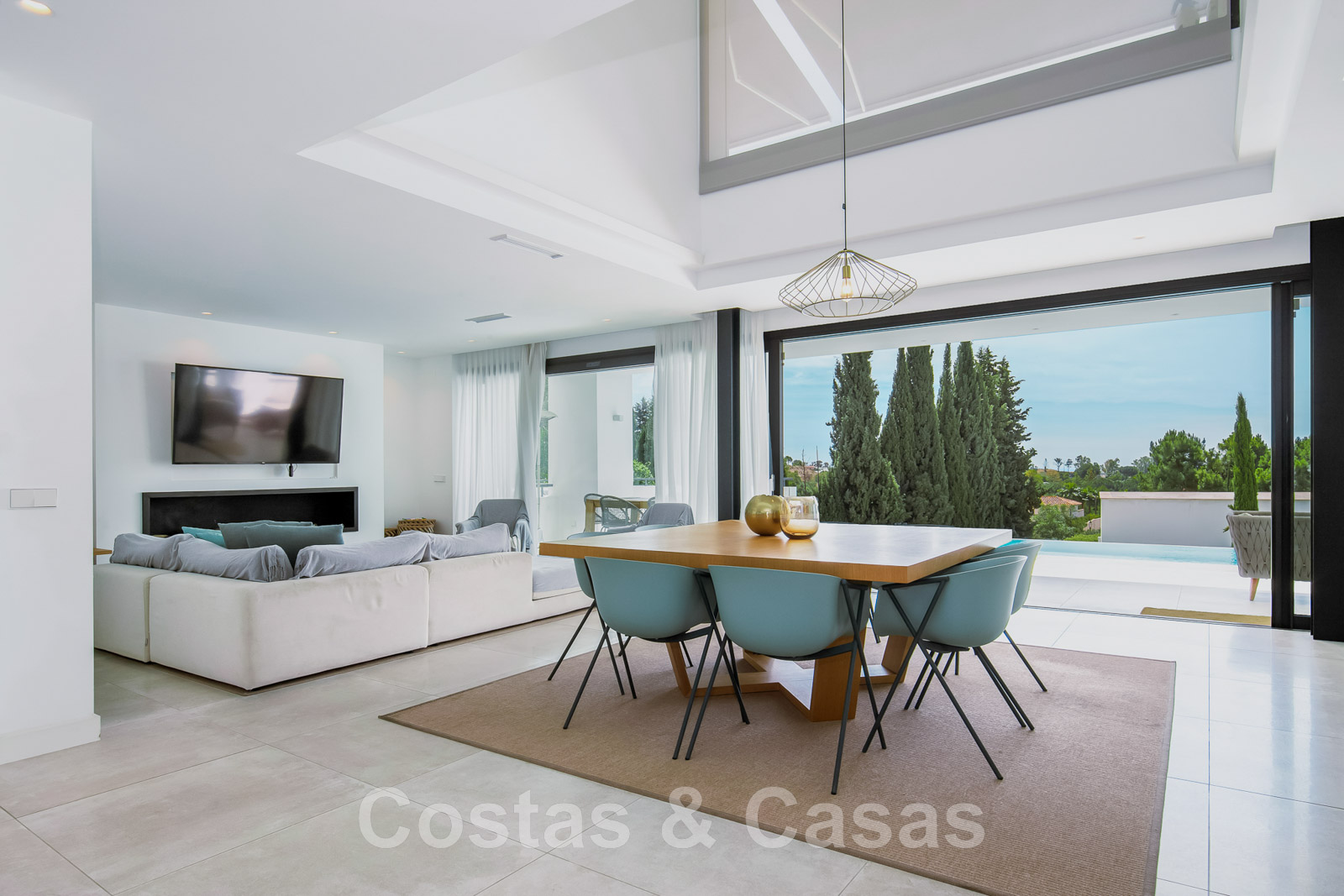 Las ventanas correderas de suelo a techo con perfiles empotrados garantizan una integración perfecta entre las zonas interiores y exteriores.