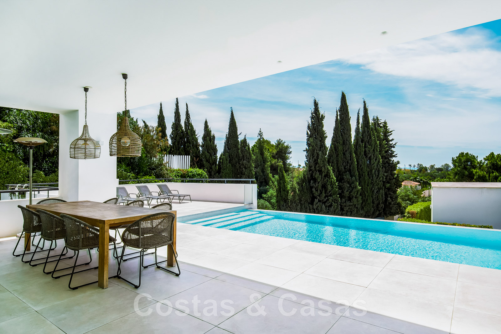 Piscina privada rodeada de terraza con tumbonas.