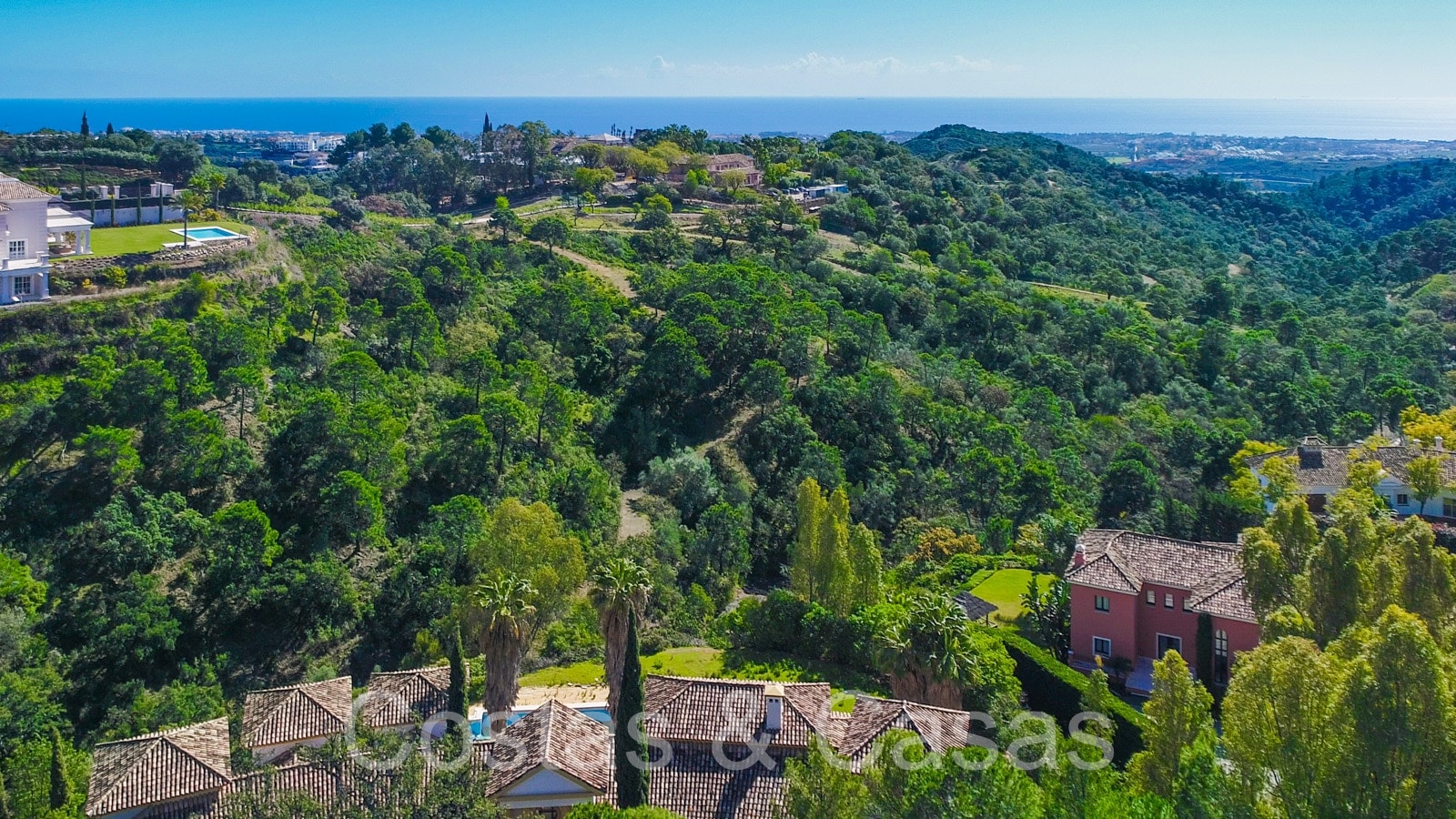 Parcela espaciosa y protegida ubicada en una posición elevada, con vistas a las otras villas de abajo. Orientación sur. Paisajismo bien cuidado con palmeras, césped y plantas autóctonas. Gran piscina infinita climatizada (192 m2) con zona de relax. Amplias y acogedoras zonas exteriores para disfrutar del clima mediterráneo. Zona de barbacoa. Impresionantes vistas de los pintorescos alrededores, desde el mar Mediterráneo hasta el Estrecho de Gibraltar.