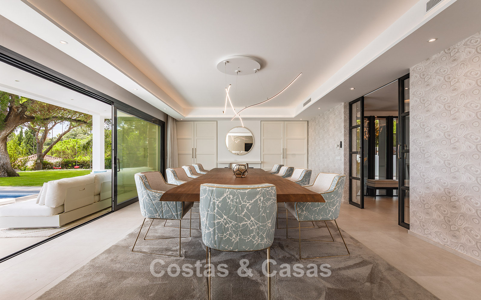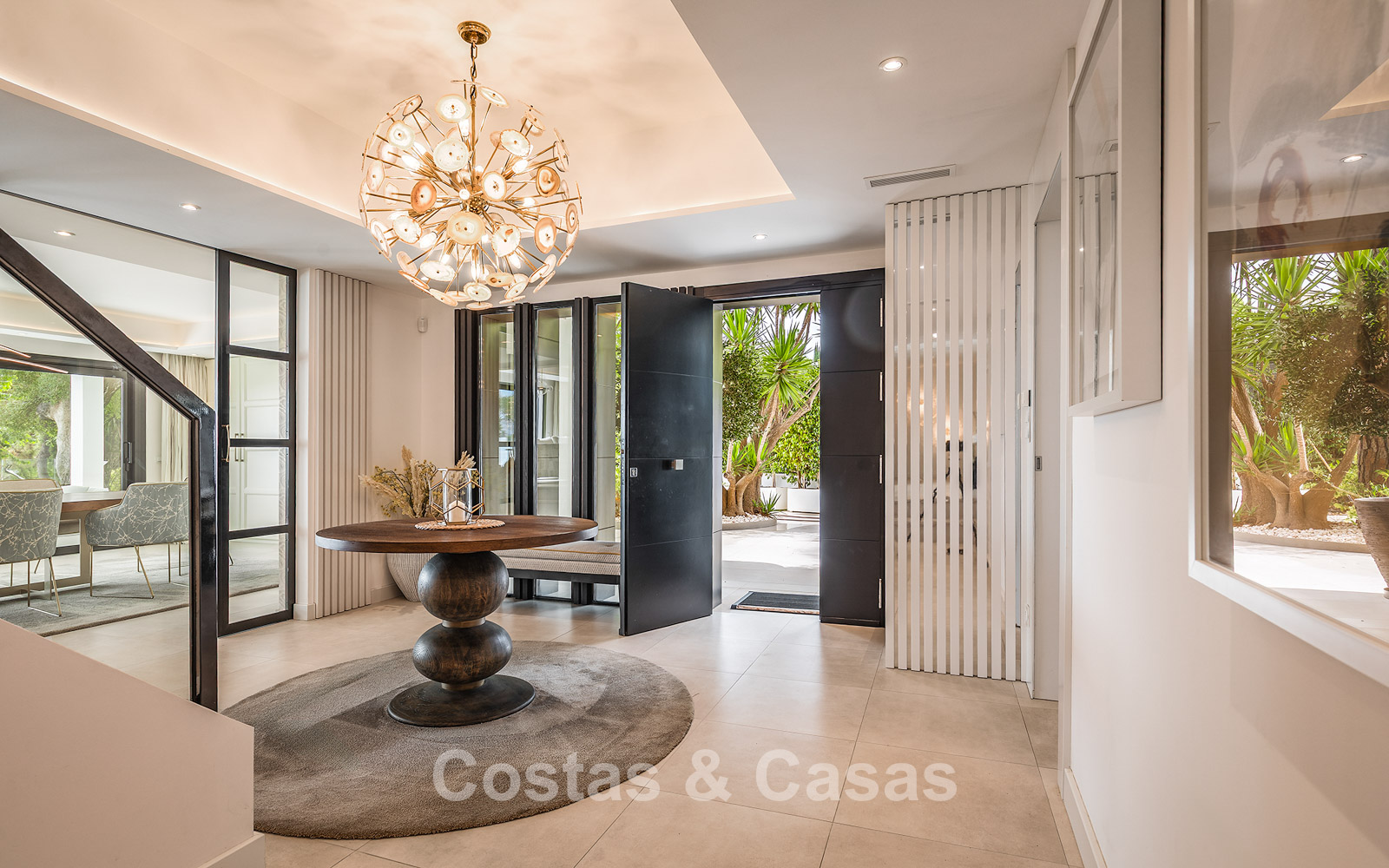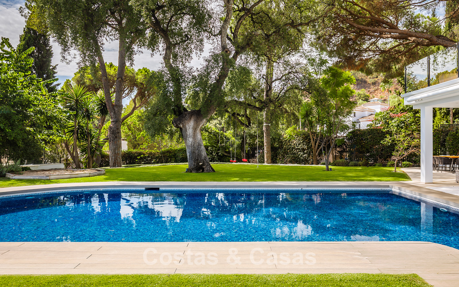 Moderna villa independiente con un diseño de influencias mediterráneas. Totalmente modernizada con materiales de lujo. Grandes ventanales correderos con marcos empotrados proporcionan abundante luz natural y realzan la sensación de amplitud. El interior combina un estilo contemporáneo con una sensación de tranquilidad, caracterizado por tonos cálidos, líneas armoniosas y materiales de primera calidad. Amplia sala de estar de planta abierta. Junto a ella se encuentra un comedor formal con una mesa para 10 personas. La cocina, construida a medida, está equipada con armarios de suelo a techo, electrodomésticos Miele, una elegante isla central y una mesa de comedor. En total, cuenta con ocho dormitorios, siete baños y un aseo. En la planta superior se encuentra la suite principal, con baño, vestidor y terraza privada con impresionantes vistas. Una casa de invitados independiente, distribuida en dos plantas, ofrece tres dormitorios, tres baños, cocina y sala de estar, perfecta para ofrecer a los huéspedes o al personal un espacio privado. Suelos de baldosas de alta calidad en color crema. Lavadero. Trastero. Garaje integrado + 2 plazas de aparcamiento cubiertas.