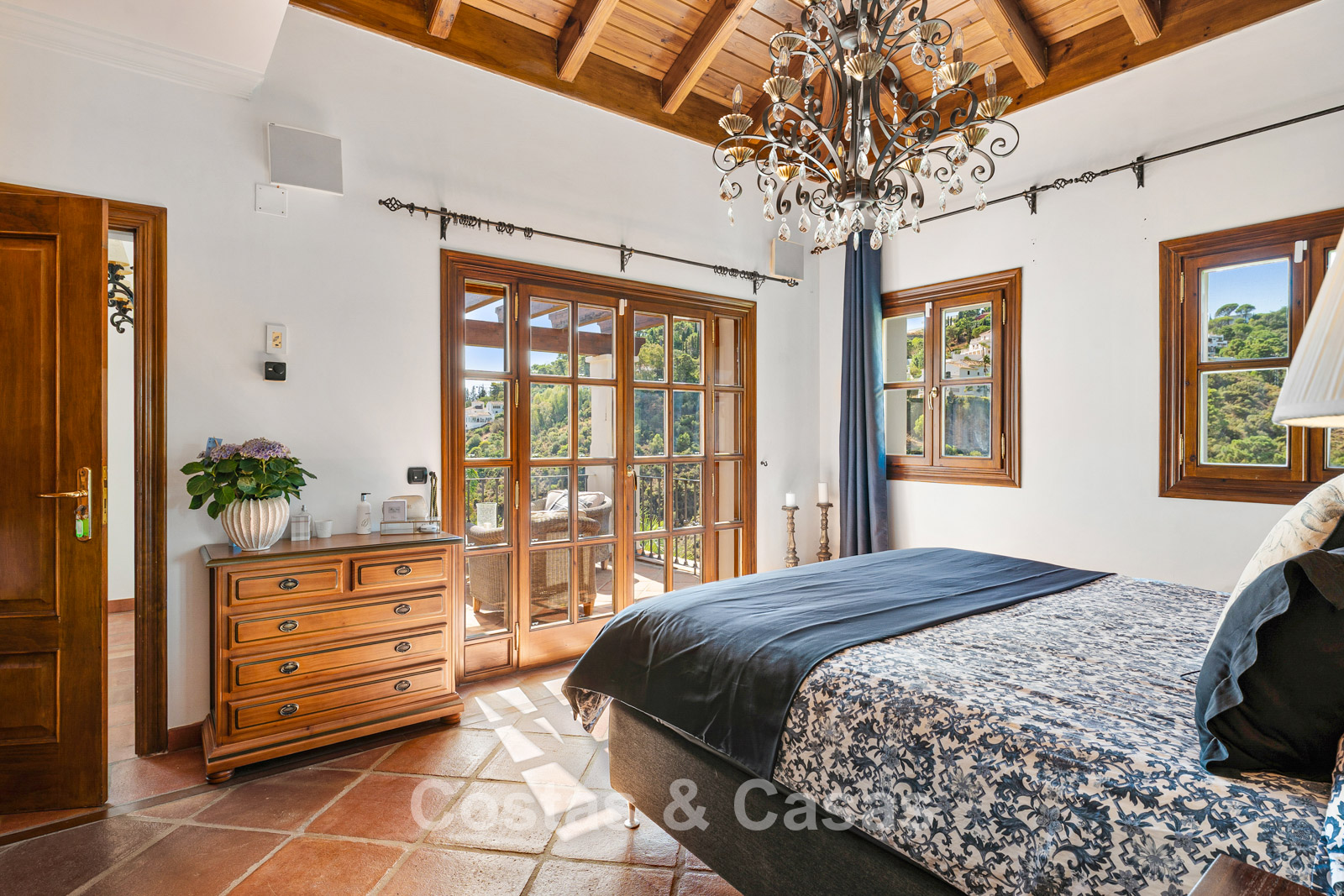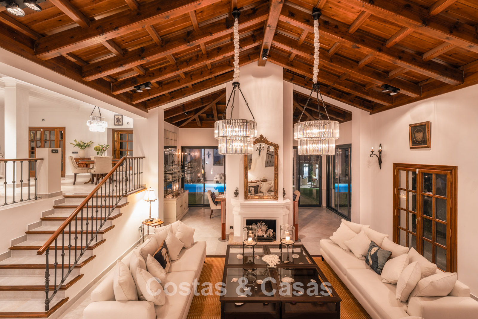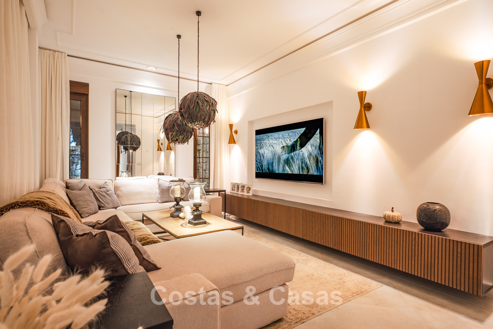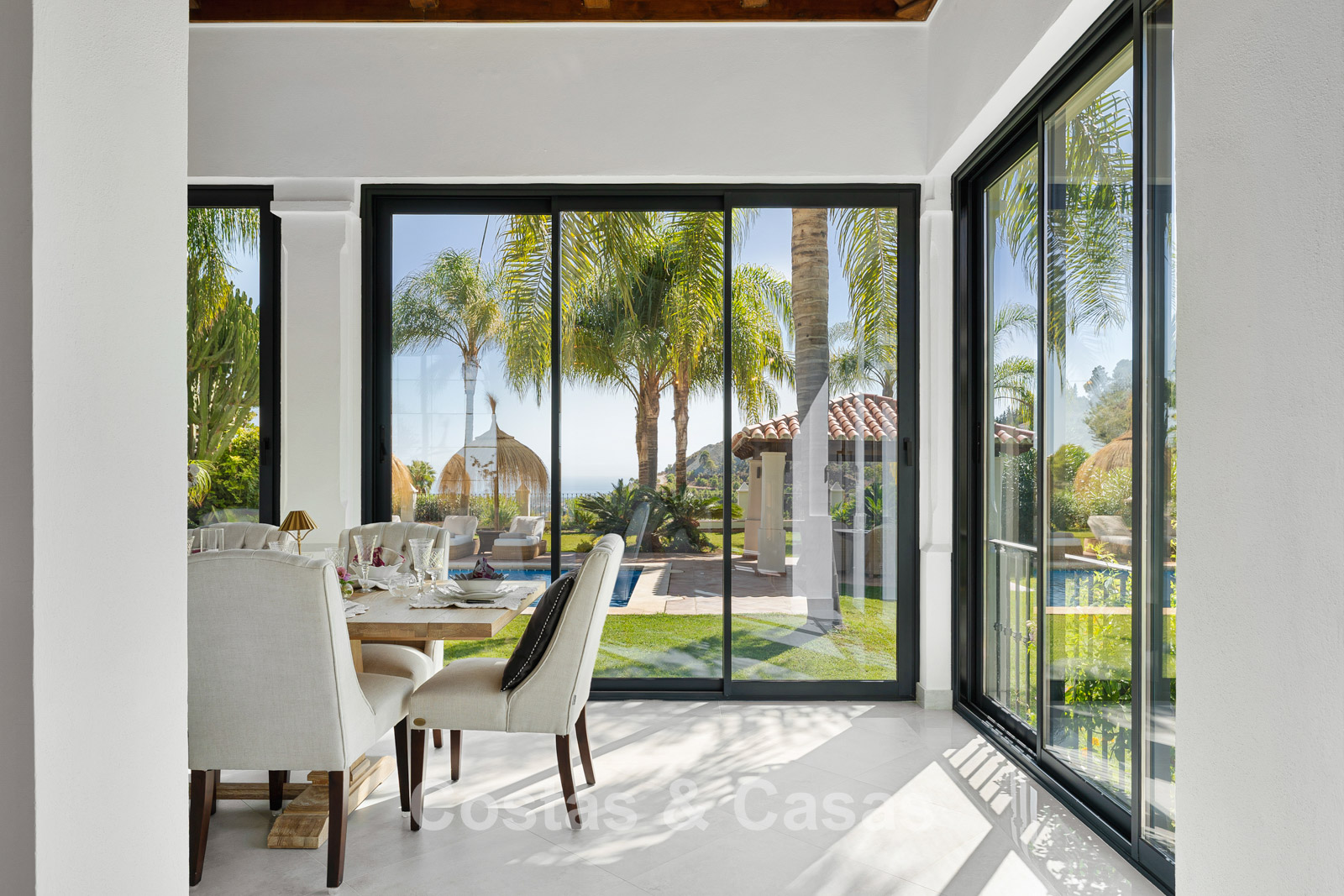 La villa conserva un auténtico carácter andaluz y fue completamente renovada en 2024. La vivienda se distribuye en dos plantas cuidadosamente diseñadas, utilizando materiales de alta calidad que aportan una atmósfera cálida y lujosa. El interior es especialmente luminoso gracias a sus amplios ventanales y a su distribución abierta y fluida. El elegante salón de estilo mediterráneo combina un impresionante techo inclinado de madera con paredes encaladas de estilo rústico, realzadas por arcos clásicos y detalles en hierro forjado. La cocina moderna, totalmente equipada con electrodomésticos de Gaggenau y con isla central, conecta directamente con el comedor. Los cuatro dormitorios disponen de su propio baño en suite de lujo para garantizar el máximo confort. Un aseo de cortesía está convenientemente situado junto al hall de entrada. La planta inferior ofrece espacios adicionales, incluyendo una sala de cine en casa que puede transformarse fácilmente en un dormitorio adicional o gimnasio. Un trastero para almacenamiento extra. La propiedad dispone de amplio aparcamiento privado para varios vehículos.
