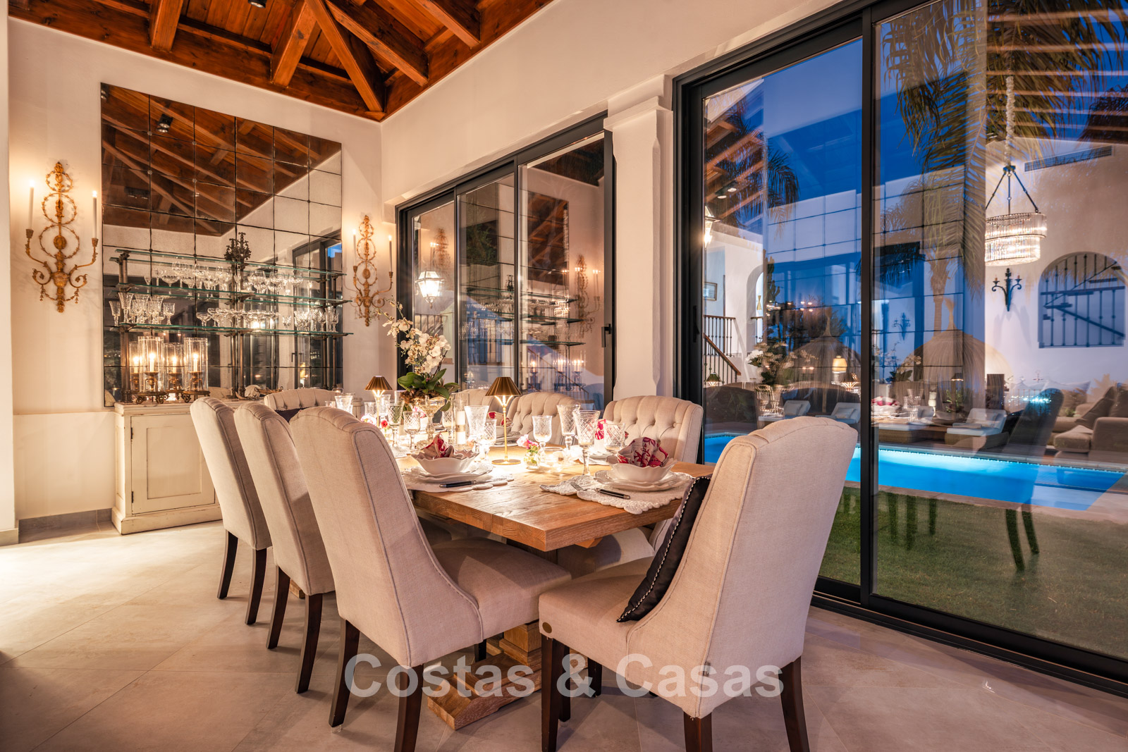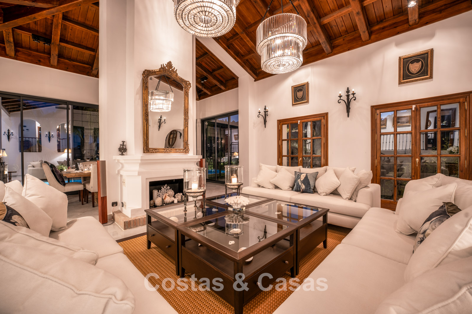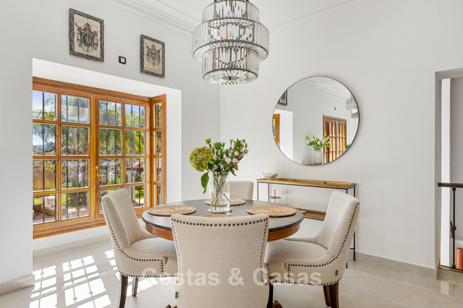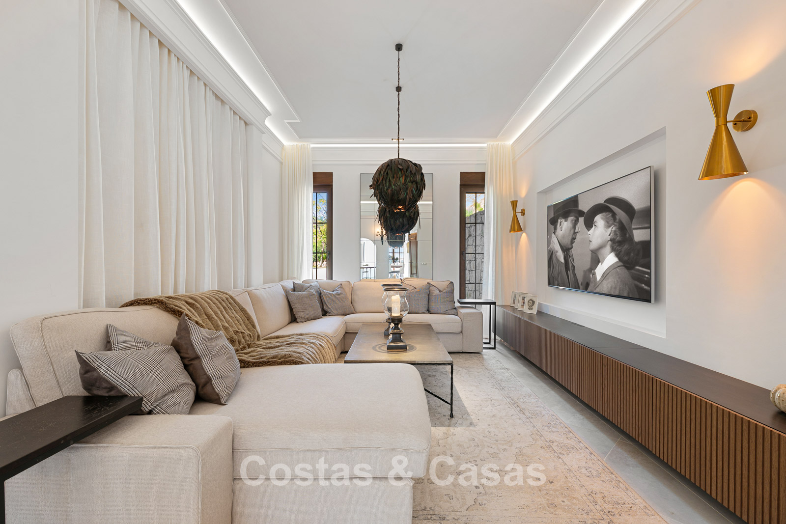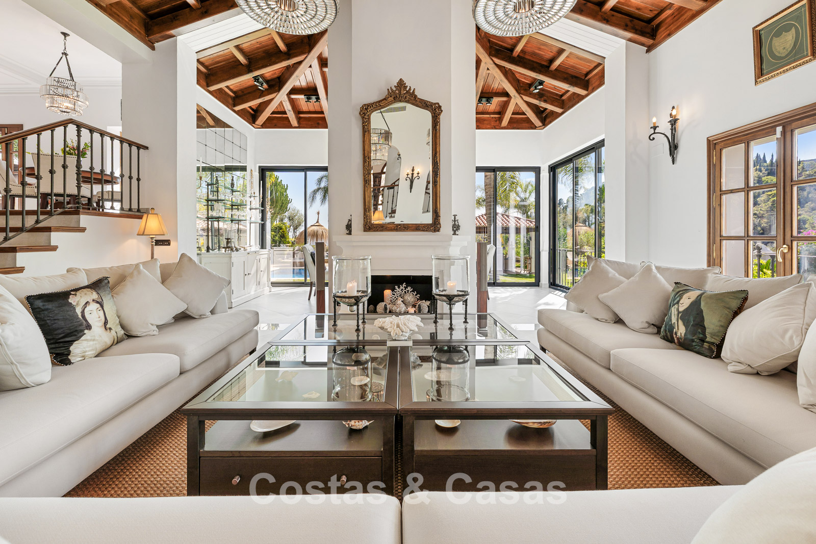 La villa conserva un auténtico carácter andaluz y fue completamente renovada en 2024. La vivienda se distribuye en dos plantas cuidadosamente diseñadas, utilizando materiales de alta calidad que aportan una atmósfera cálida y lujosa. El interior es especialmente luminoso gracias a sus amplios ventanales y a su distribución abierta y fluida. El elegante salón de estilo mediterráneo combina un impresionante techo inclinado de madera con paredes encaladas de estilo rústico, realzadas por arcos clásicos y detalles en hierro forjado. La cocina moderna, totalmente equipada con electrodomésticos de Gaggenau y con isla central, conecta directamente con el comedor. Los cuatro dormitorios disponen de su propio baño en suite de lujo para garantizar el máximo confort. Un aseo de cortesía está convenientemente situado junto al hall de entrada. La planta inferior ofrece espacios adicionales, incluyendo una sala de cine en casa que puede transformarse fácilmente en un dormitorio adicional o gimnasio. Un trastero para almacenamiento extra. La propiedad dispone de amplio aparcamiento privado para varios vehículos.