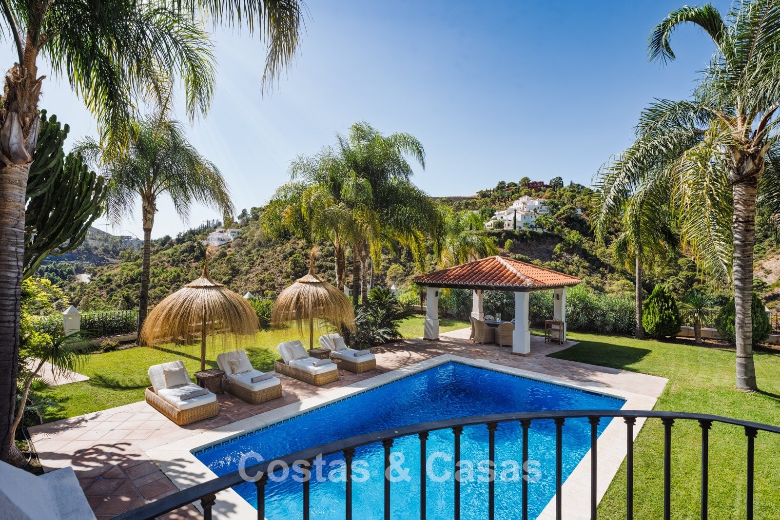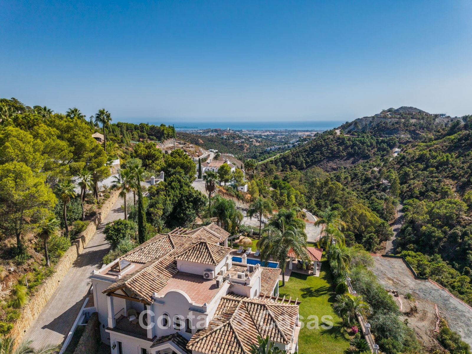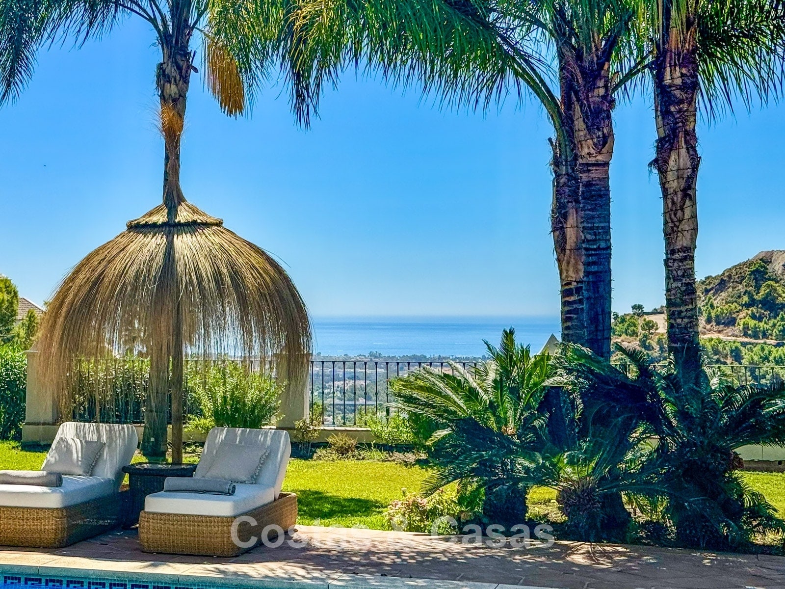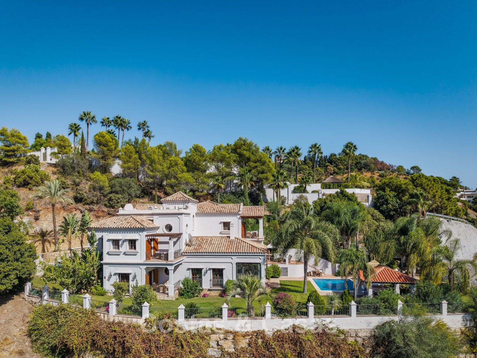 La amplia parcela de más de 5.300 m², en posición elevada, ofrece un oasis de paz y total privacidad. Además, presenta un extraordinario potencial para futuras ampliaciones o proyectos de renovación. La zona exterior es un auténtico paraíso mediterráneo con un jardín maduro que cuenta con más de 50 palmeras, jacarandas, limoneros y naranjos. La gran piscina privada invita al relax y está rodeada de amplias terrazas soleadas. Gracias a su perfecta orientación sur a suroeste, la villa disfruta de luz natural durante todo el día y de espectaculares puestas de sol. Las vistas son realmente impresionantes, extendiéndose sobre el valle verde hasta el mar Mediterráneo.