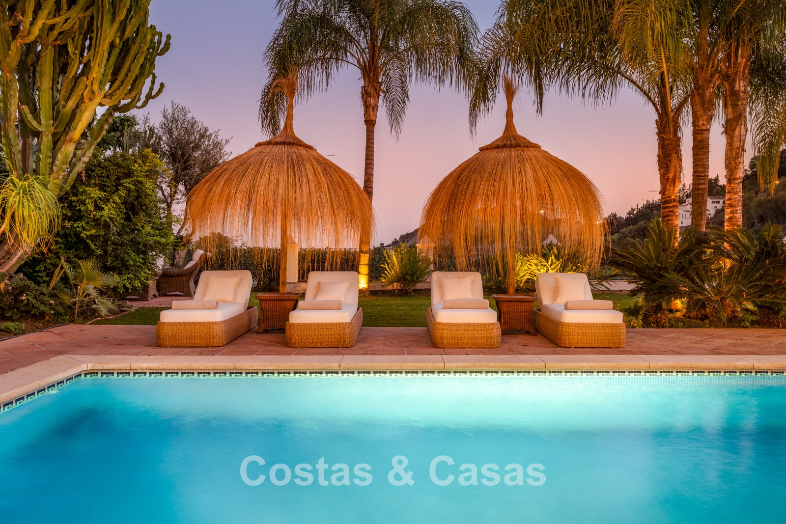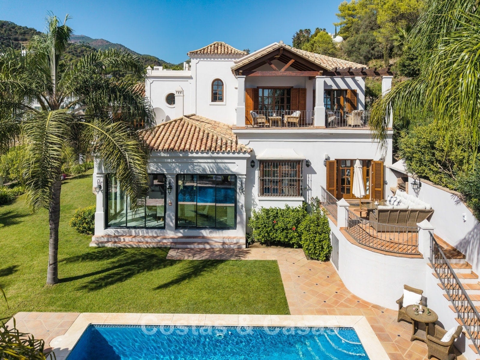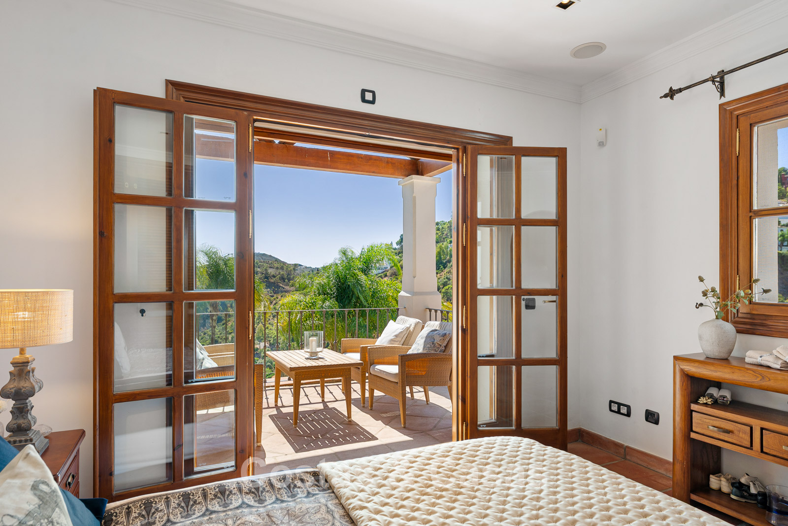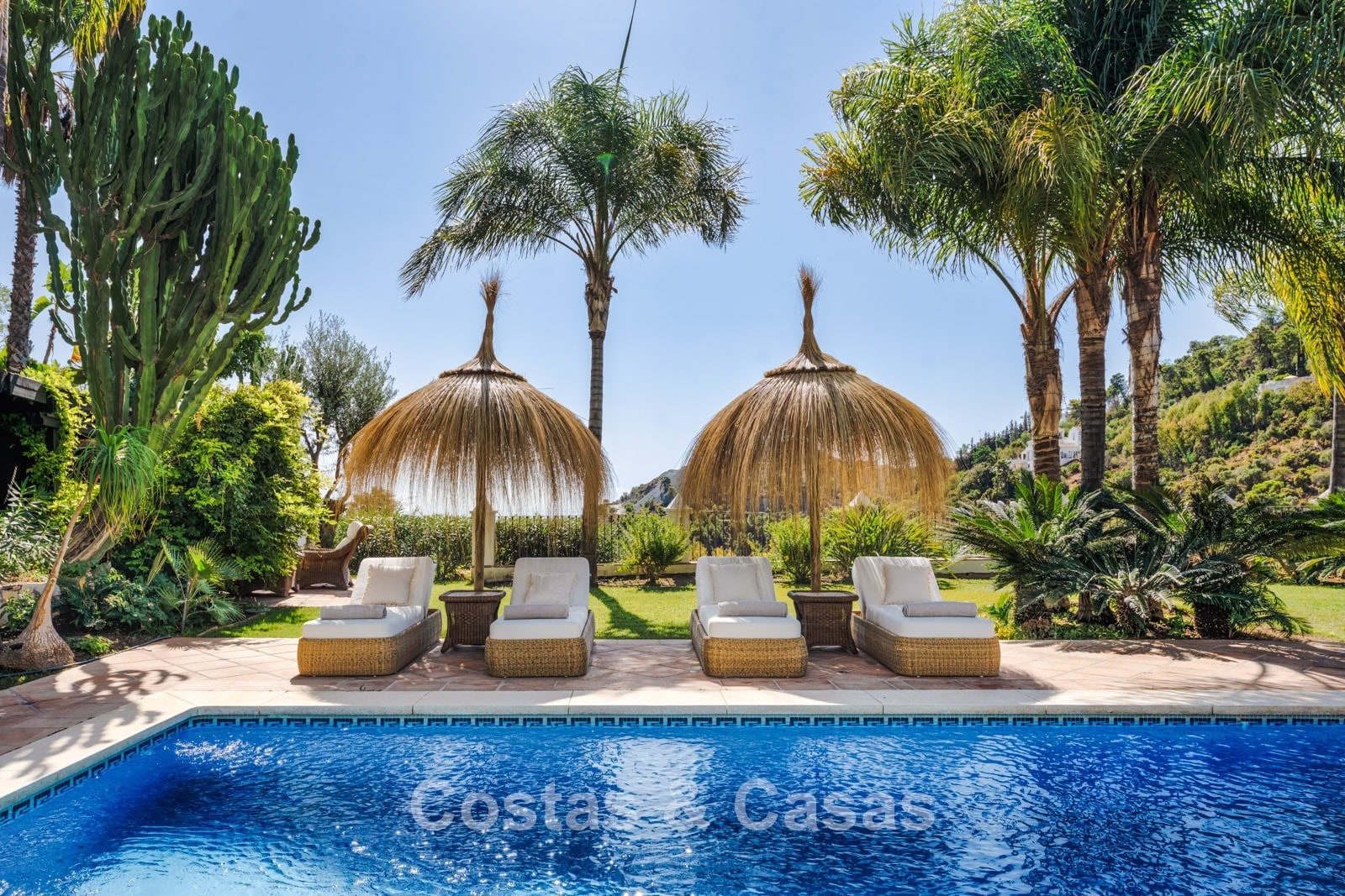 La amplia parcela de más de 5.300 m², en posición elevada, ofrece un oasis de paz y total privacidad. Además, presenta un extraordinario potencial para futuras ampliaciones o proyectos de renovación. La zona exterior es un auténtico paraíso mediterráneo con un jardín maduro que cuenta con más de 50 palmeras, jacarandas, limoneros y naranjos. La gran piscina privada invita al relax y está rodeada de amplias terrazas soleadas. Gracias a su perfecta orientación sur a suroeste, la villa disfruta de luz natural durante todo el día y de espectaculares puestas de sol. Las vistas son realmente impresionantes, extendiéndose sobre el valle verde hasta el mar Mediterráneo.